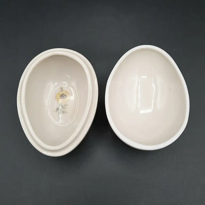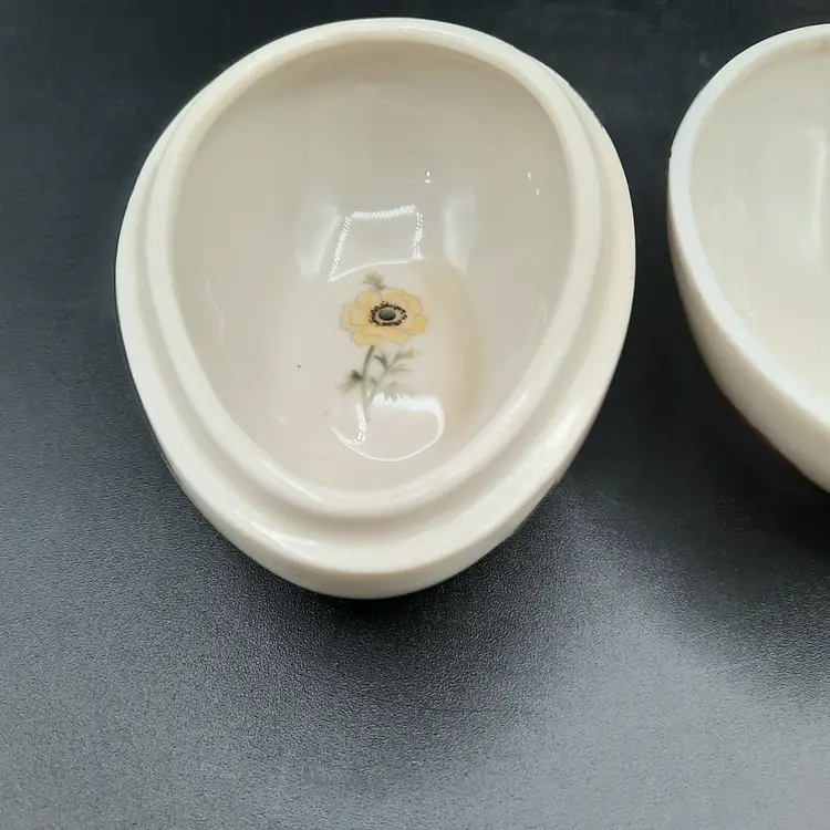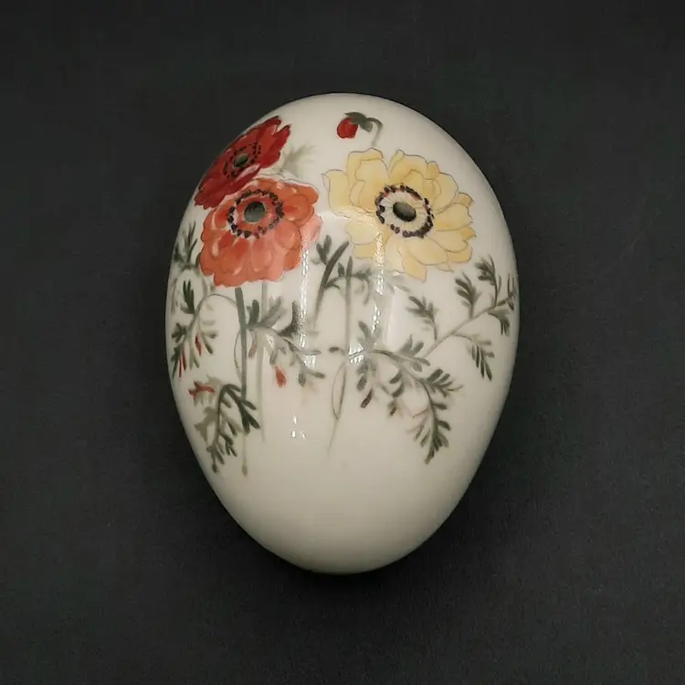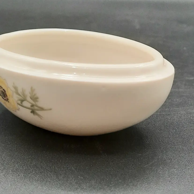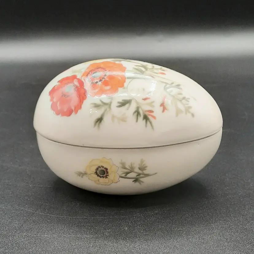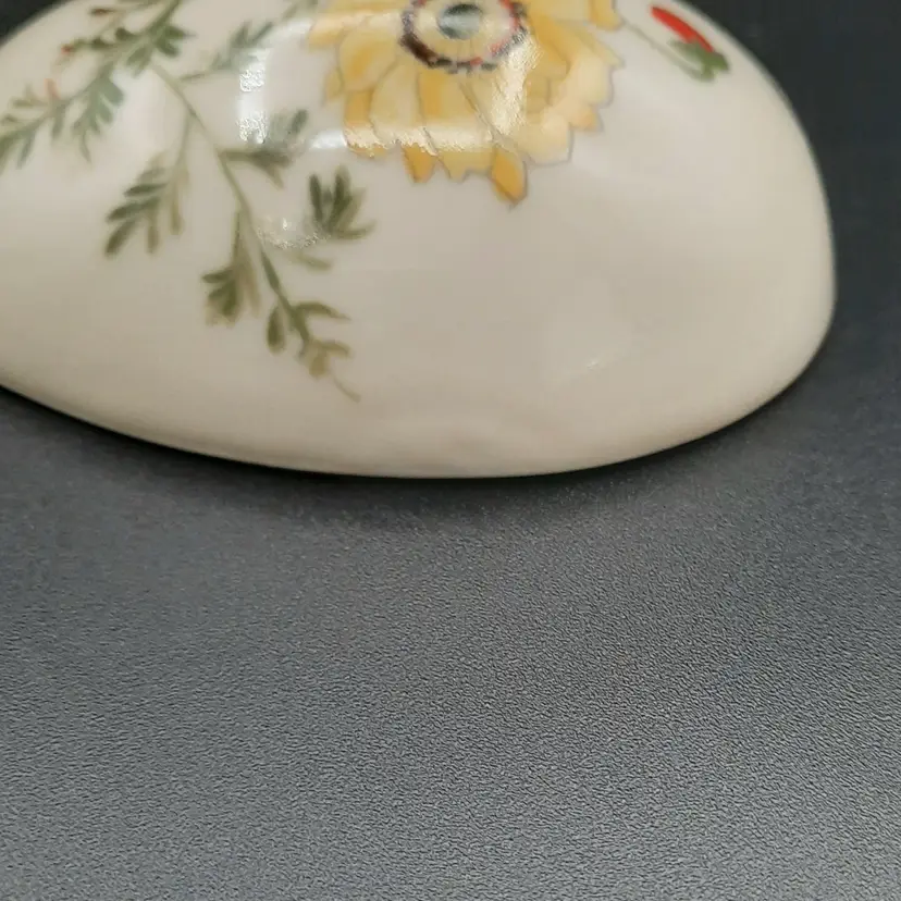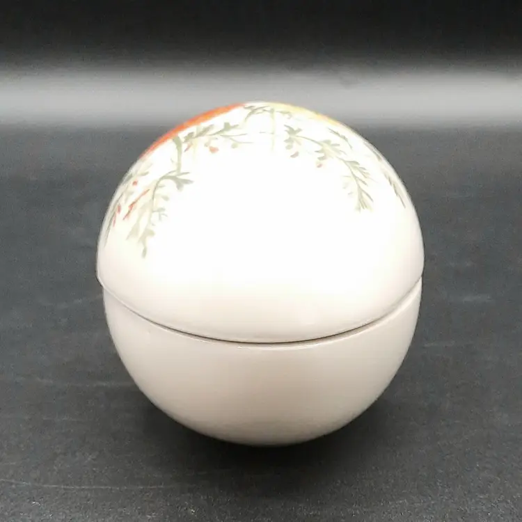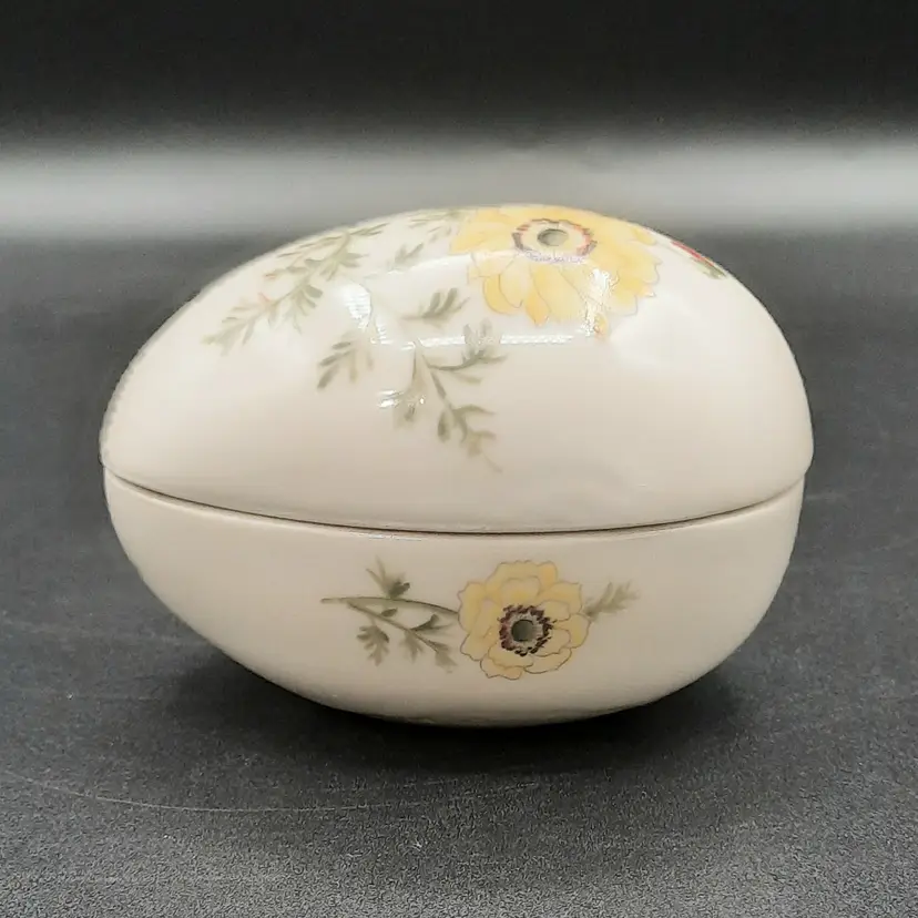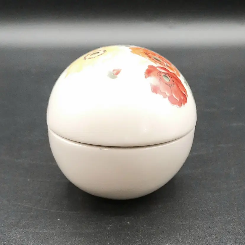 Pretty bright flowers on this trinket box measuring 2 3/4"H x 3 3/4"L x 2 3/4"W, overall good condition with some dark spots inside lid, a pinhole and some rippling in finish on the base and area on edge of lid