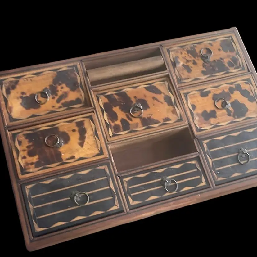 early 19th-century faux tortoise shell inlaid jewelry or sewing box, possibly of Ceylonese (Sri Lankan) or Indo-Portuguese origin. Key Features Material & Decoration: The box features faux tortoise shell panels decorated with intricate marquetry or string inlays. Design: It contains a fitted tray with multiple small drawers and open compartments, a style often seen in Calamander or Coromandel wood sewing boxes from the 1800s.