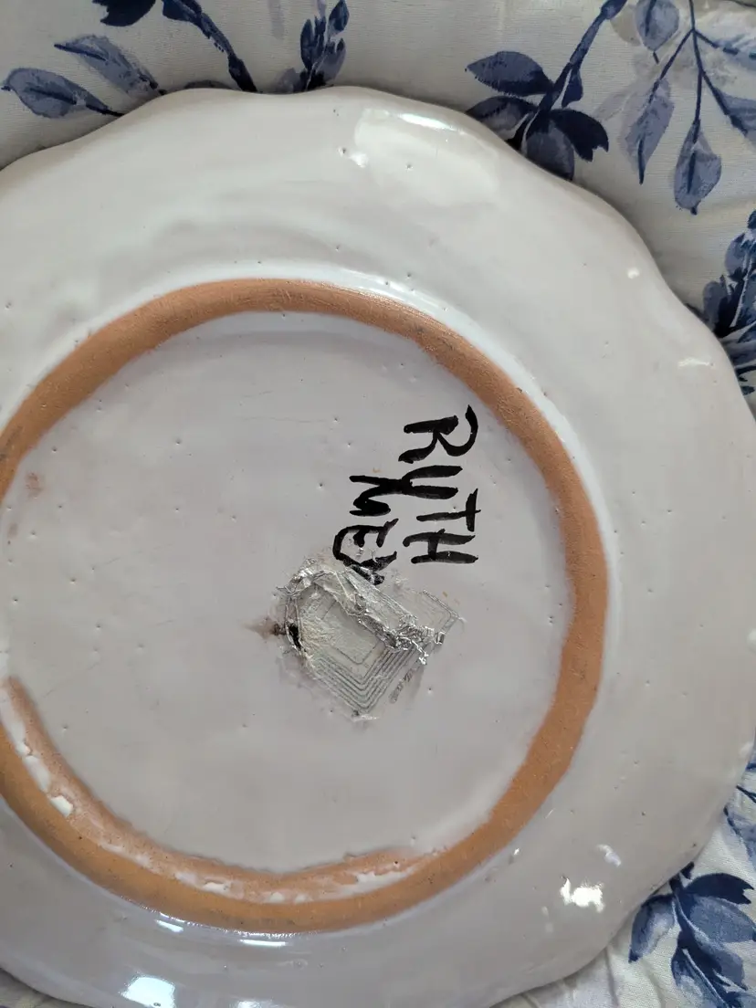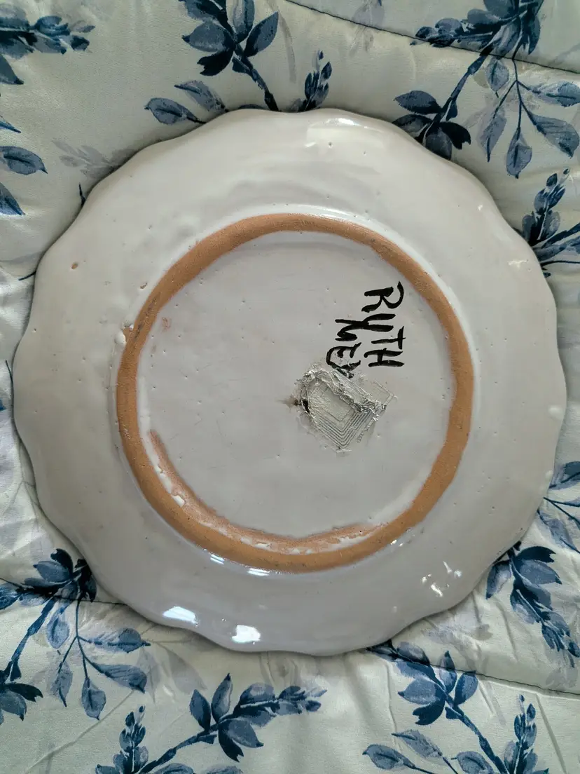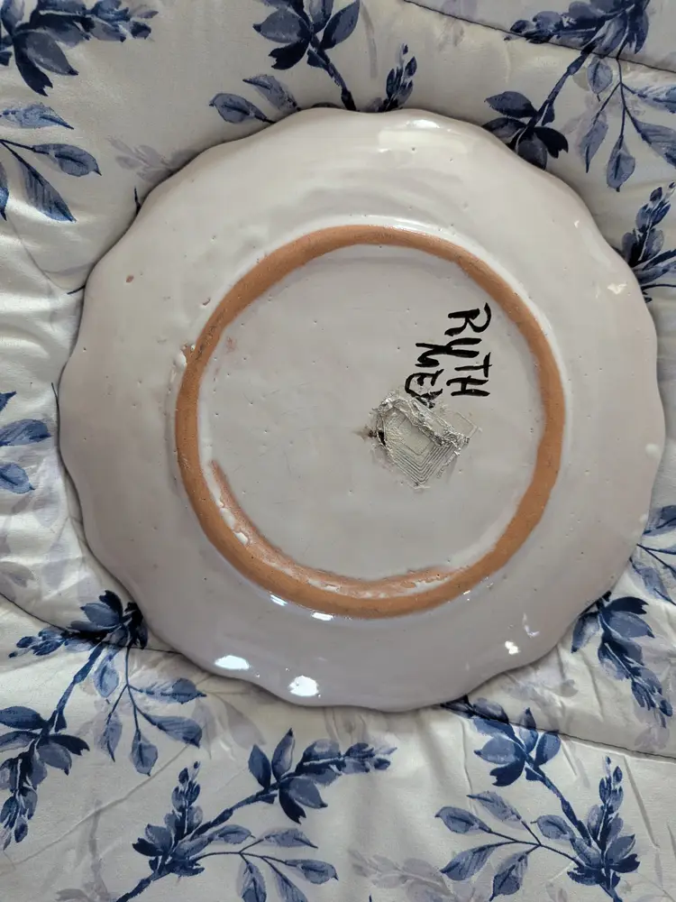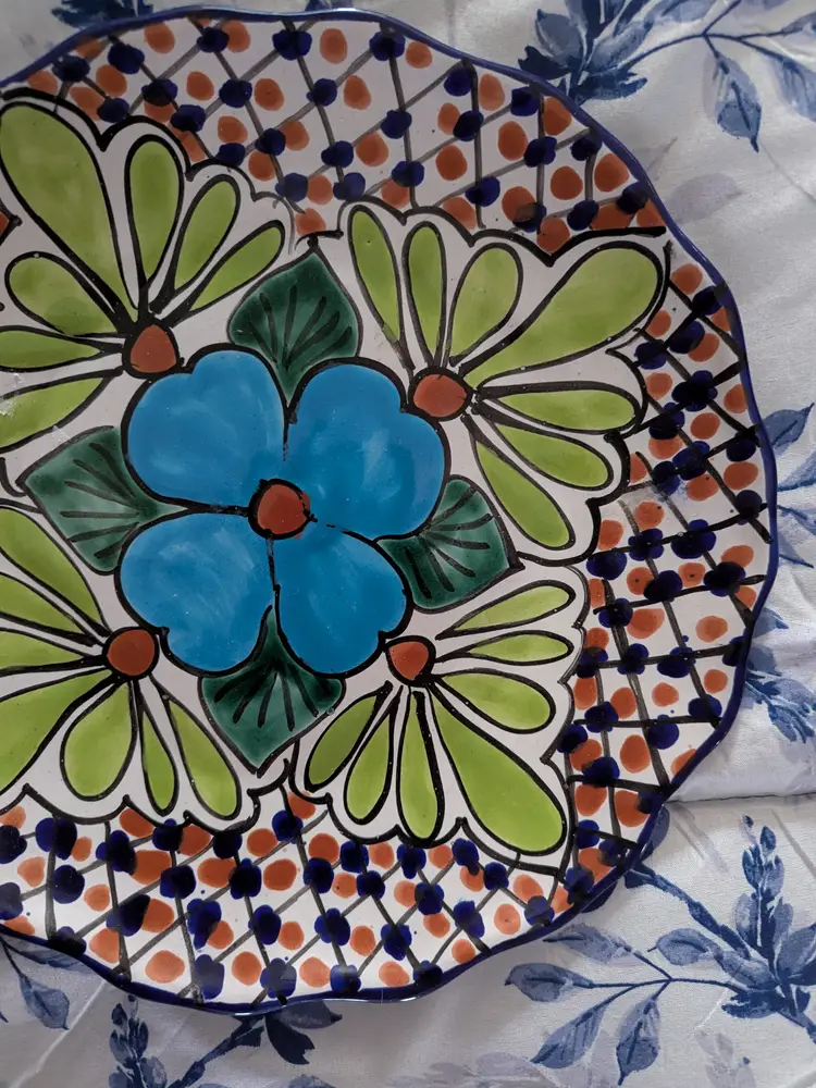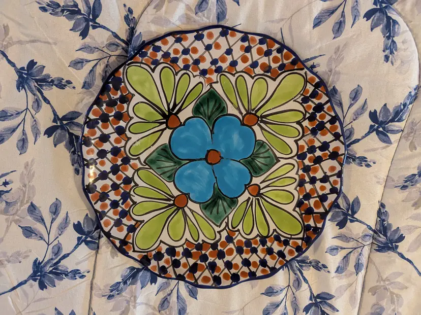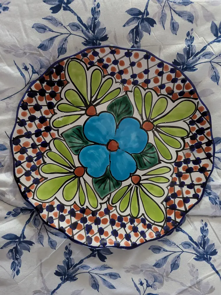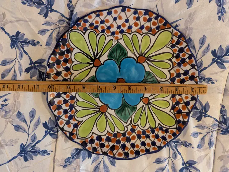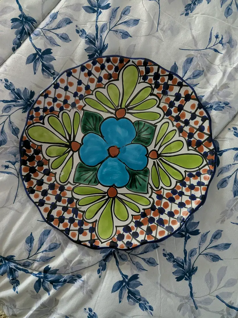 Talavera Blue Flower T Ruth Signed Wall Plate Mexico Folk Art Pottery 11" Very colorful Green leaves and scalloped edge Boho Great condition Clean with no damage.no chips or cracks no weird smells. Please check the photos for details. Comes from a smoke free home. We do have pets.