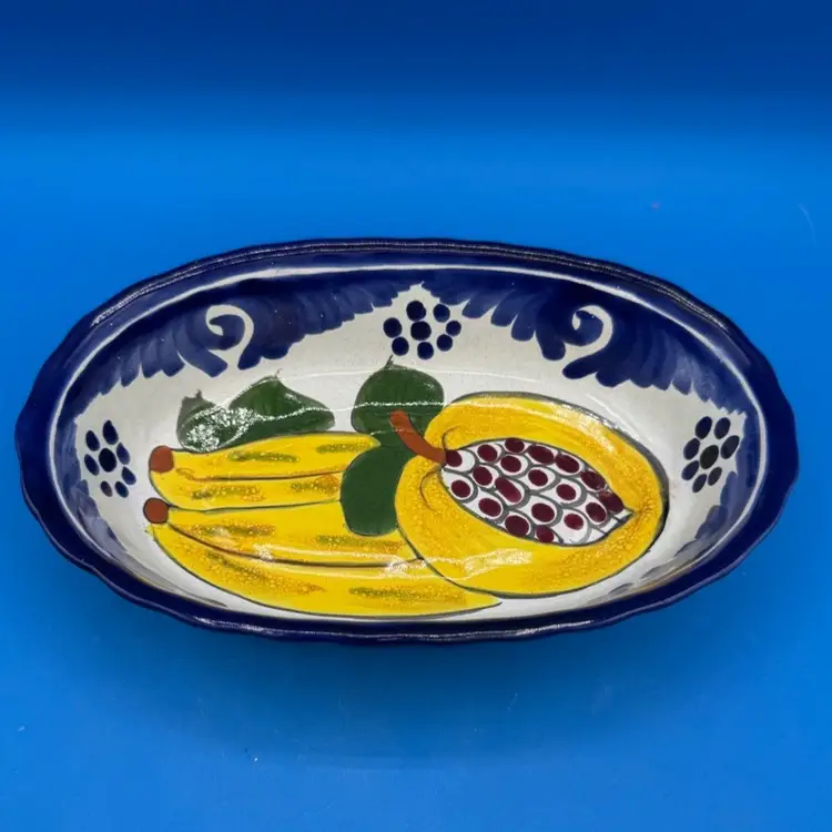 Gorgeous Talavera dish with fruits on a cobalt background. It measures 4 3/4 inches wide and 7 3/4 inches long. It’s in good condition with no chips or cracks. Original sticker attached.
