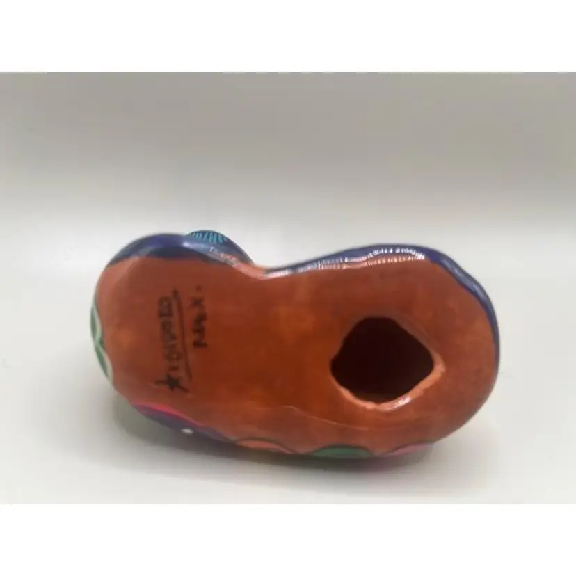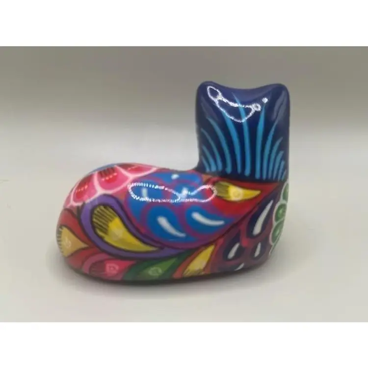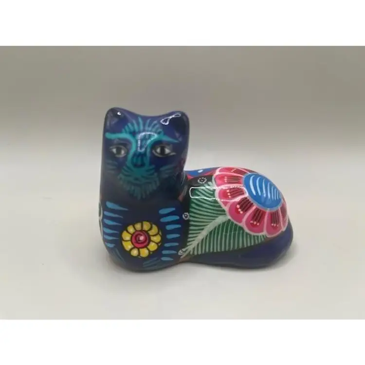 Add a splash of color to your space with this eye-catching hand-painted cat figurine. Boasting a vibrant folk art design, this piece is a delightful addition to any cat lover's collection or as a whimsical accent in your home. Condition: Excellent condition with vivid colors and intricate details. Size: Approximately 2.5 inches tall, 3.25 inches long.