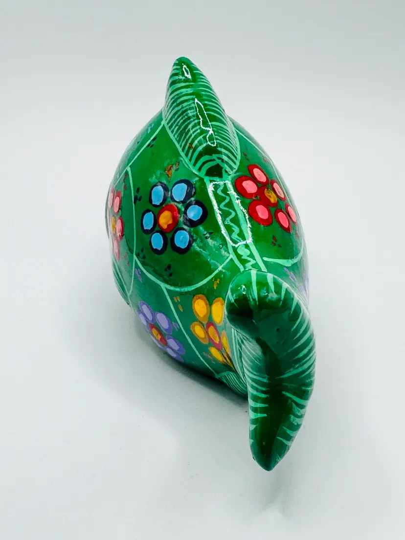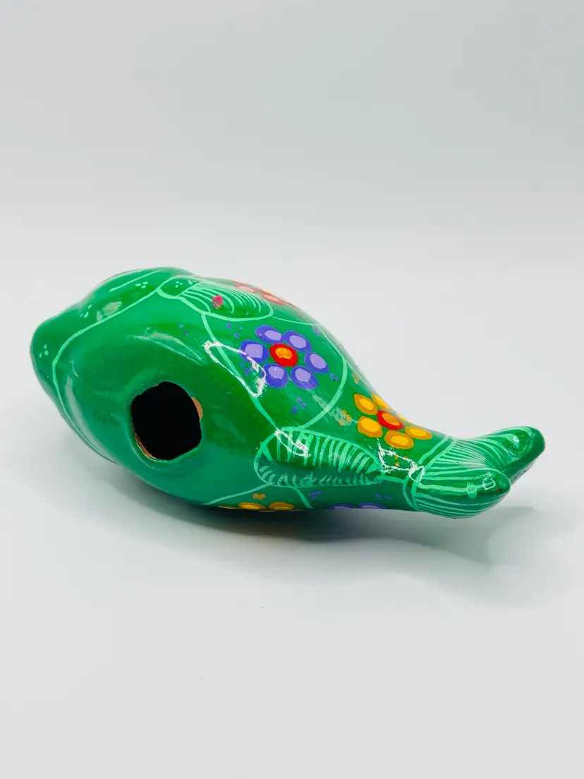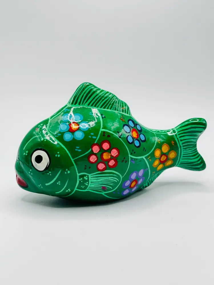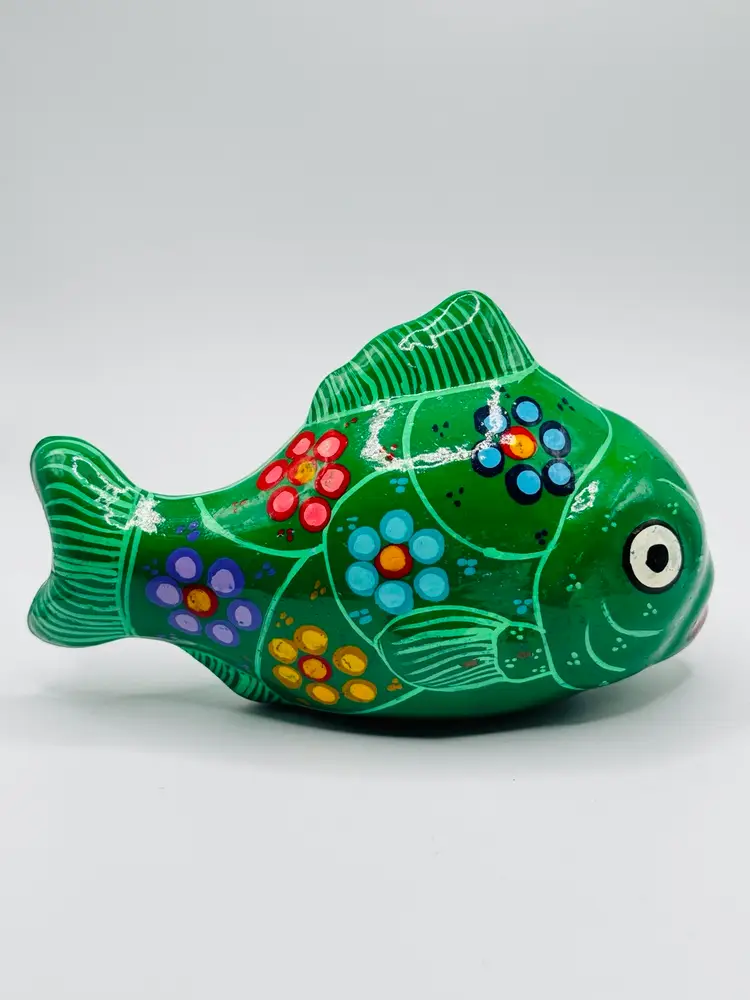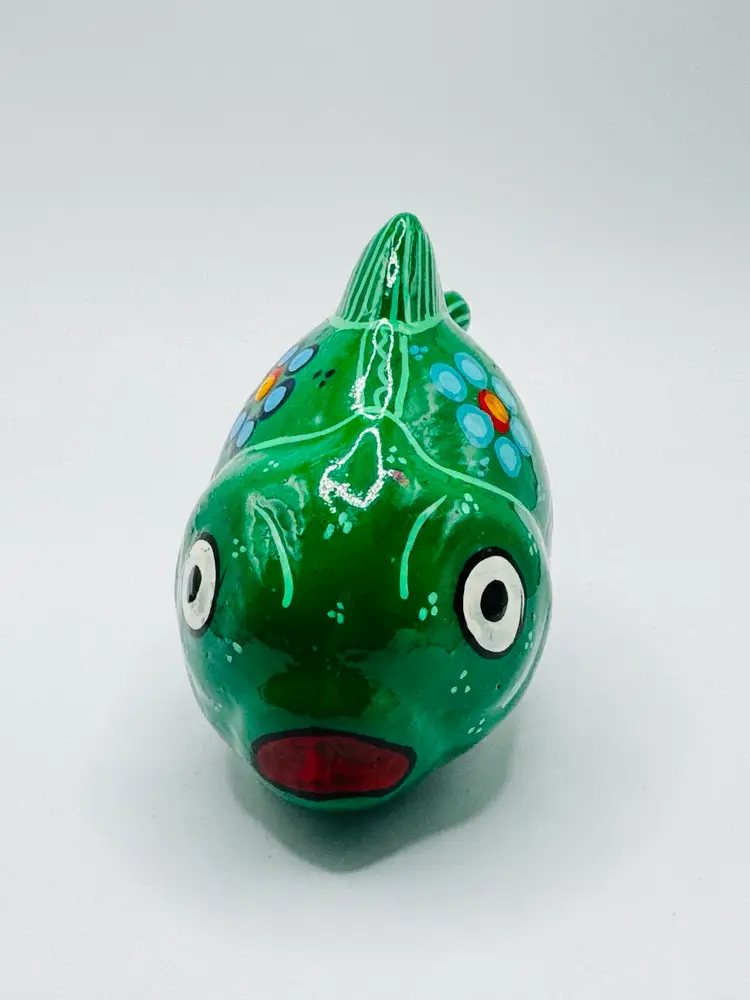 5 3/4 x 3 1/4" No chips, no cracks Missing paint glazed over spots on one fin. Missing green paint near hole under fish.