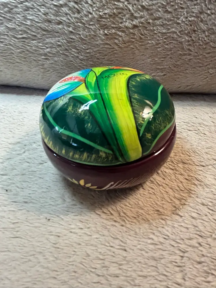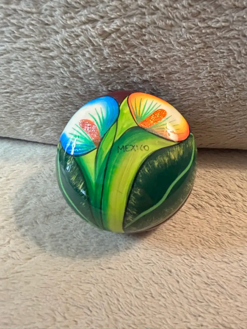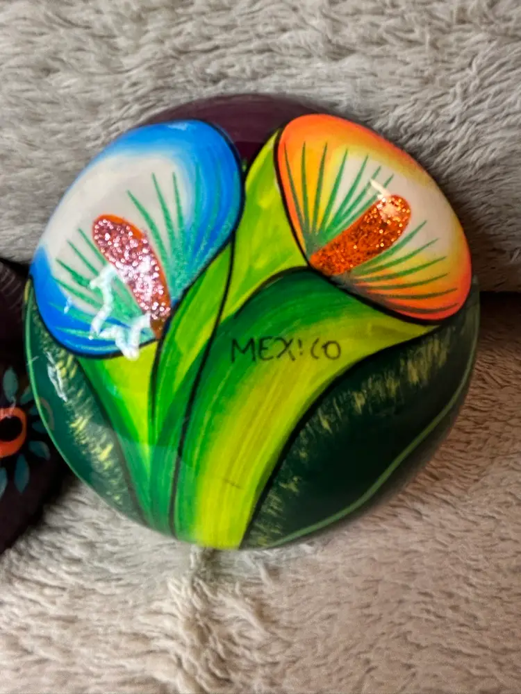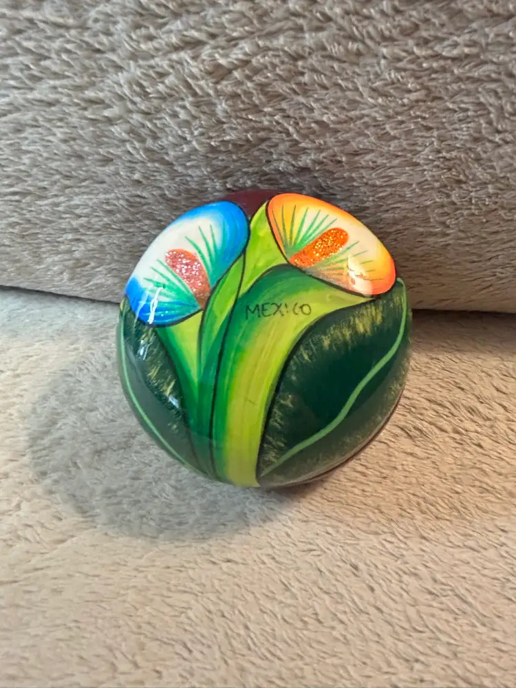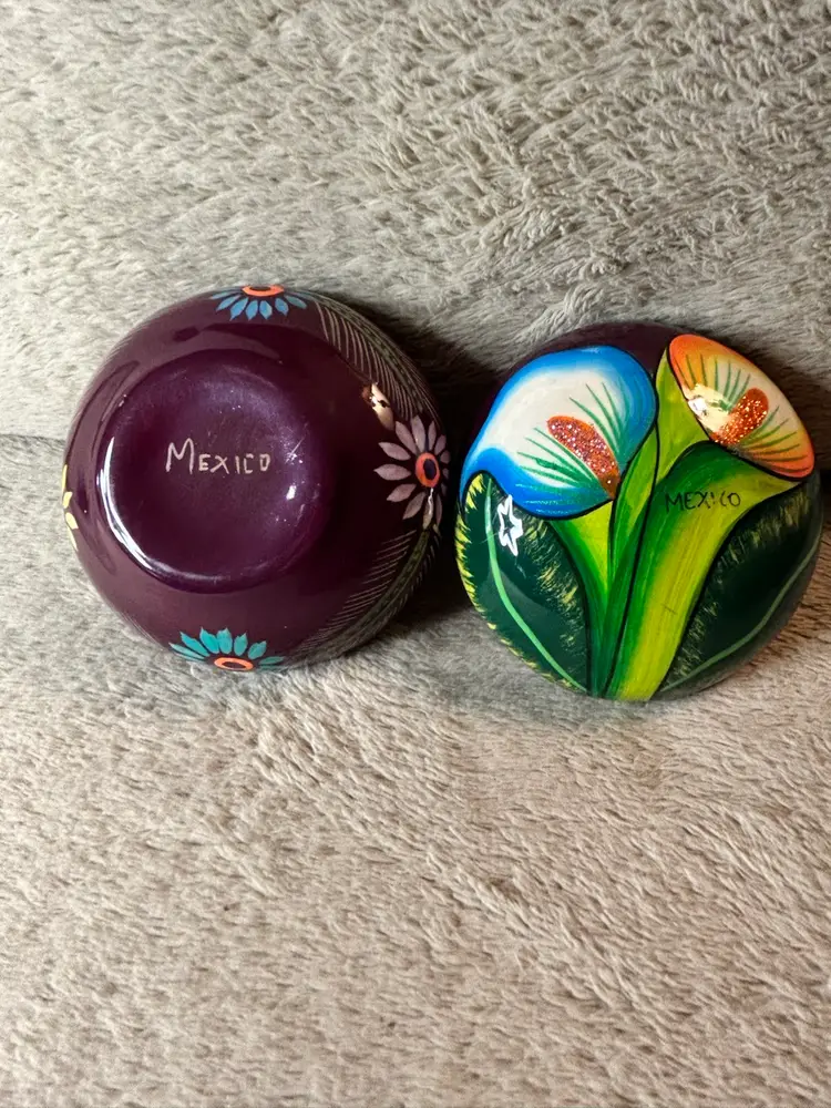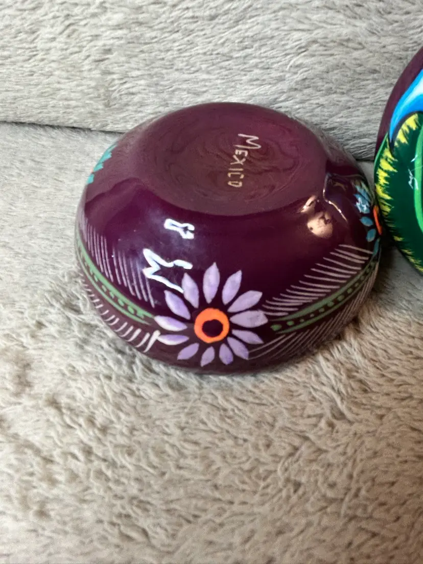 This Talavera Mexican pottery piece is hand painted with vibrant blue, green, and purple colors, showcasing traditional Mexican craftsmanship. Made in Mexico, this handmade item reflects the rich cultural heritage of Mexico. The intricate designs and unique colors make it a beautiful addition to any collection or home decor inspired by Latin American art.
