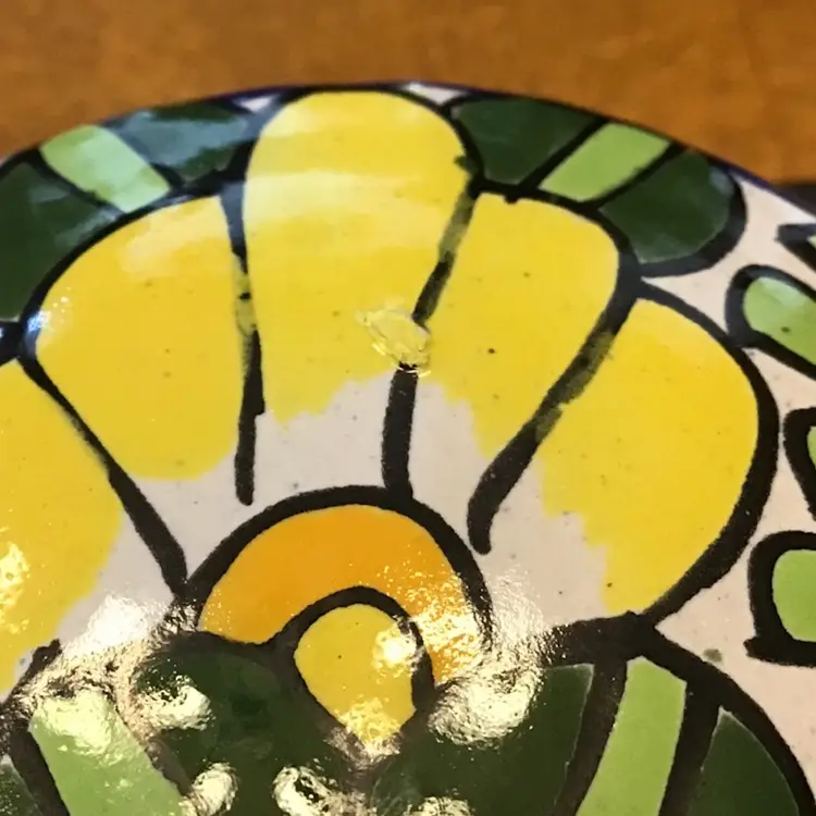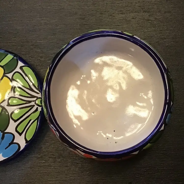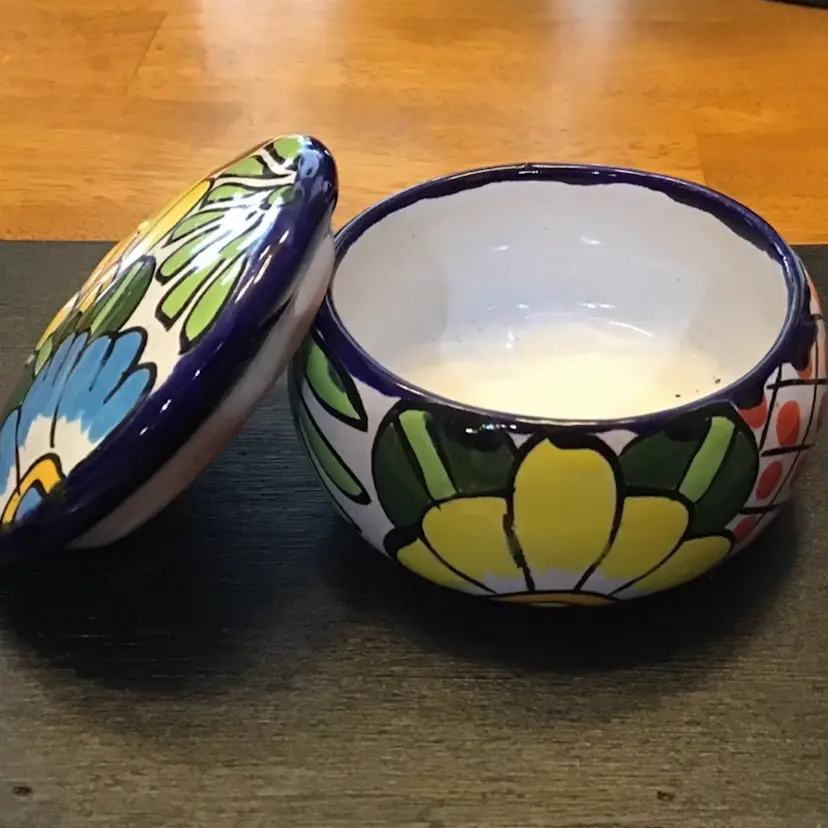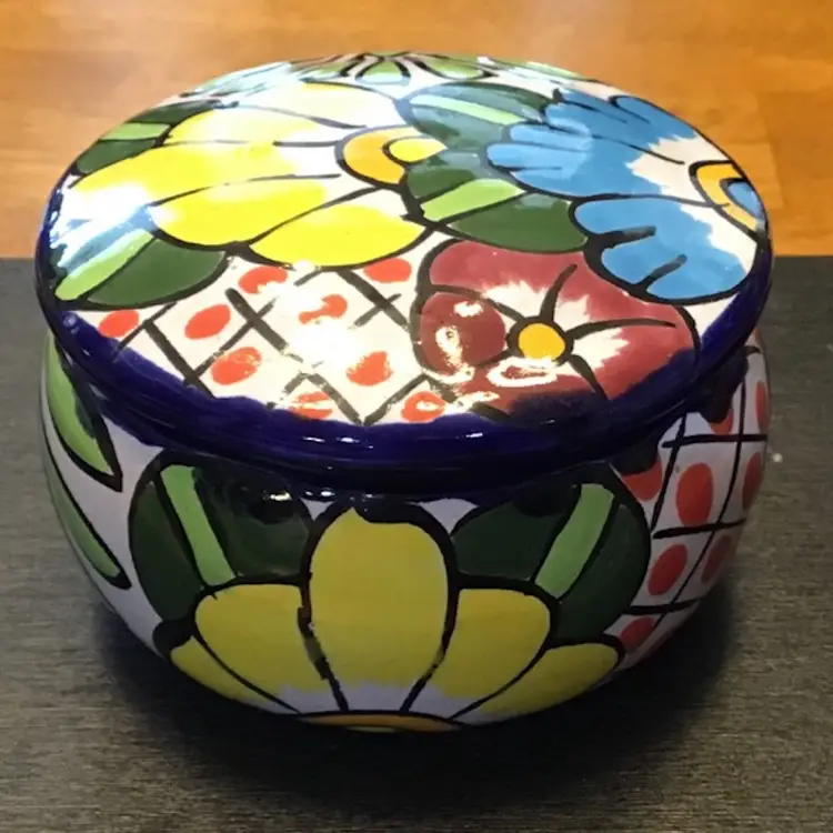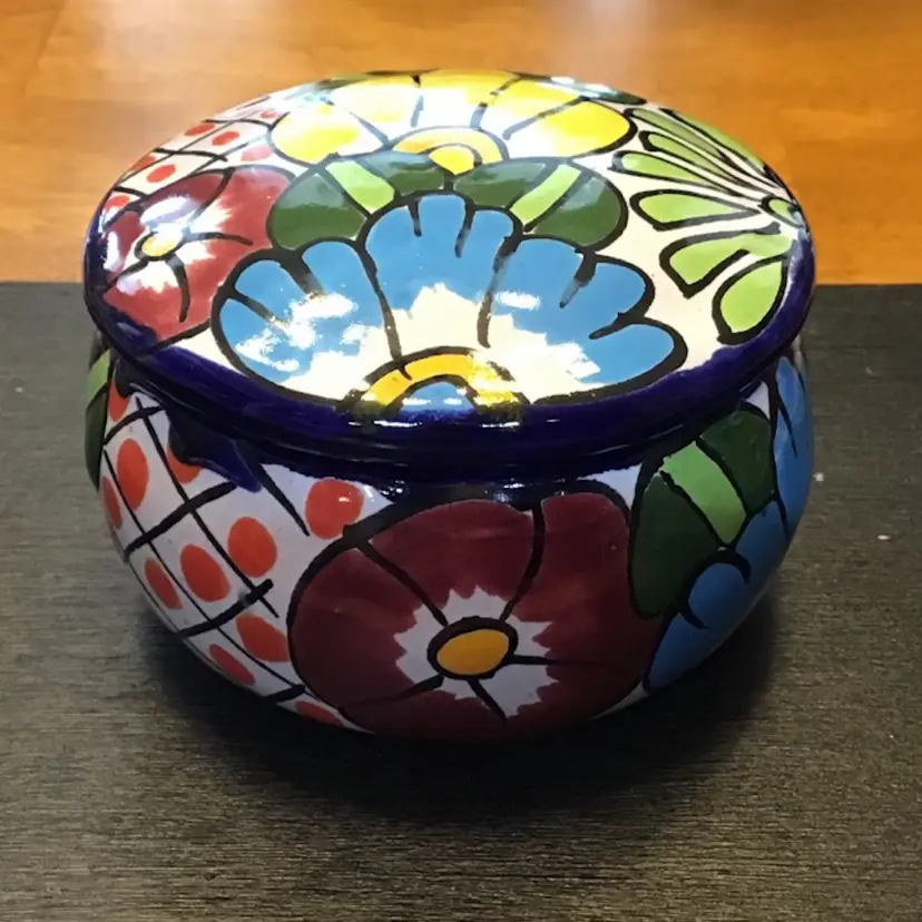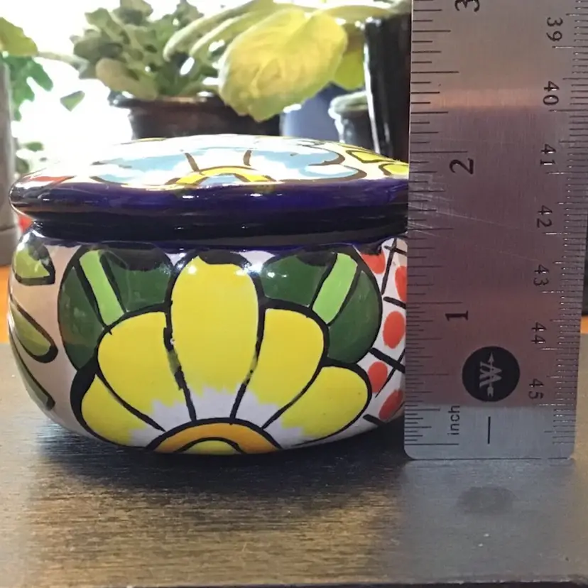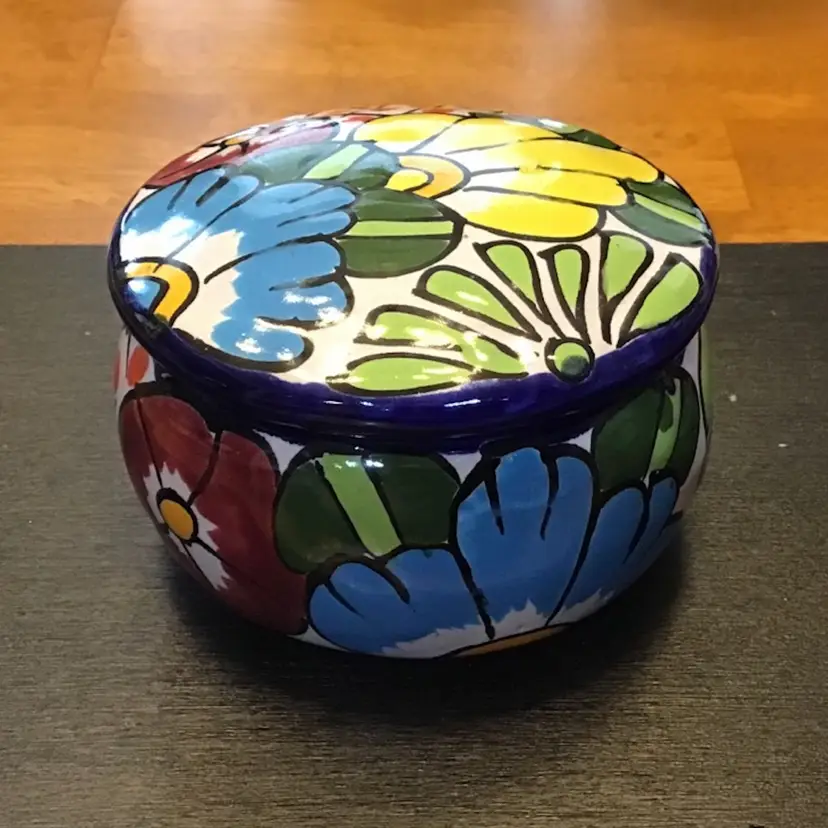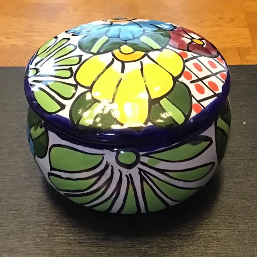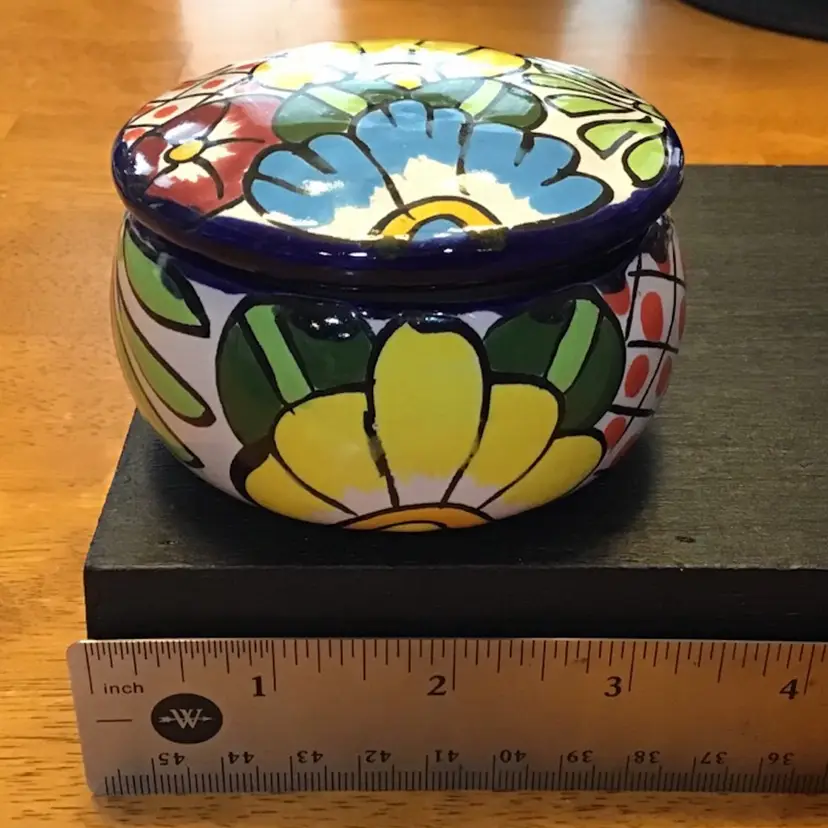 Small trinket box jar with flower design is in excellent condition. No chips, cracks, or repairs. There is a small manufacturing defect on the lid. No other issues. Size is in the pictures. See all pictures as they are an important part of the description.