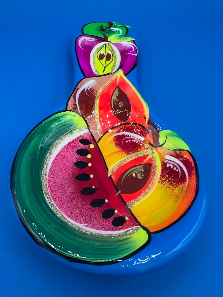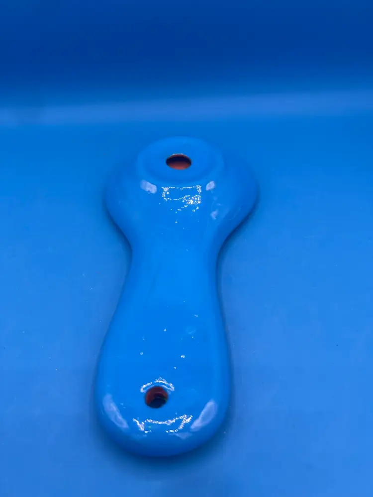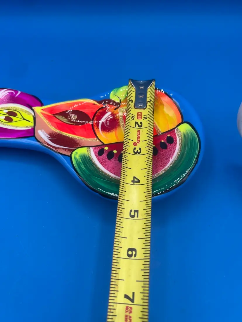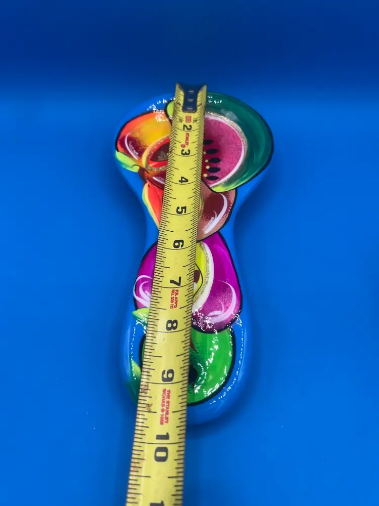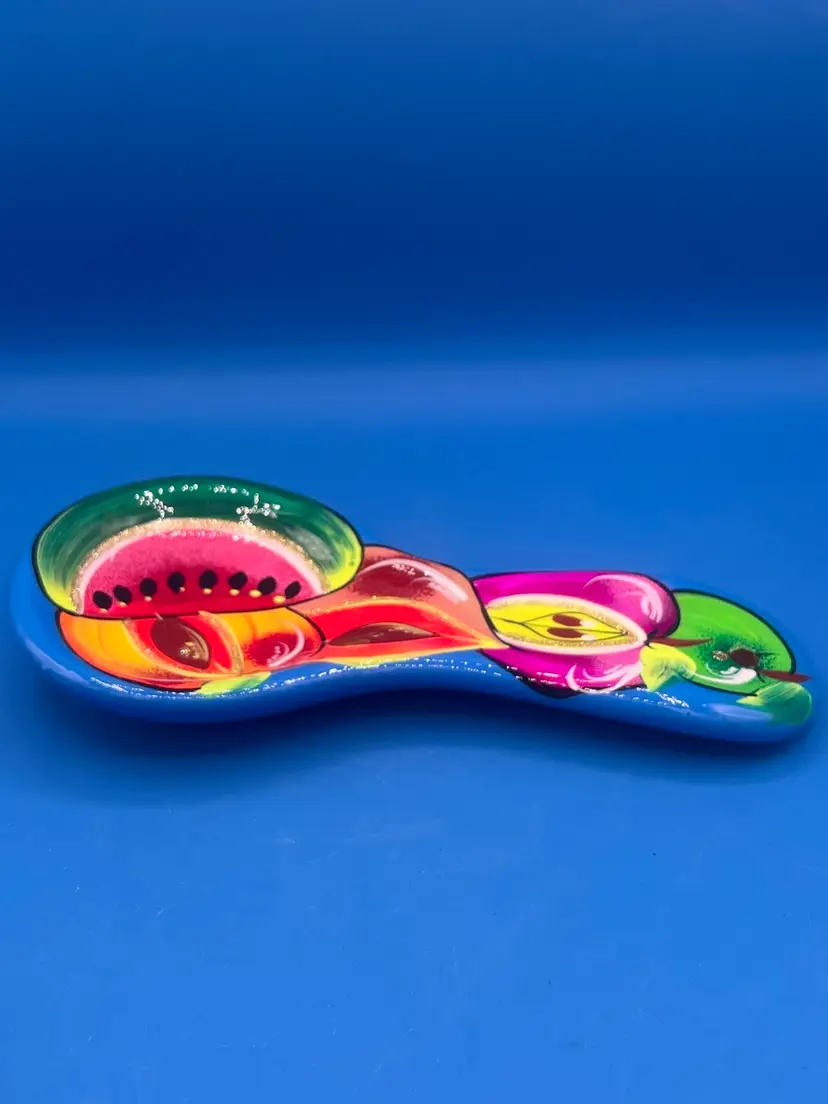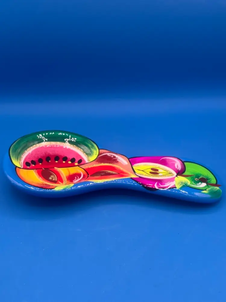 This spoon rest is very vibrant and oh so pretty! It has a bright blue base with glossy finish and some glitter mixed in. It measures 9 1/2 inches long and 4 1/2 inches at the widest point.