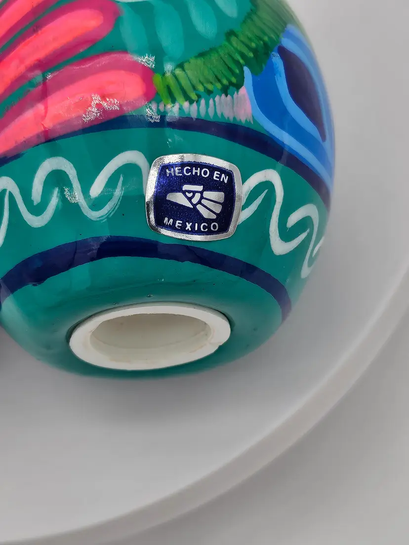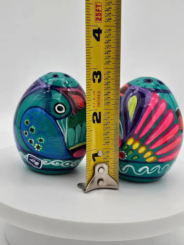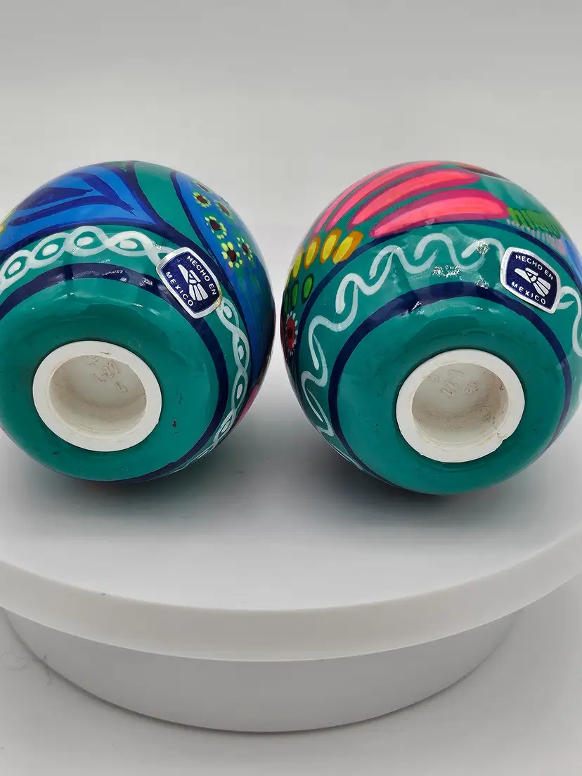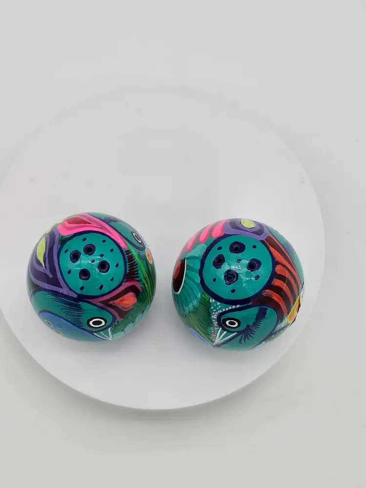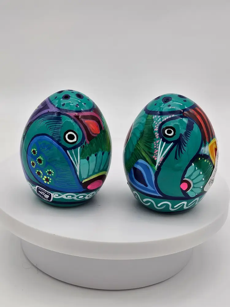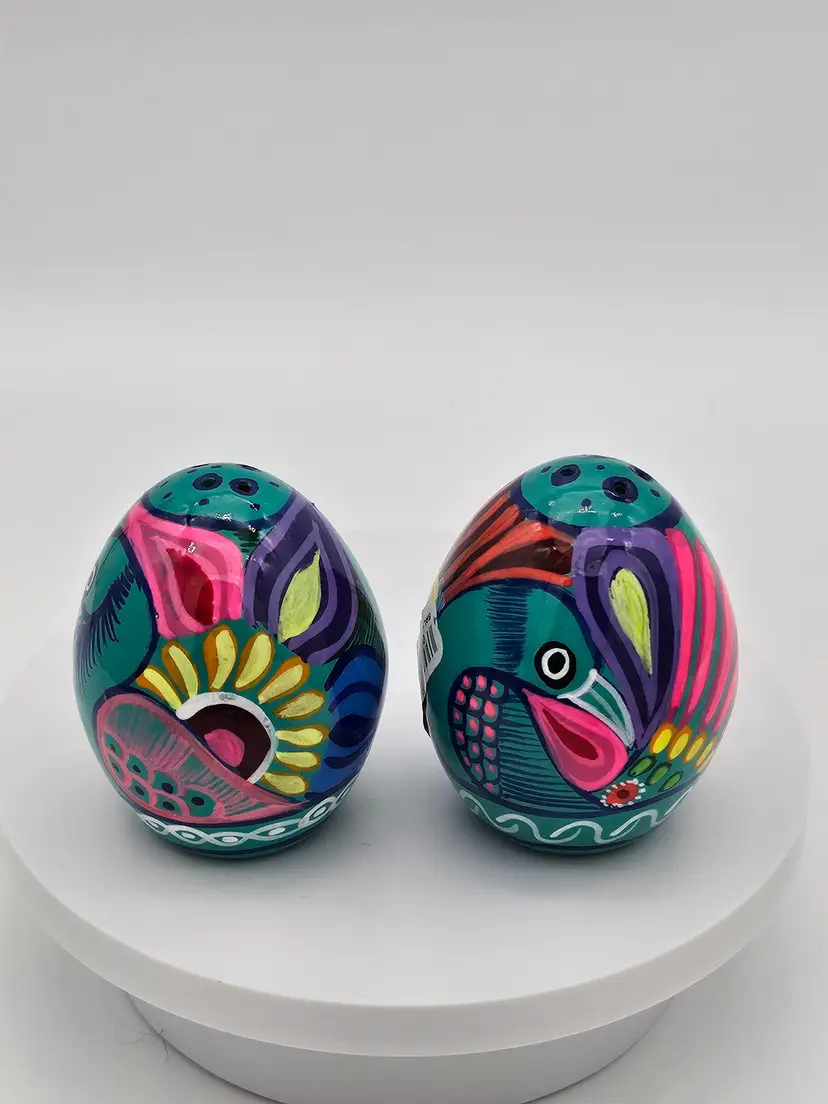 Spice up your kitchen with these beautiful handcrafted Talavera salt and pepper shakers. Made in Mexico, these shakers feature a colorful abstract peacock design on a blue and green background. The set includes two shakers, one for salt and one for pepper, making it perfect for all occasions.