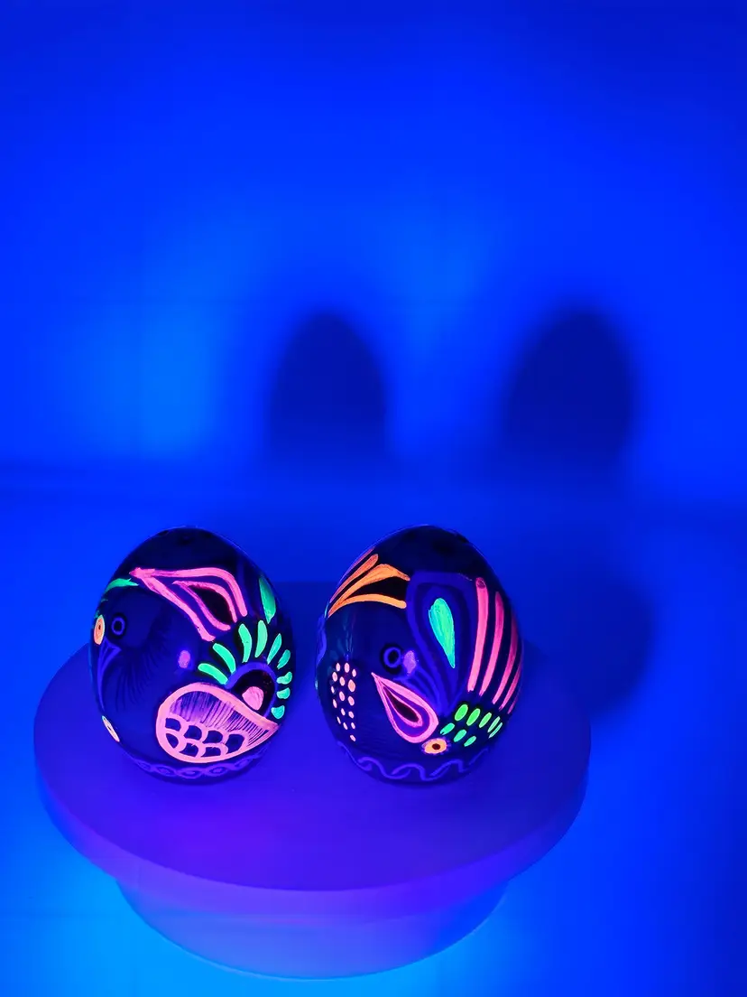 These small, egg-shaped shakers are made of high-quality ceramic and are an original piece. The design glows beautifully under blacklight. Don't miss out on the opportunity to add these unique salt and pepper shakers to your kitchen.