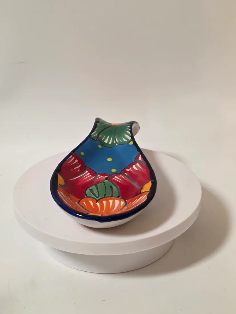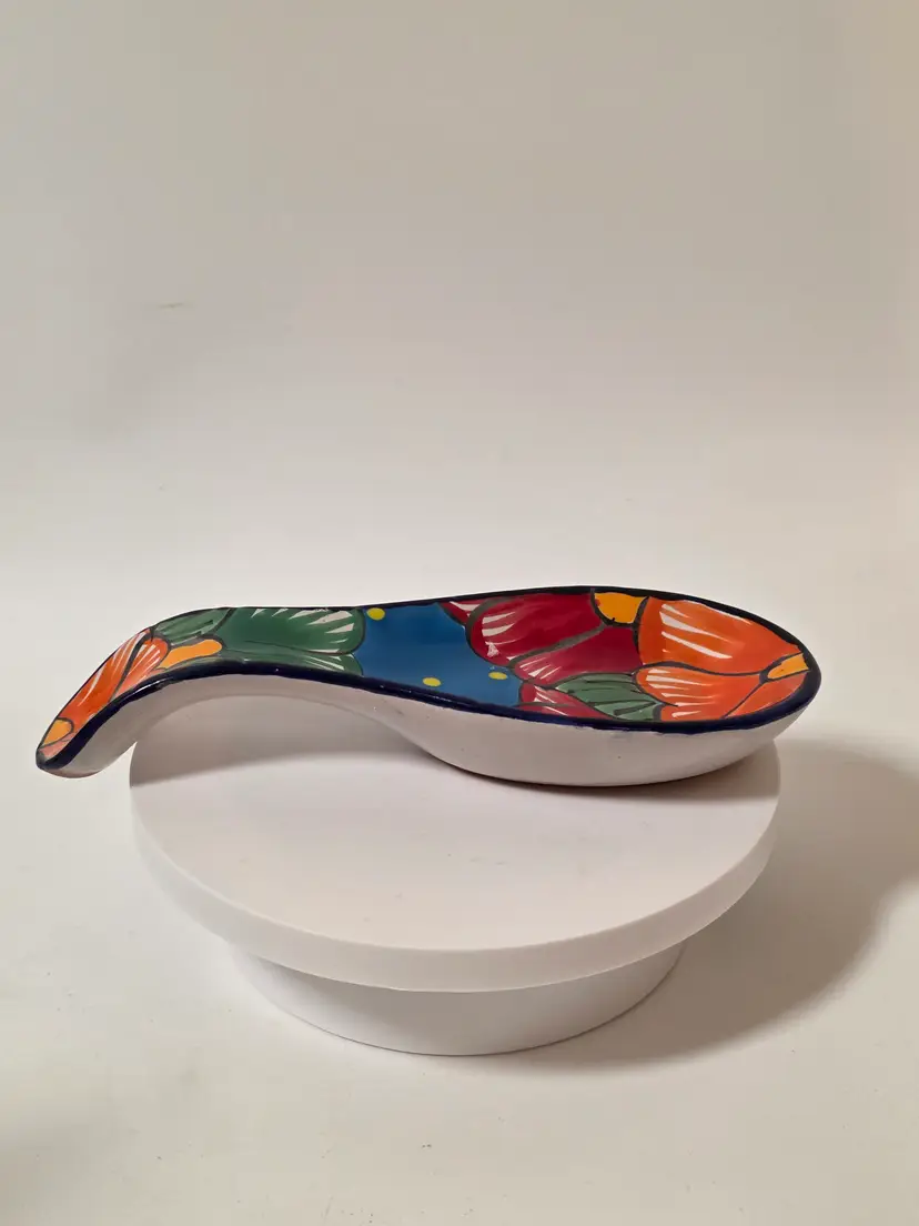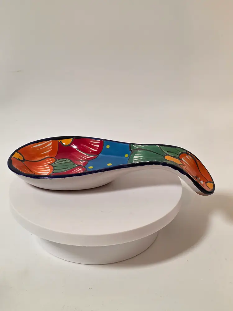 The Talavera Spoon Rest is a vibrant and functional addition to any kitchen decor. Made in Mexico, this spoon rest adds a touch of Mexican culture to your collection. The multicolored designs in green, orange, and red make it a unique and eye-catching piece. Perfect for keeping counters clean while adding a pop of color to your cooking space, this Talavera Spoon Rest is both practical and decorative.