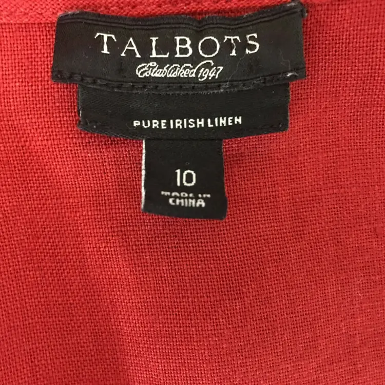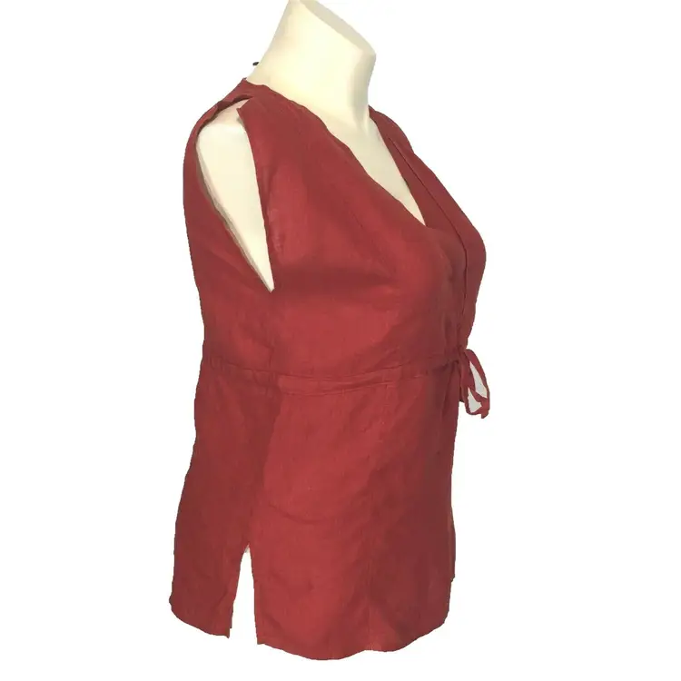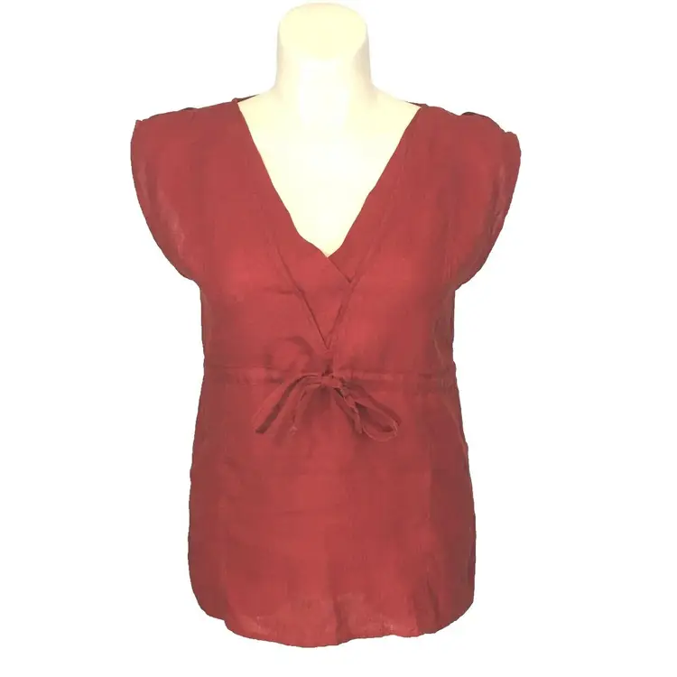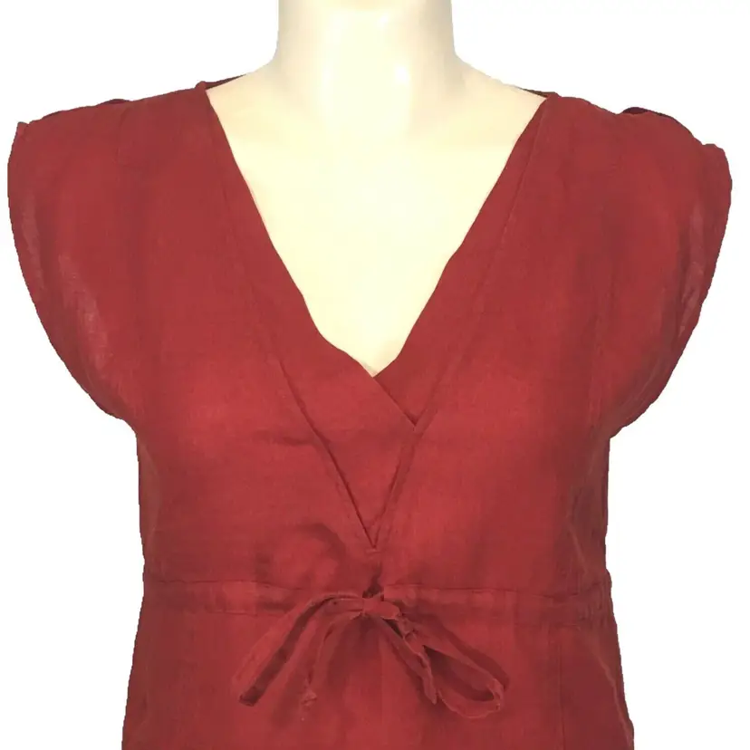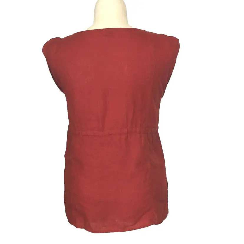 TALBOTS - Looks NEW Red/Burnt orange color Irish linen Waist adjustable with tie Sleeveless with slits on shoulders Pullover Does NOT stretch Hand wash SIZE: 10 Measurements taken from seam to seam BUST: 20.5" WAIST: 20" HIP: 21" LENGTH: 26" shoulder to hem