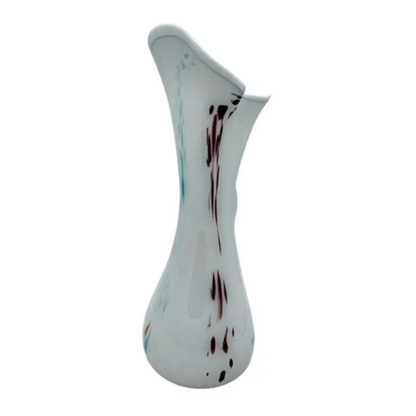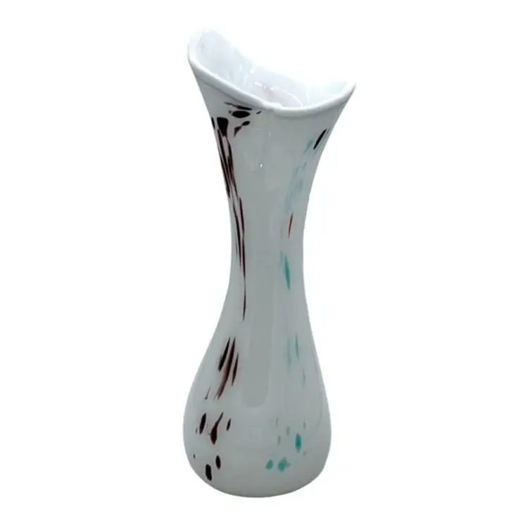 • Hand-blown art glass construction • Crimped mouth design • Unique speckled pattern • Measures 15" H x 5.5" W at the base • White with blue, red, and brown accents
