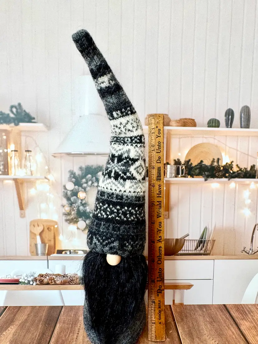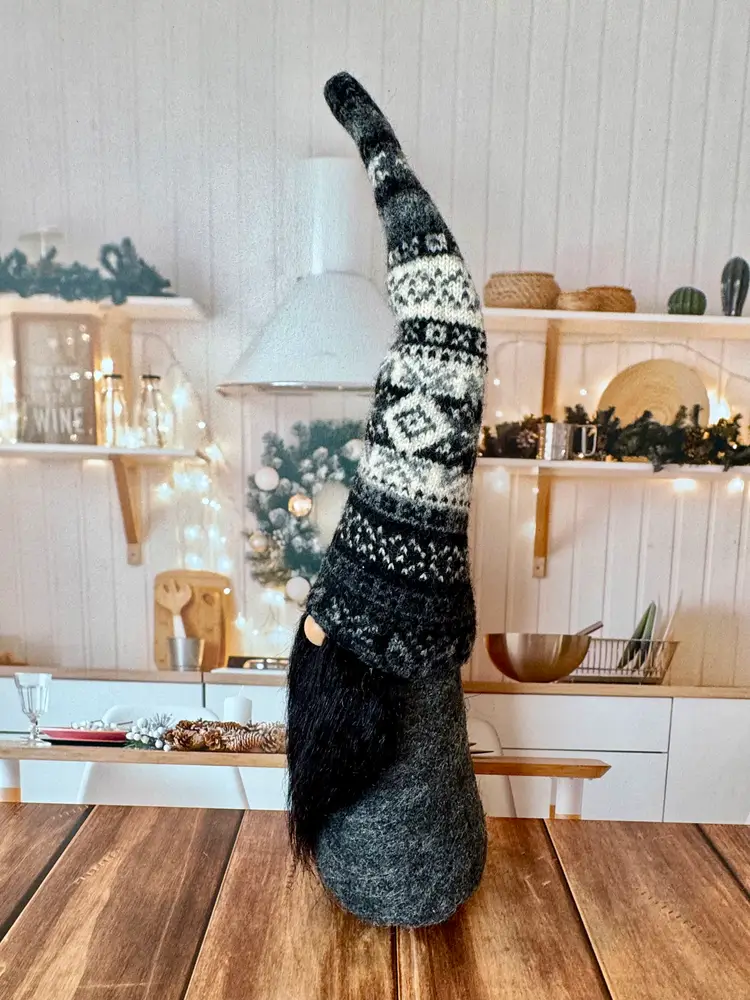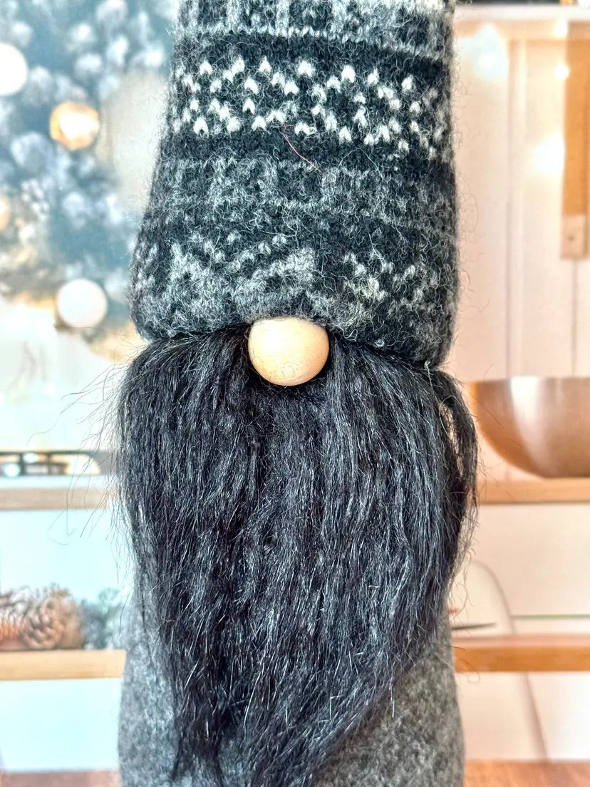 This is a tall skinny gnome and in not your traditional red and green holiday colors. He can be left up all year round. The hat is black, grey and creme. It is made from a really pretty wool upcycled sweater. There is a really pretty snowflake woven in it. The body is a heather grey felt. The beard is deep black and semi wavy.It has a big wooden nose that gives him a lot of personality!