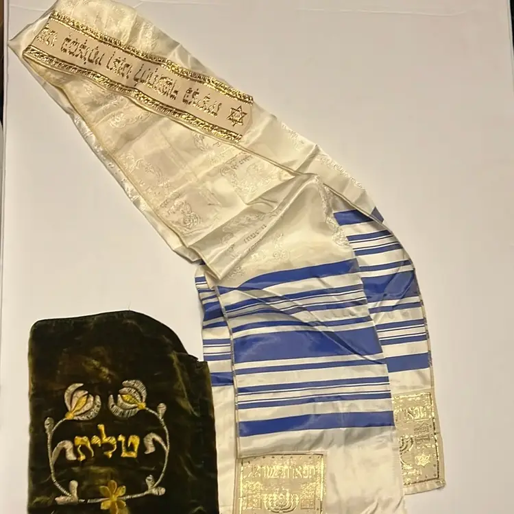 Selling a traditional Jewish Tallit prayer shawl. It's white with the classic blue stripes and has the fringe on the ends. Comes with a green velvet carrying bag that has some gold embroidery on it. The shawl itself has some Hebrew lettering along the collar part. It's been sitting around so it might need a light cleaning but overall looks to be in decent shape for someone looking for a ritual shawl.