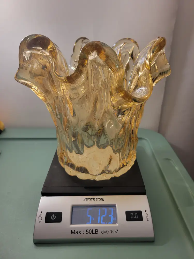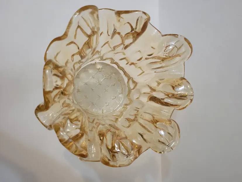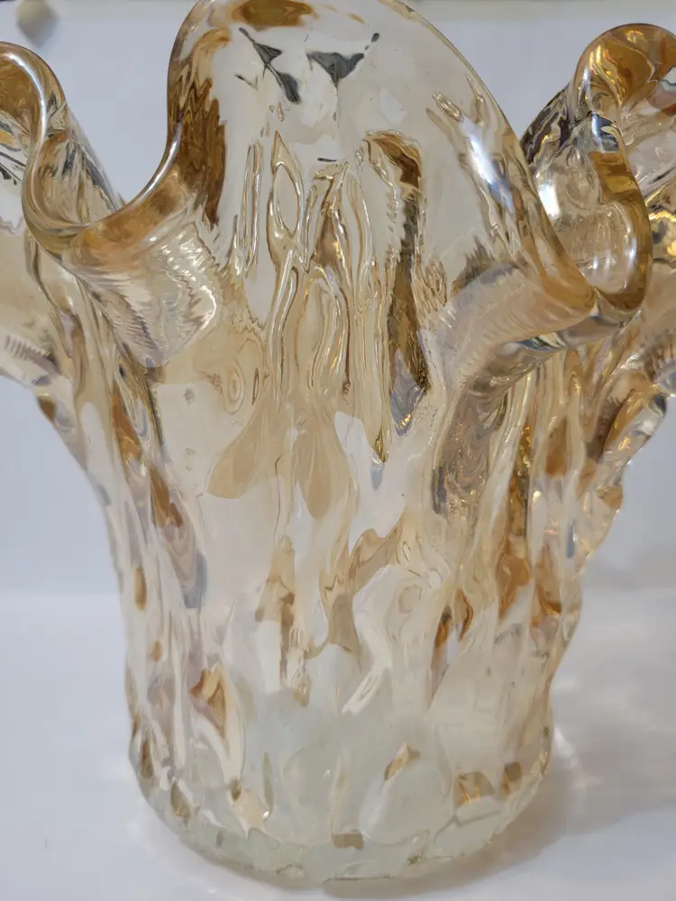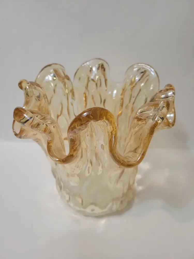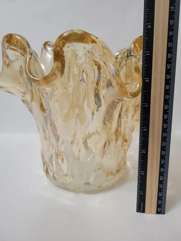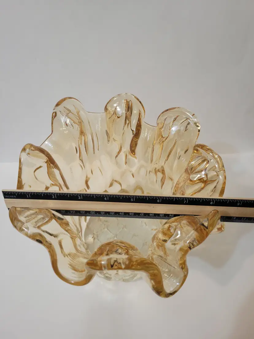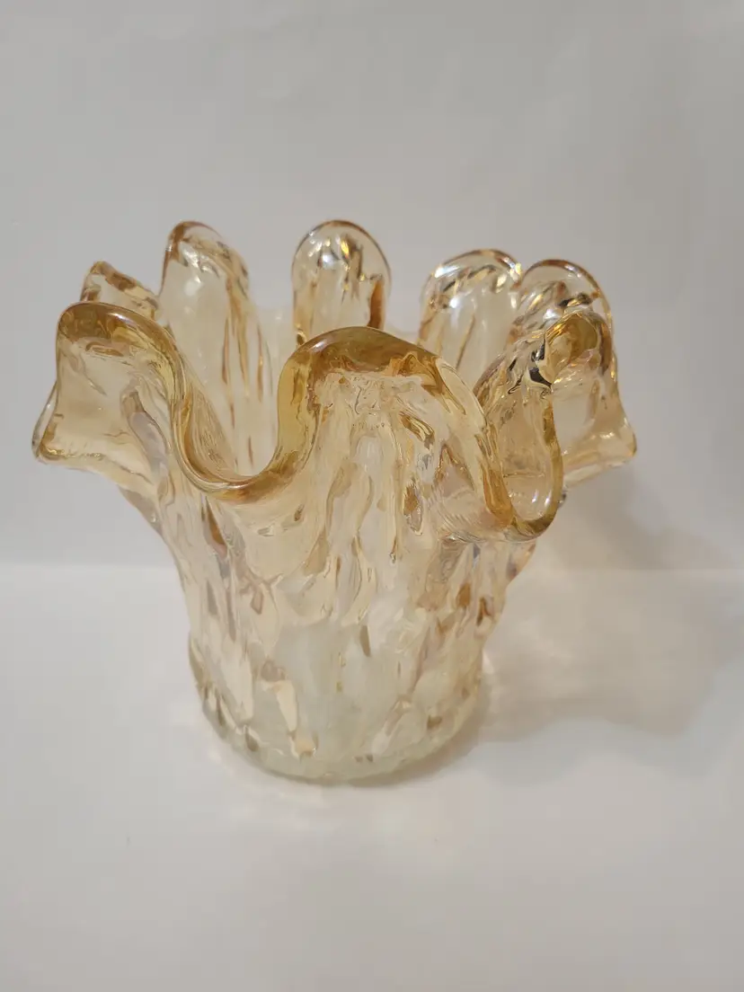 Tammaro MURANO Amber Handkerchief Ruffled Hand Blown Glass Candle Vase 8.25” H x 8.5" W. Weighs 5lbs 12.3oz. Very good condition. Candle not included! Made by Antonio Tammaro Group S.r.l. . Made in Italy. No chips or cracks. See photos for details. Thanks for looking!:)