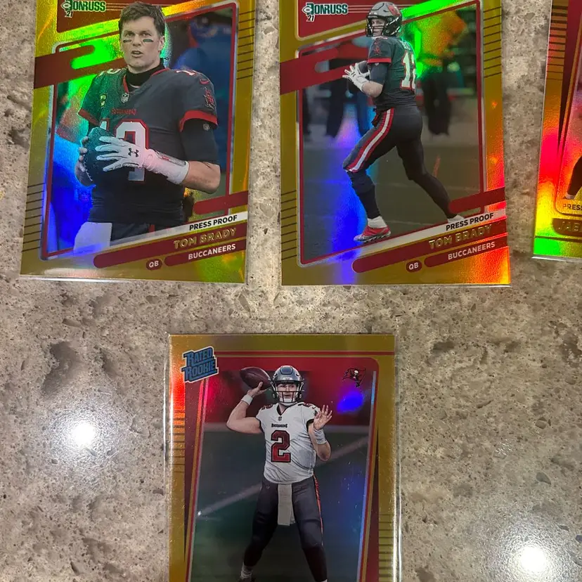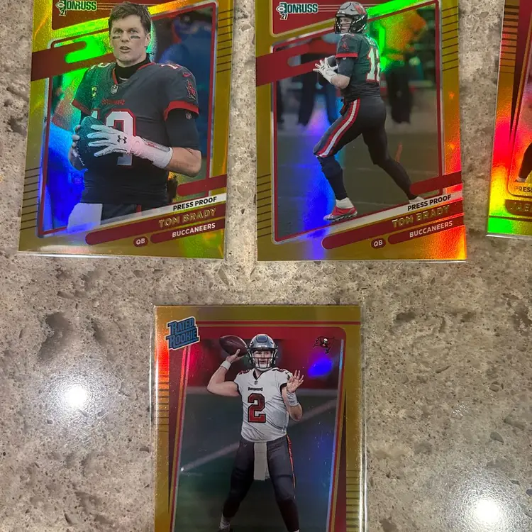 Donruss complete Tampa Bay Buccaneers Team Set Press Proof Gold Premium Stock 2021 (first year premium press proof stock gold) including 2 Tom Brady and a Kyle Trask Rated Rookie will ship BMWT ($5). Progressive shipping of $.25 per item.