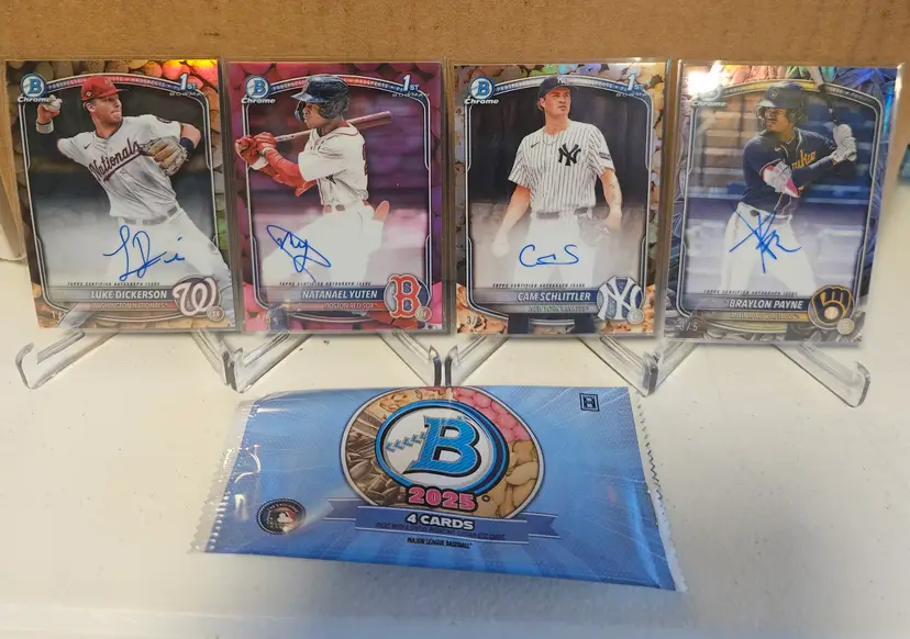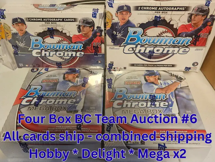 Team Auction! Breaks Friday night 10/17 at 10pm ET (1st break starts at 10pm, 2nd break right after) There are 16 breaks total - 2 each night for 8 nights. IF I have a late game, I might have to push the break to 11pm, but I will post that on Twitter and District. Might happen for Tuesday night breaks. . 4 boxes each break: 2025 Bowman Chrome Hobby 2025 Bowman Chrome Delight 2025 Bowman Chrome Mega x2 . 2 identical breaks each night! 8 nights. 16 total breaks. . Get your teams in all 16 breaks and have cheap entertainment for 8 nights! Each auction is for 1 team in 1 break. . All cards ship! Breaks are each night starting at 10 pm ET. Auctions end from 845-945pm ET Dual Team hits will be randomed. Dual team base/non-hits will be split evenly. SHIPPING: $5 1st team, $0.50 additional. Combines with the divisional and any personals! ALL CARDS SHIP - ALL PACKS ARE OPENED! ALL 16 Breaks Ship together - getting you $0.50 shipping on all additional teams!