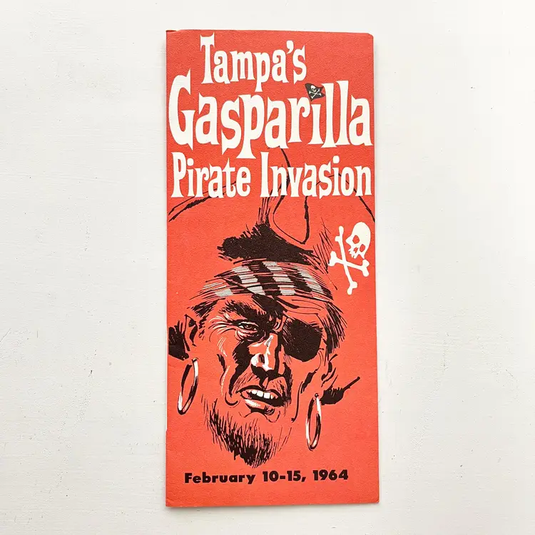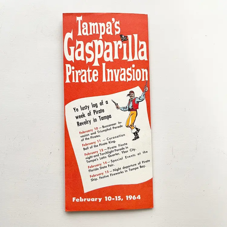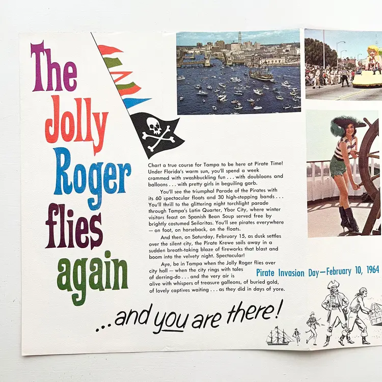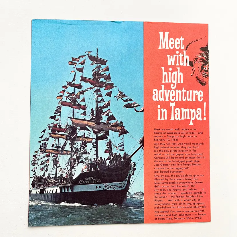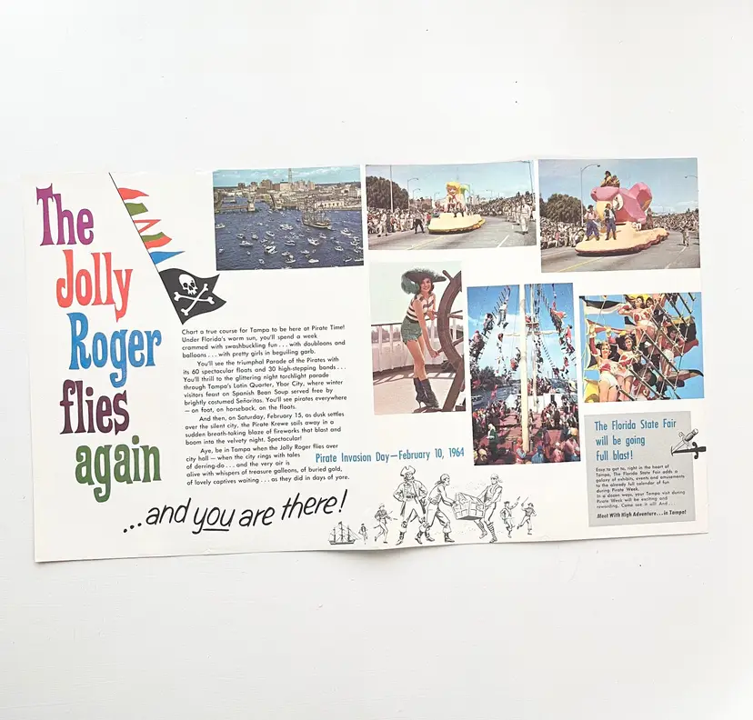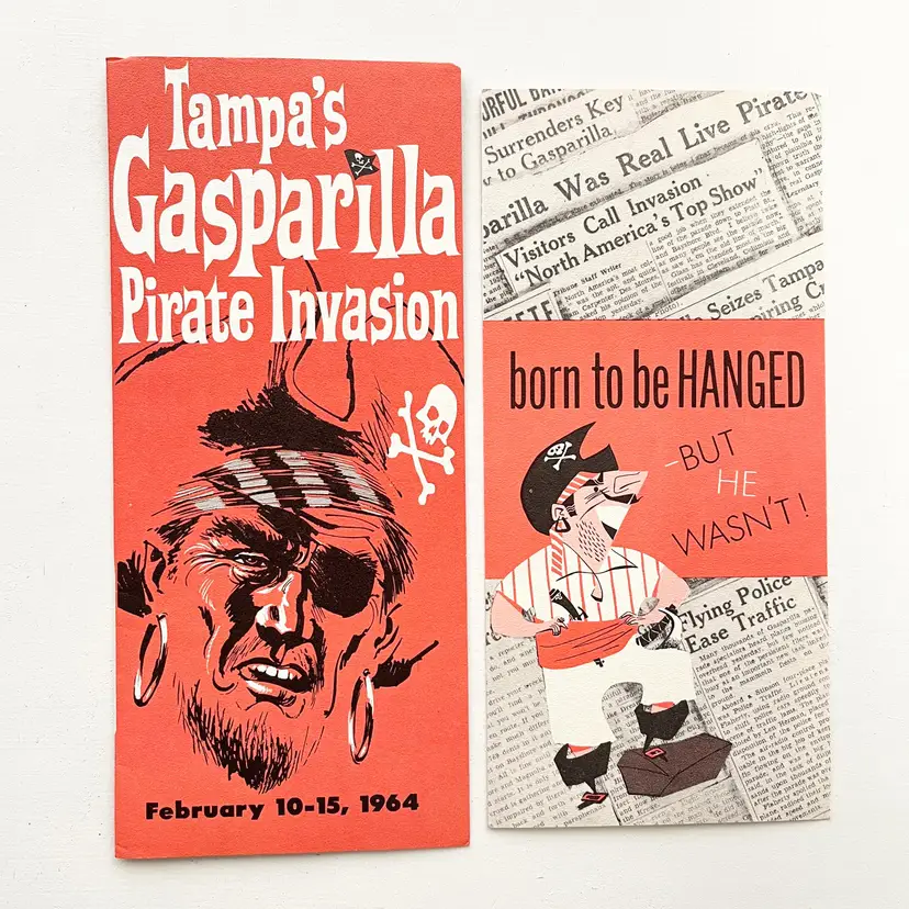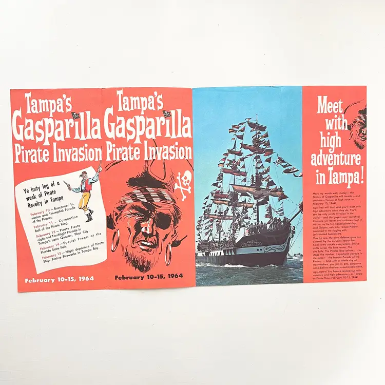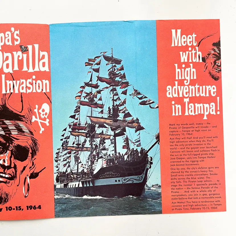 Tampa's Gasparilla Pirate Invasion Florida Festival Parade Brochure Vtg 1960s Mark my words matey – the Pirates of Gasparilla will invade – and capture – Tampa at high noon on February 10-15, 1964 Aye they will that! And you'll meet with high adventure when they do! You'll see cannons boom and cutlasses flash in the sun as the full-rigged pirate ship, Jose Gaspar, sails into Tampa Harbor crammed to the rigging with jack-booted buccaneers. The pirates leap ashore in the famous Parade of the Pirates Pirates on foot, horseback and floats Pirate Fiesta in Tampa's Latin Quarter, Ybor City. Whispers of Treasure Galleons, Buried Gold and Lovely Captives! Includes the Born to Be Hanged brochure that tells the story of Gasparilla – the History of a Pirate Who Became a Civic Legend Advertising for the 1964 Florida State Fair Condition: Both brochures have wear around the edges and on the covers Measures 9 inches x 4 inches, 8-1/2 inches x 4 inches Packaged in a plastic sleeve inside a rigid envelope Visit my store to see more vintage ephemera, advertising, novelties, gifts, estate sale and yard sale finds https://district.net/u/finderspickerspaper SKU B1