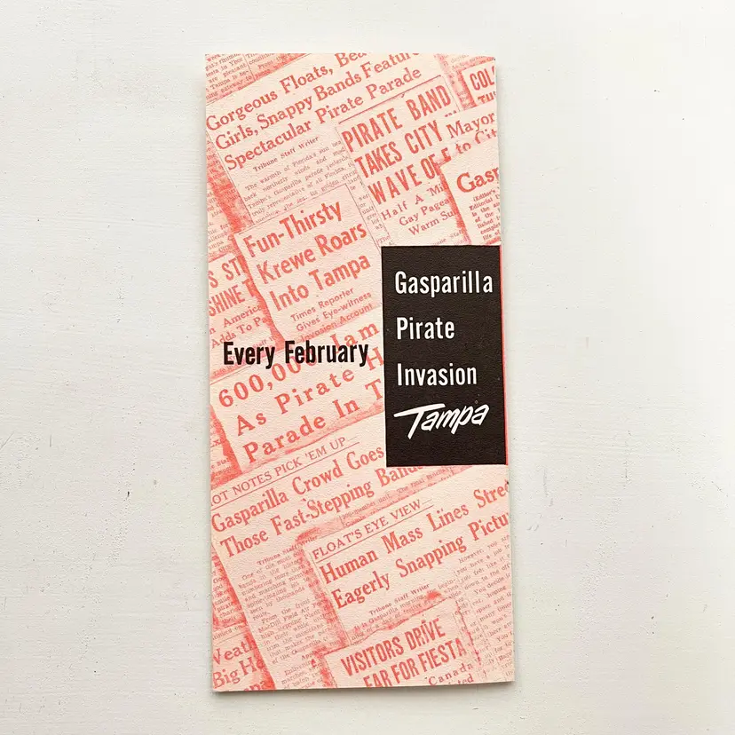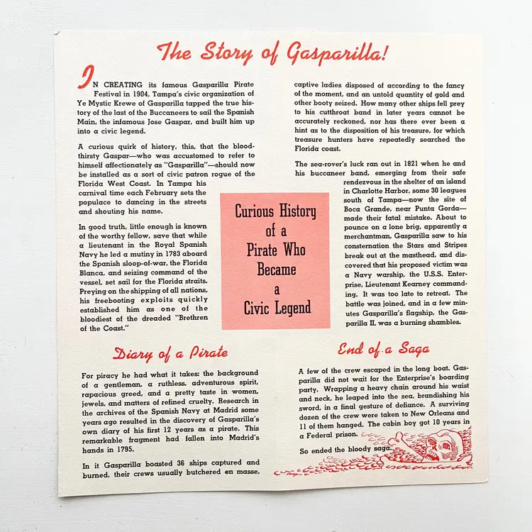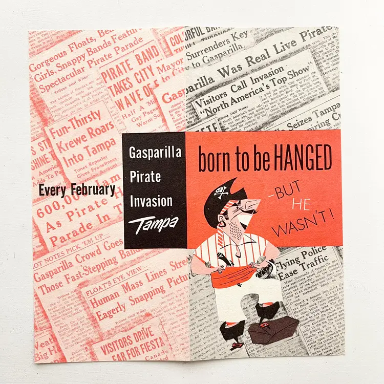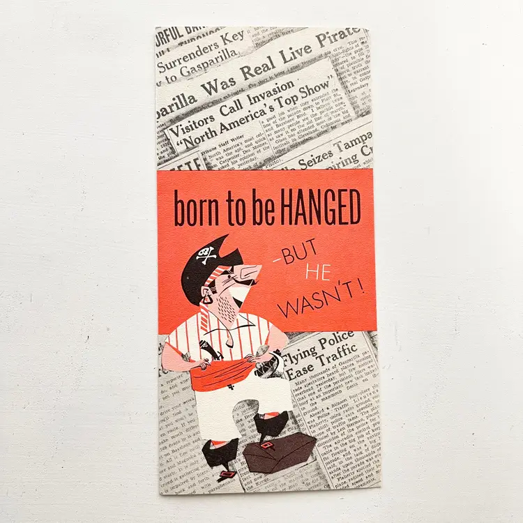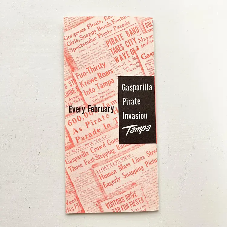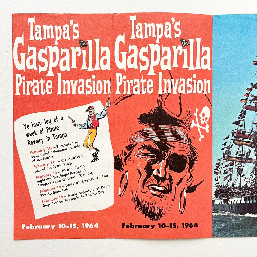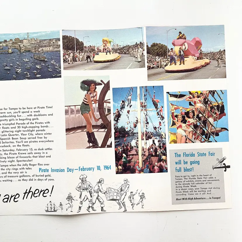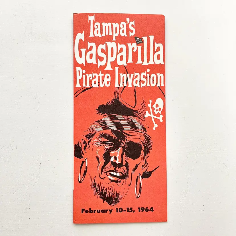 Tampa's Gasparilla Pirate Invasion Florida Festival Parade Brochure Vtg 1960s Mark my words matey – the Pirates of Gasparilla will invade – and capture – Tampa at high noon on February 10-15, 1964 Aye they will that! And you'll meet with high adventure when they do! You'll see cannons boom and cutlasses flash in the sun as the full-rigged pirate ship, Jose Gaspar, sails into Tampa Harbor crammed to the rigging with jack-booted buccaneers. The pirates leap ashore in the famous Parade of the Pirates Pirates on foot, horseback and floats Pirate Fiesta in Tampa's Latin Quarter, Ybor City. Whispers of Treasure Galleons, Buried Gold and Lovely Captives! Includes the Born to Be Hanged brochure that tells the story of Gasparilla – the History of a Pirate Who Became a Civic Legend Advertising for the 1964 Florida State Fair Condition: Both brochures have wear around the edges and on the covers Measures 9 inches x 4 inches, 8-1/2 inches x 4 inches Packaged in a plastic sleeve inside a rigid envelope Visit my store to see more vintage ephemera, advertising, novelties, gifts, estate sale and yard sale finds https://district.net/u/finderspickerspaper SKU B1