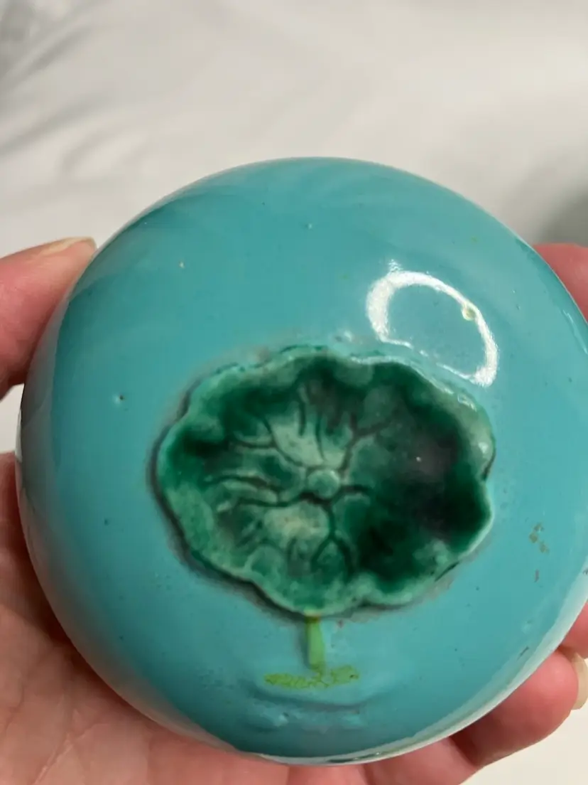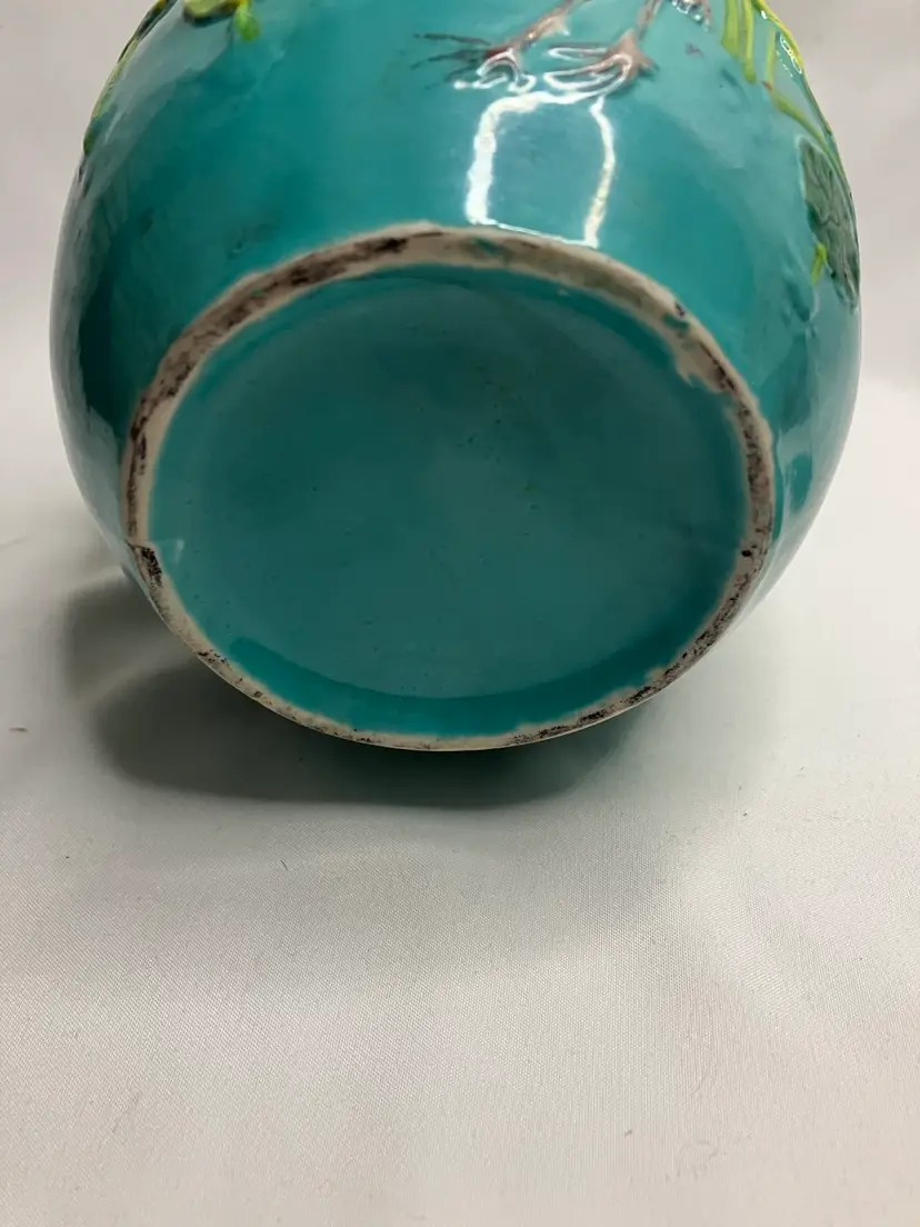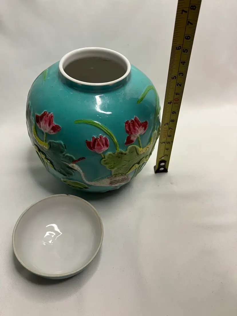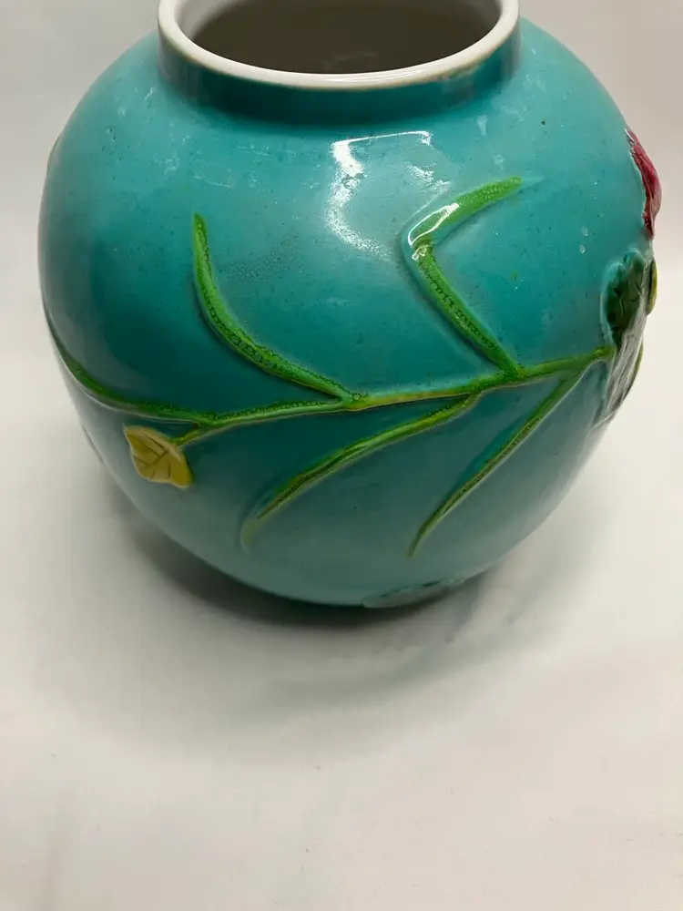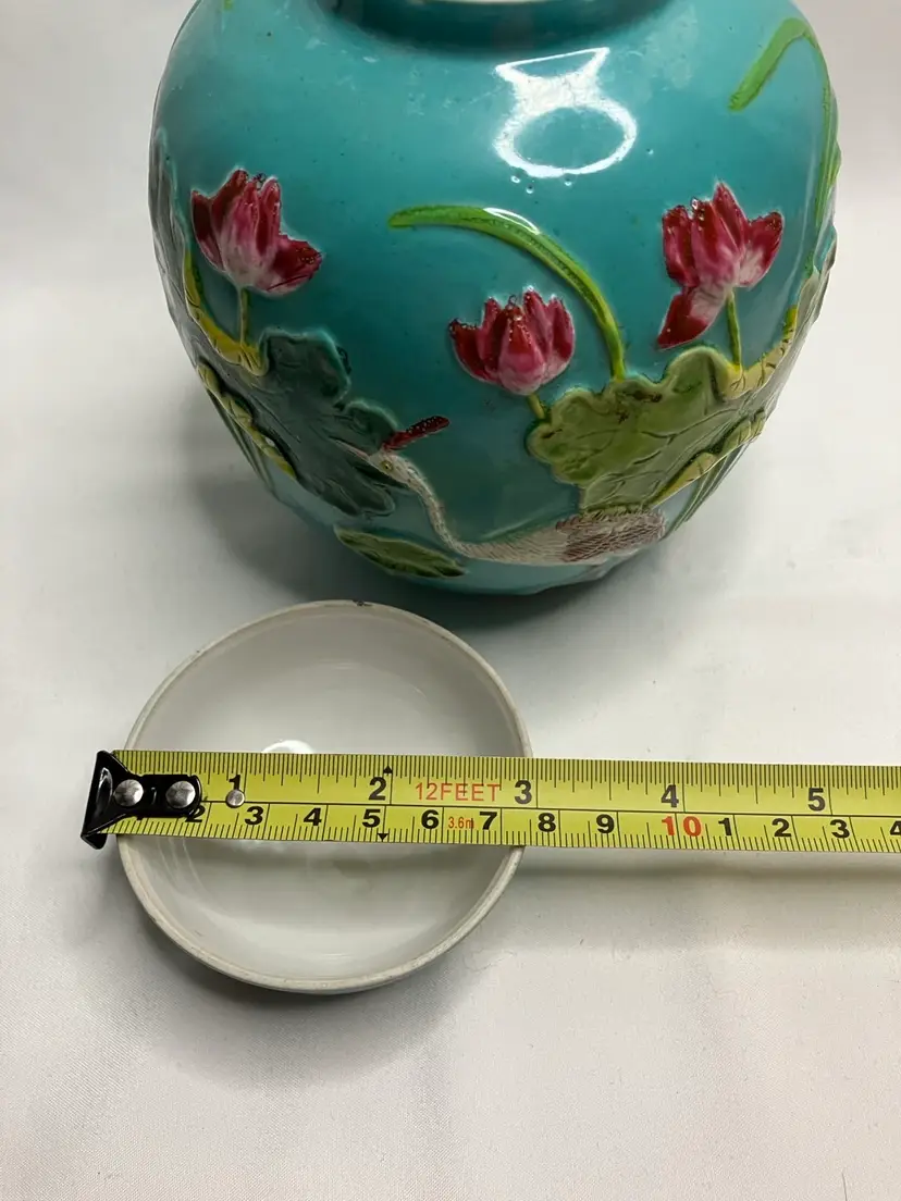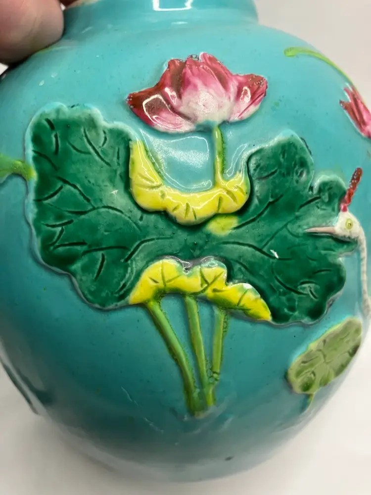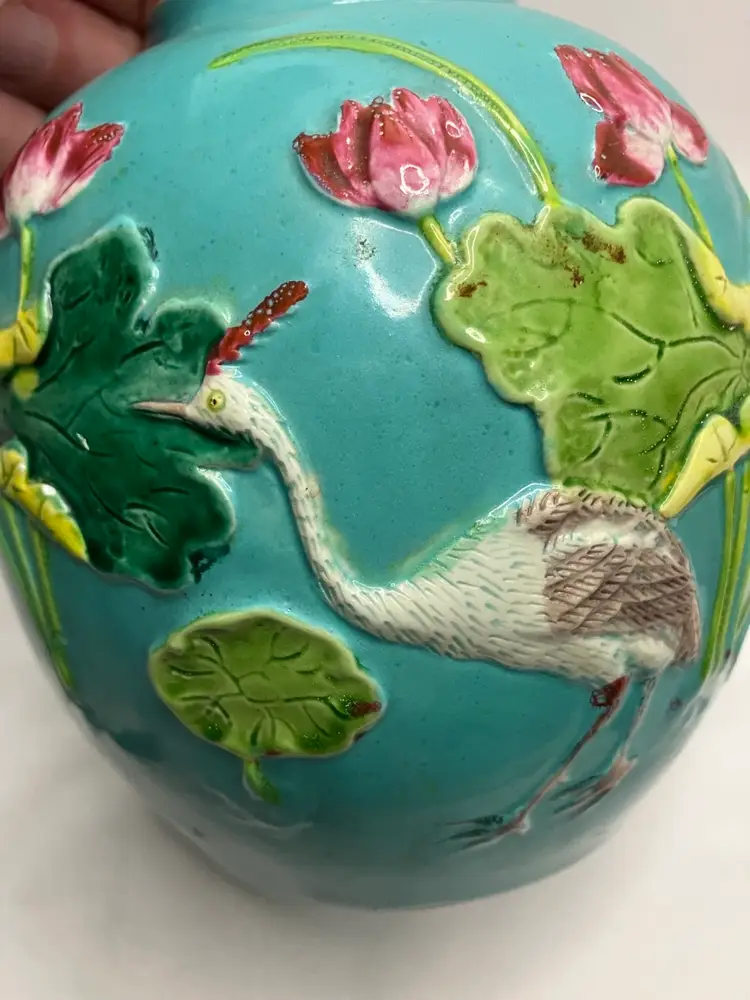 This Stunning Chinese Tang Sancai ginger jar was exported from China to the US sometime between 1890-1920. It features an applied figural crane, lotus blossoms and leaves, and aquatic grasses, giving an overall three dimensional look. Done on a turquoise background,the colors include, yellows, greens, pinks, white, and tan. It stands 5.5” tall.