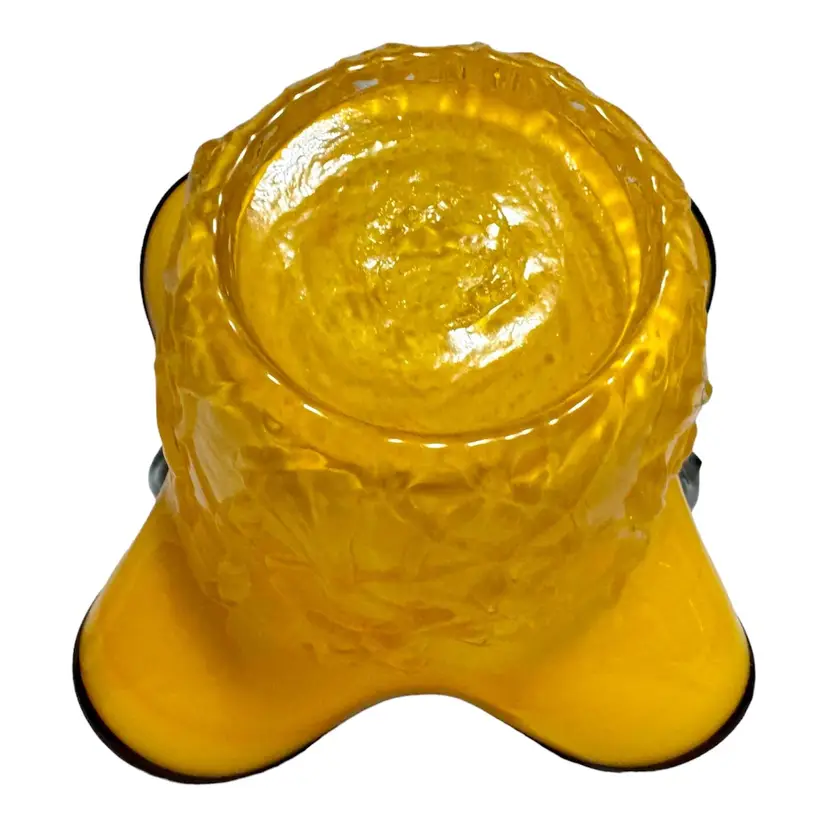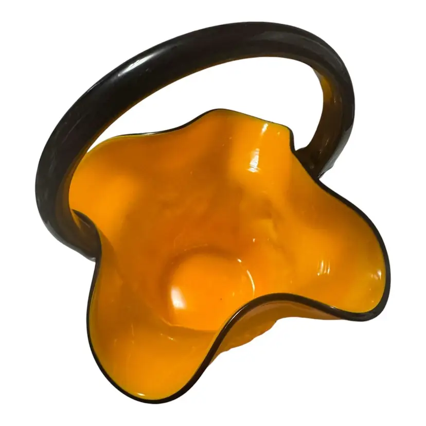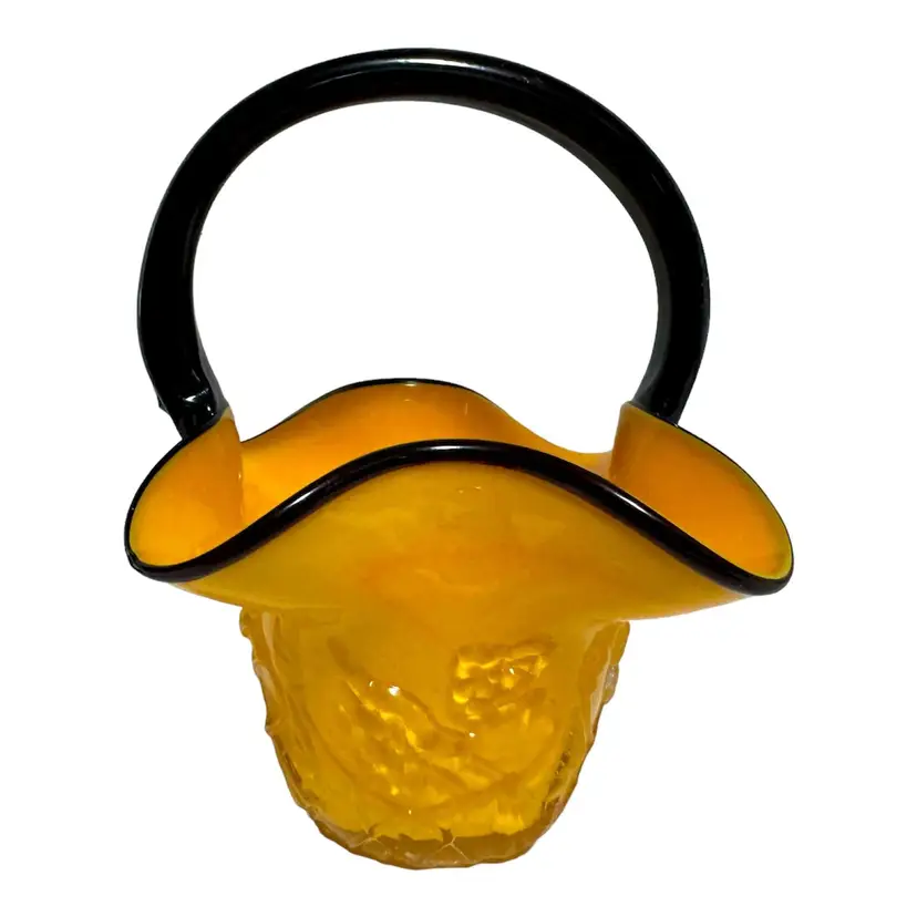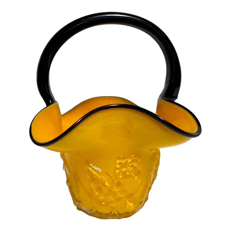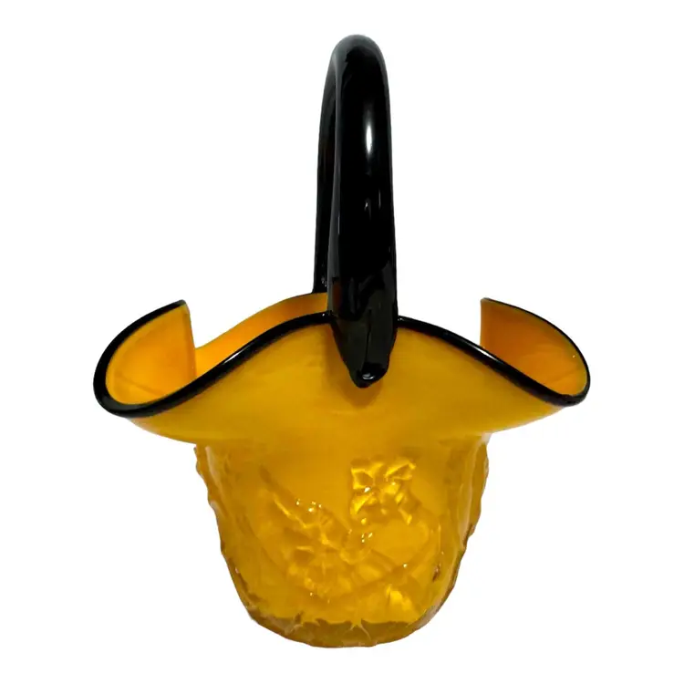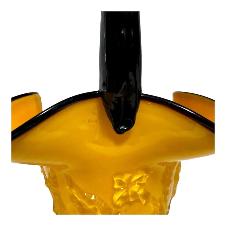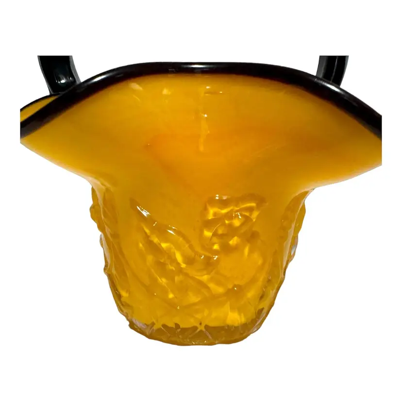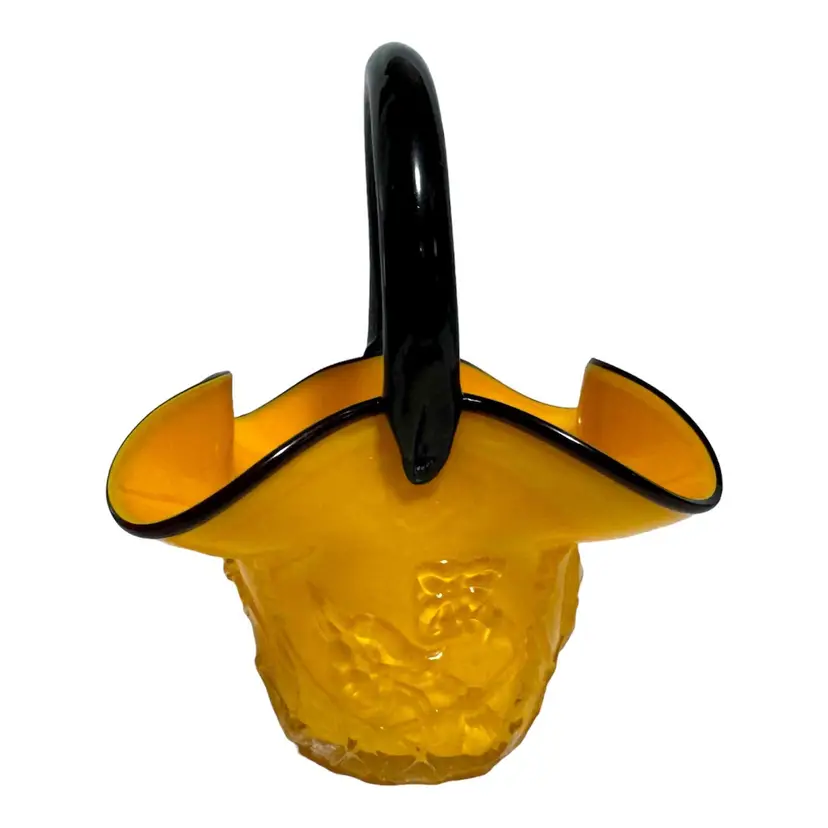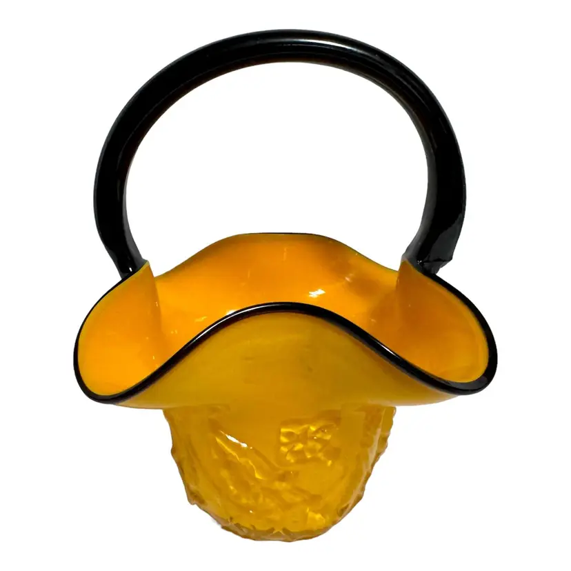 Tango Art Glass Basket 7 inch tall Vibrant Orange And Black Trim And Handle Cased Glass Floral Pattern Hand Blown With Pontil No Defects No Repairs See Photos