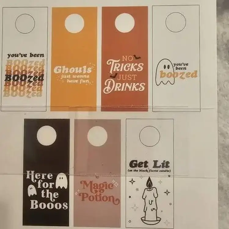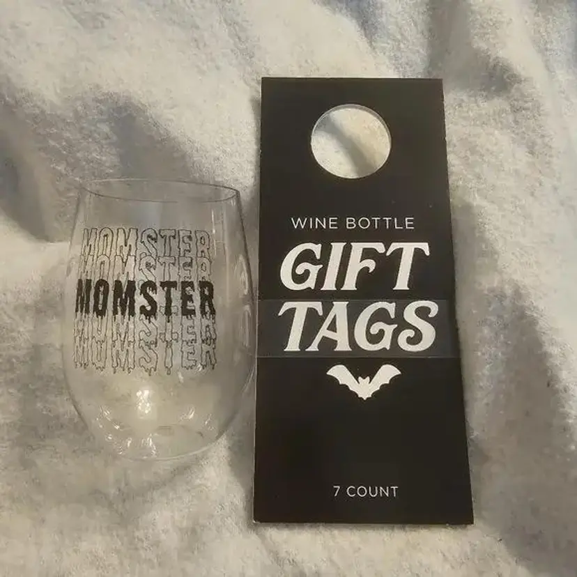Super cute gift bundle. Includes one plastic wine glass and a set of wine bottle tags.