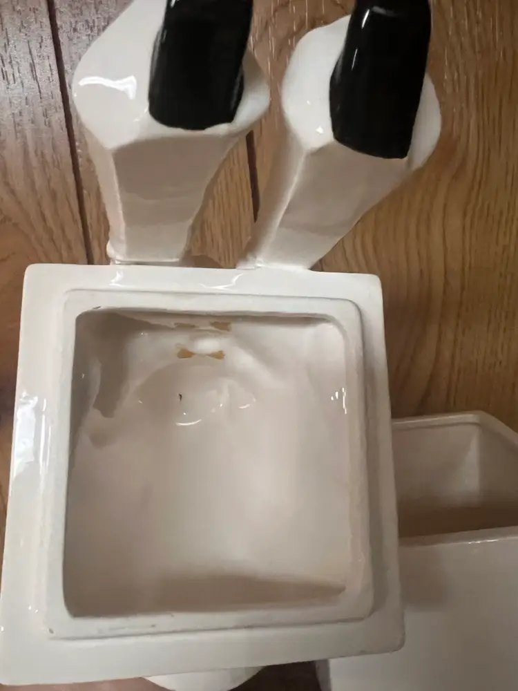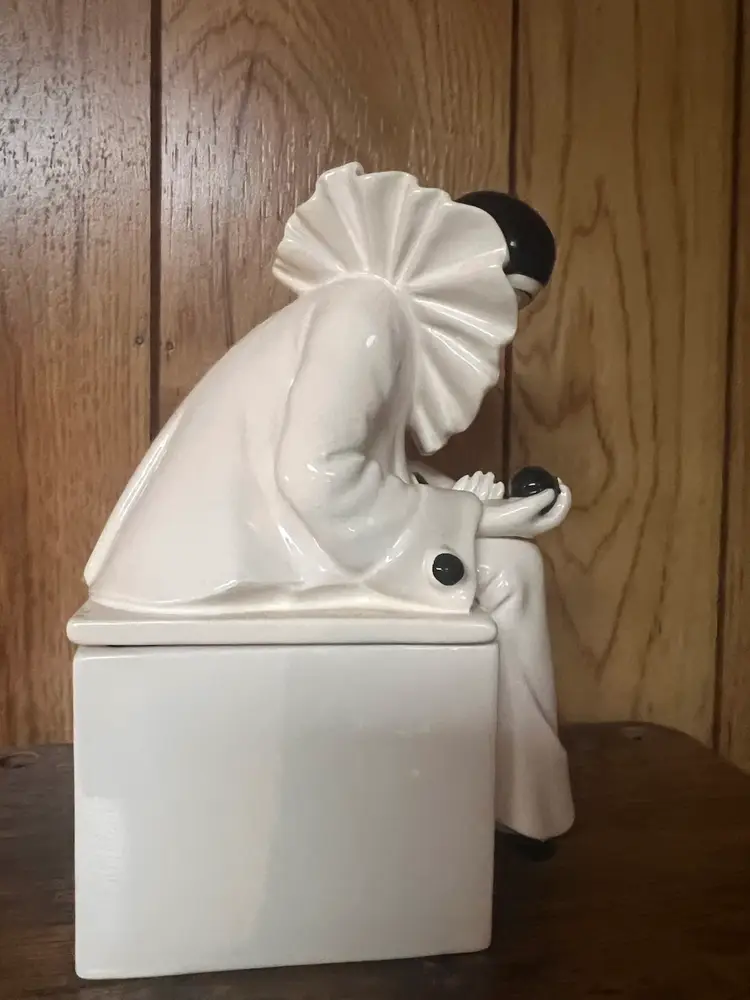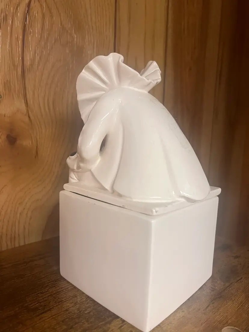 Lovely piece in great condition with label on bottom. Box measures 4”x4”x3” with top measuring 5 additional inches. The mime is 8” from head to toe.