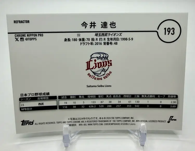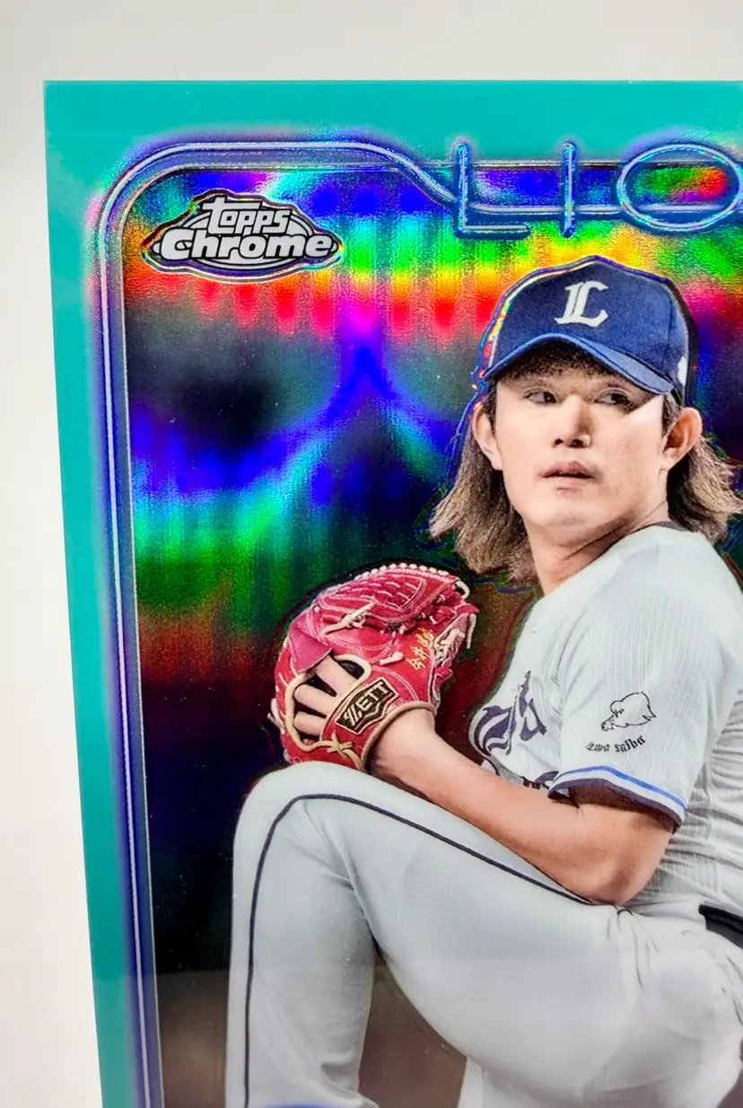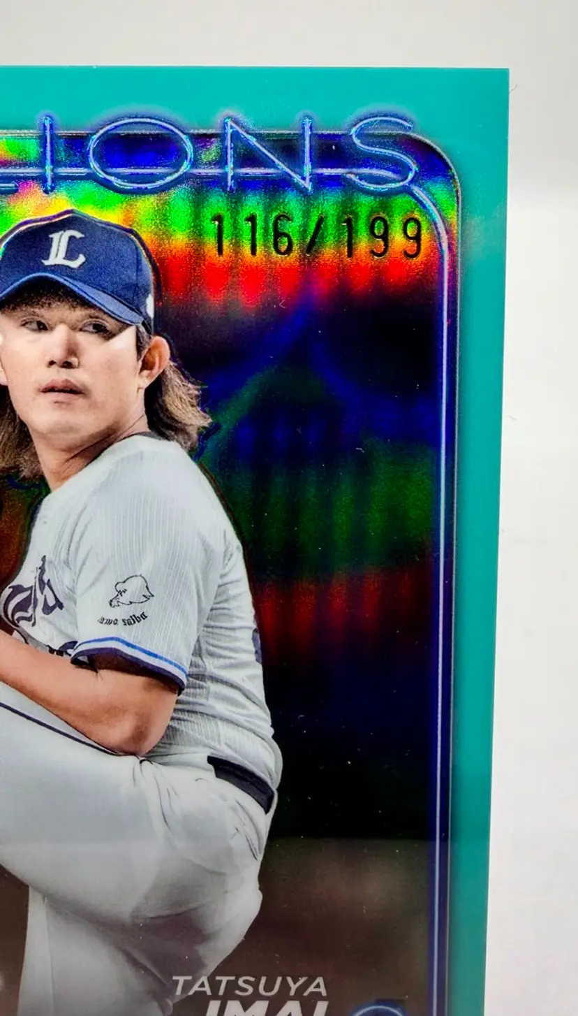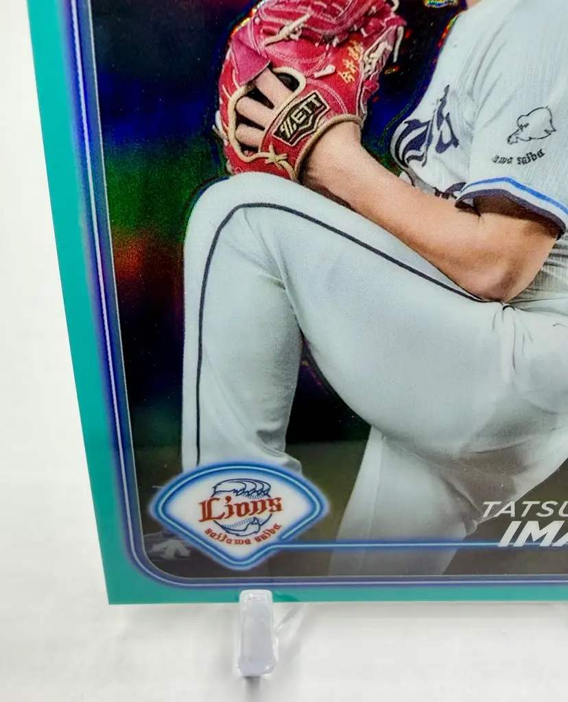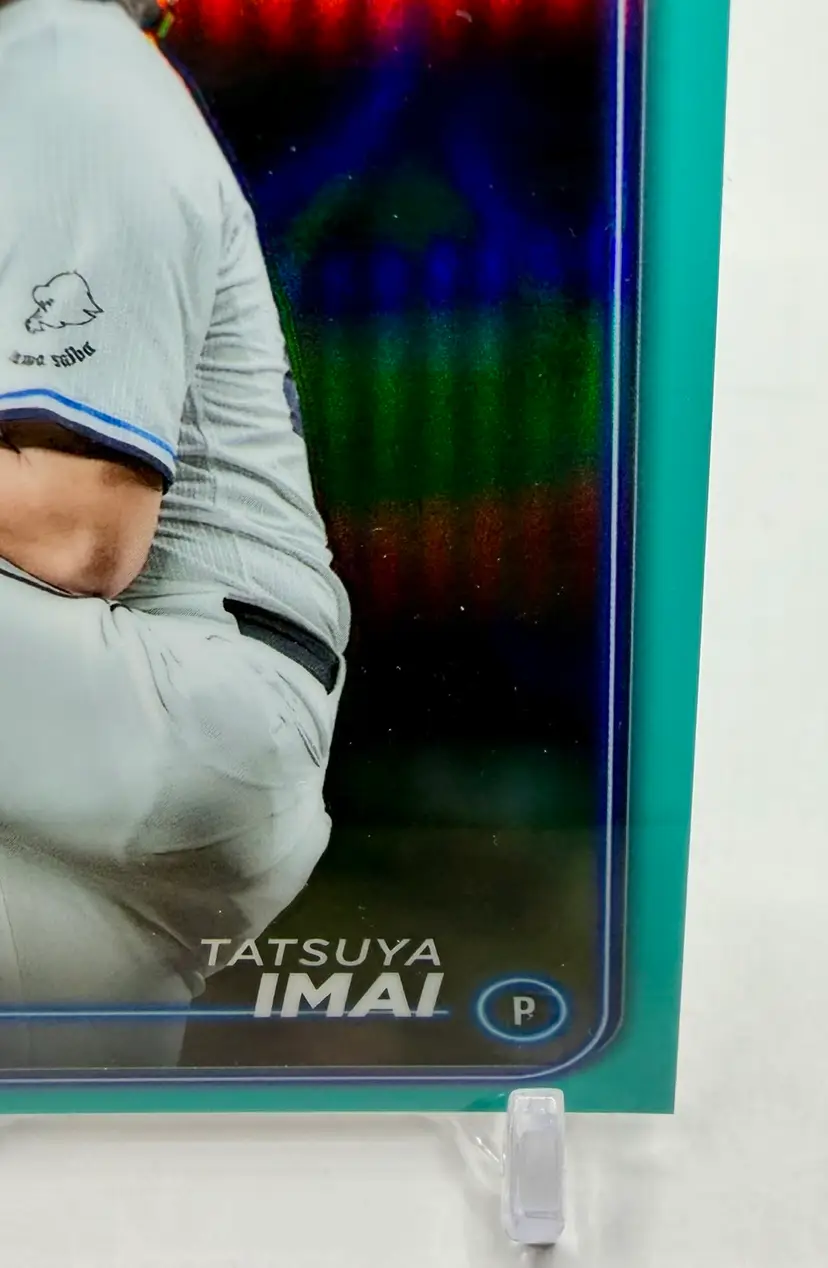 2024 Topps Chrome baseball trading card featuring Tatsuya Imai from the Houston Astros. This Aqua Refractor card is numbered out of 199 and is part of the Nippon Baseball League and Major League (MLB) sets. The card is manufactured by Topps in Japan and includes features like being serial numbered, a parallel variety, and part of the base set. It is a unique and collectible item for fans of baseball trading cards.