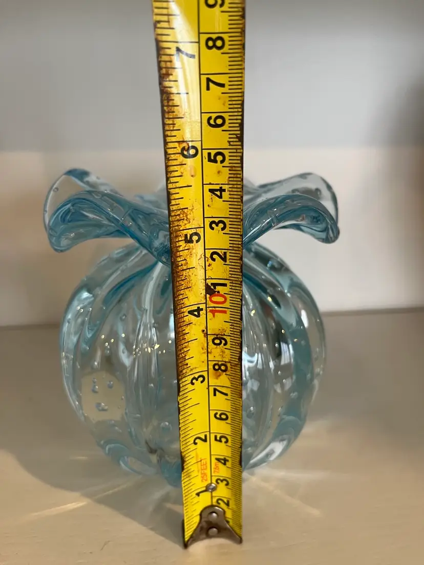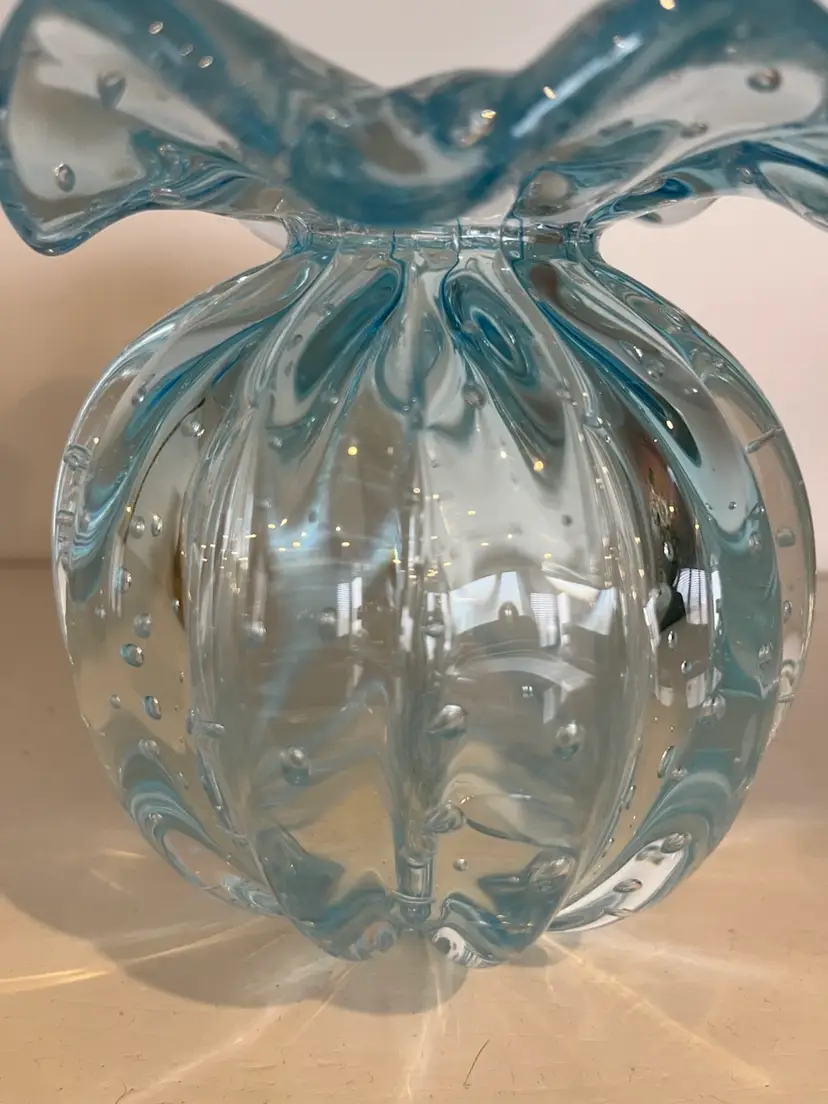 Beautiful hand-blown art glass vase in a soft aqua blue with controlled bubble (bullicante) design. The vase has a rounded, pumpkin-style body with vertical ribbing and a dramatic ruffled, flared rim. The suspended bubbles throughout the glass catch the light beautifully and give it a classic Murano-style look.