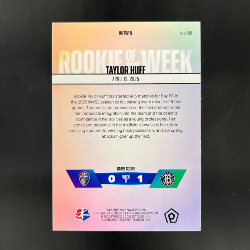 Taylor Huff 2025 NWSL Parkside Pronto Rookie Of The Week Subscriber Exclusive /210 Soccer Card #ROW5