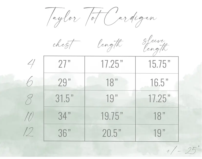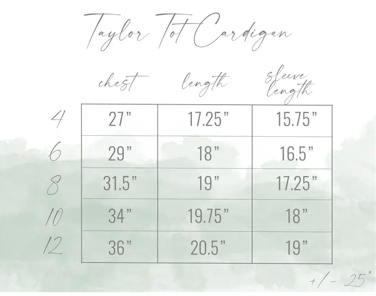 Introducing the perfect blend of style and comfort for your little trendsetter: our Taylor Tot Sized Cardigan. Crafted with meticulous care and attention to detail, this cardigan is designed to keep your child cozy and looking effortlessly chic from ages 4T to 12 years.