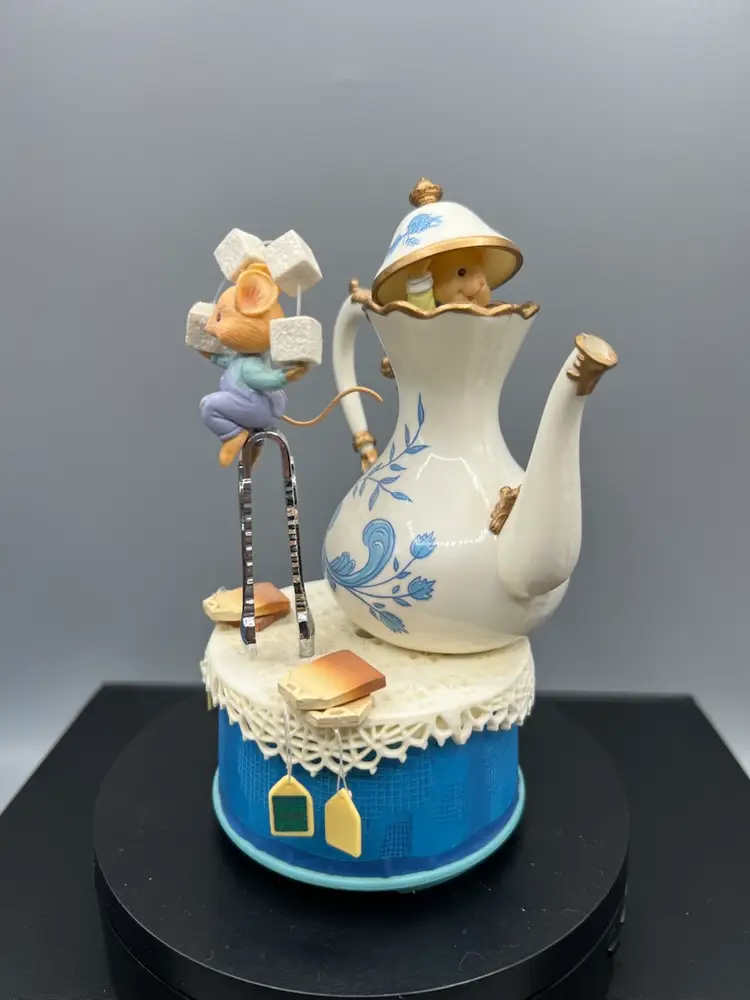 This vintage collectible item is a 1995 Enesco "Tea for Two" wind-up music box featuring a teapot, mice figures, and a blue delft-style floral pattern.