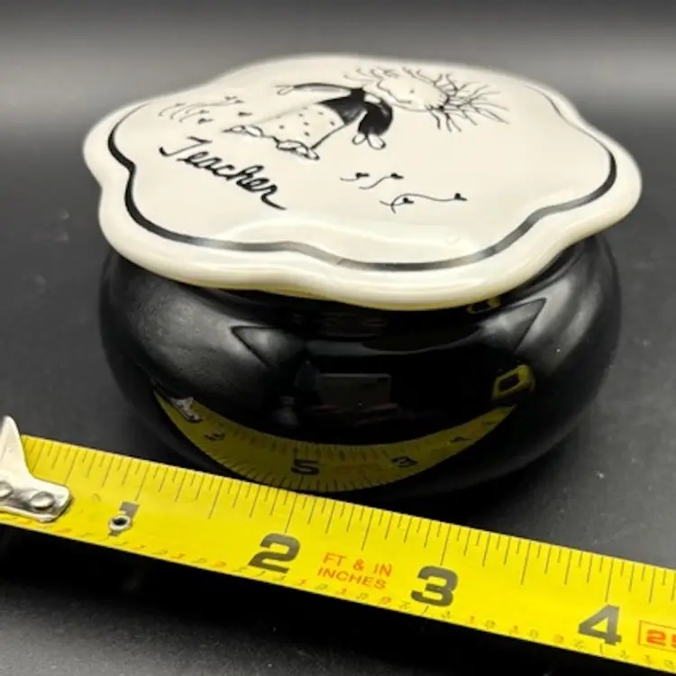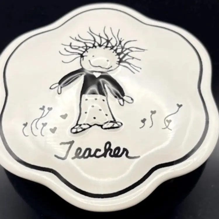 This charming trinket box from Enesco features the Children of the Inner Light design and is perfect for gifting on any occasion. The box is made of ceramic with a glazed finish, and measures 3.25 inches in size. The design features a white color scheme with a shaped pattern, and depicts a teacher theme. Sweet sentiment inside the box.