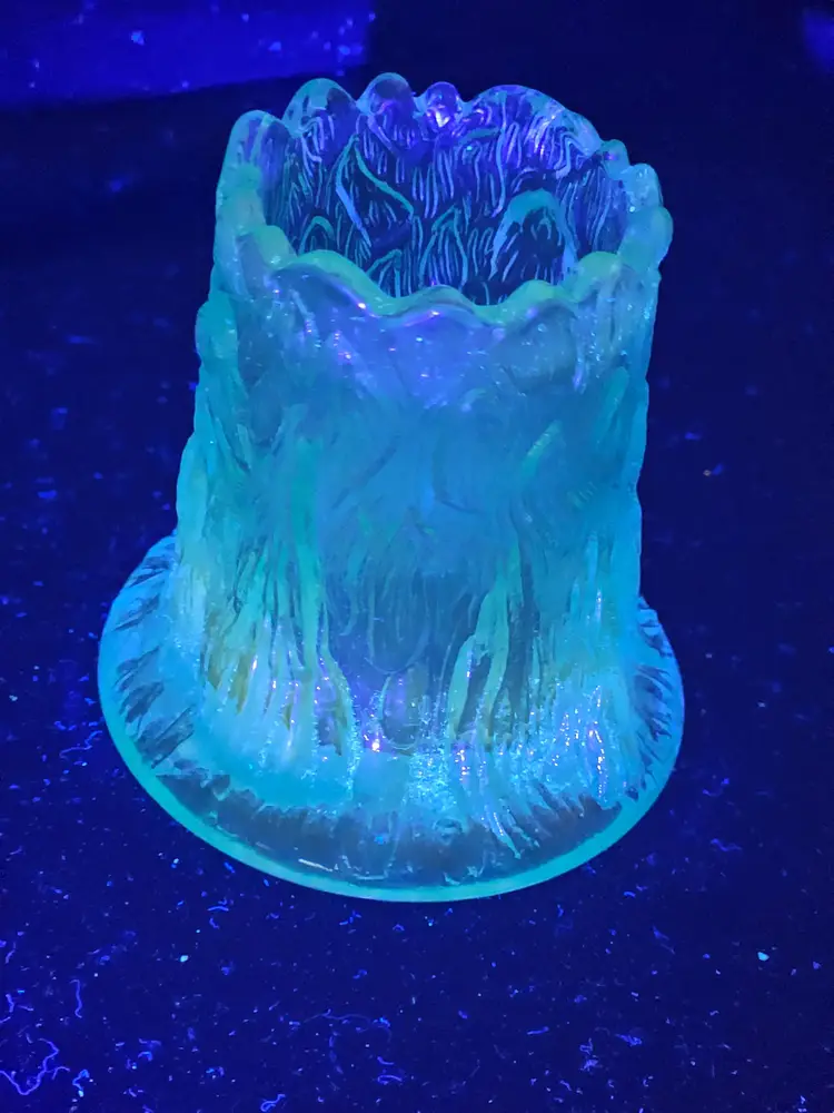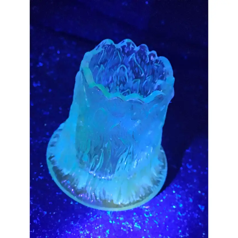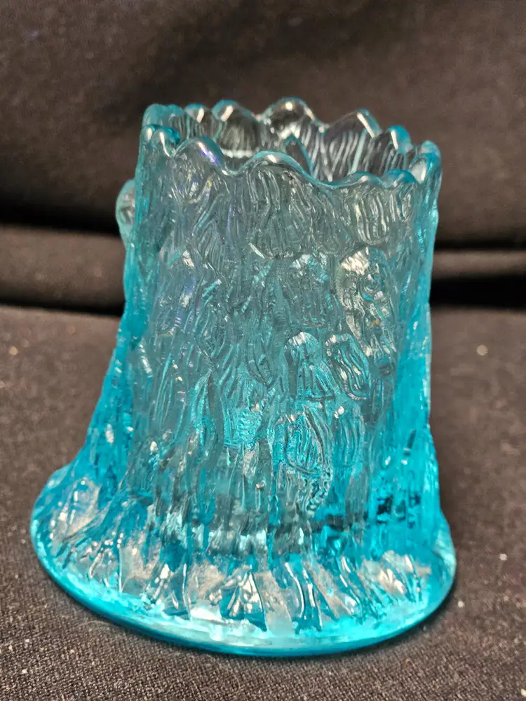 Maker: Robert Hansen Height: 2 1/2" Glows: Yes Description: Nice little tea//blue glass toothpick holder. Nice little tree stump design. It is in good condition with no chips or cracks.