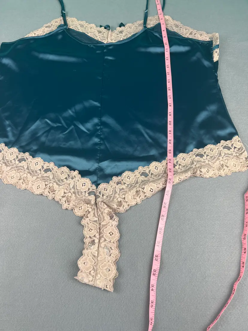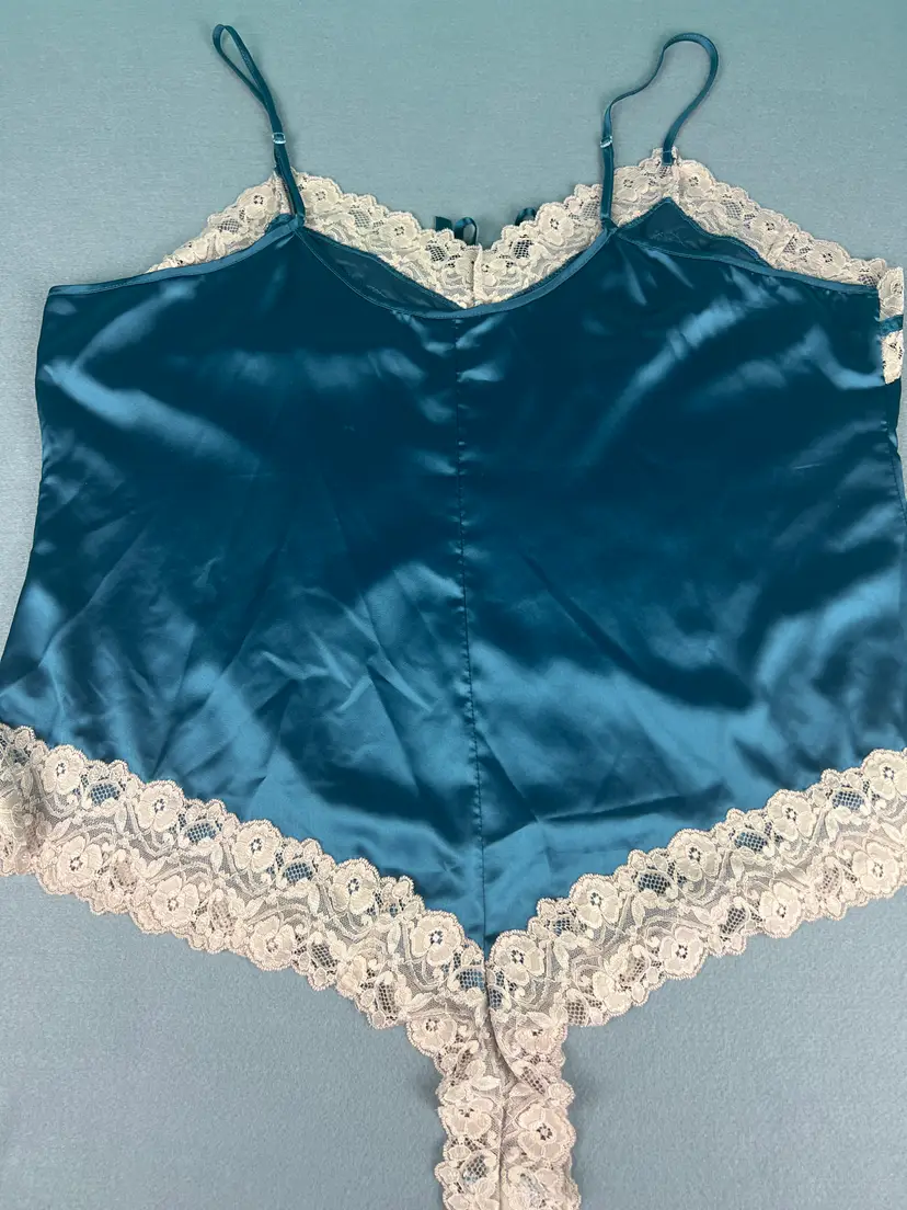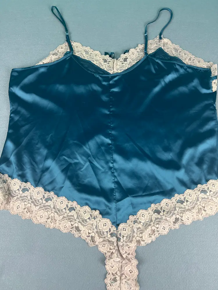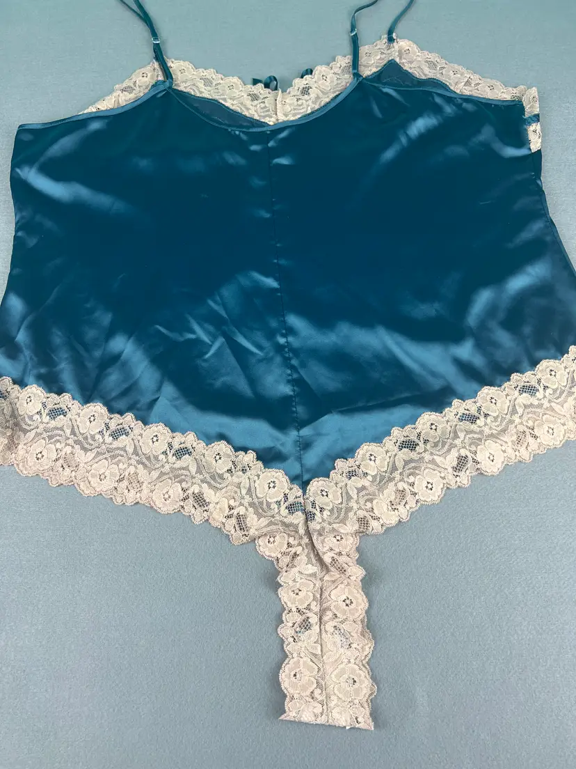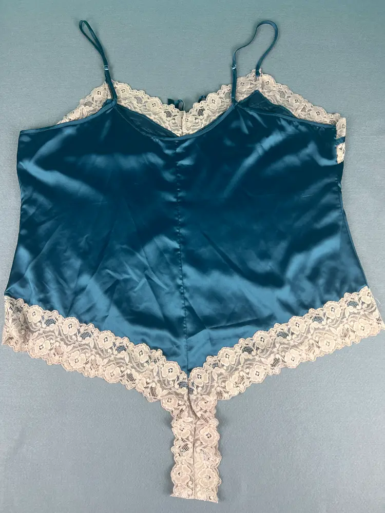 Teal satin teddy lingerie piece with soft sheen fabric and delicate cream lace trim along neckline and hem. Features adjustable straps and a snap closure bottom for ease of wear.