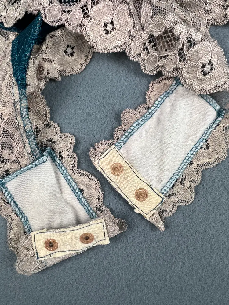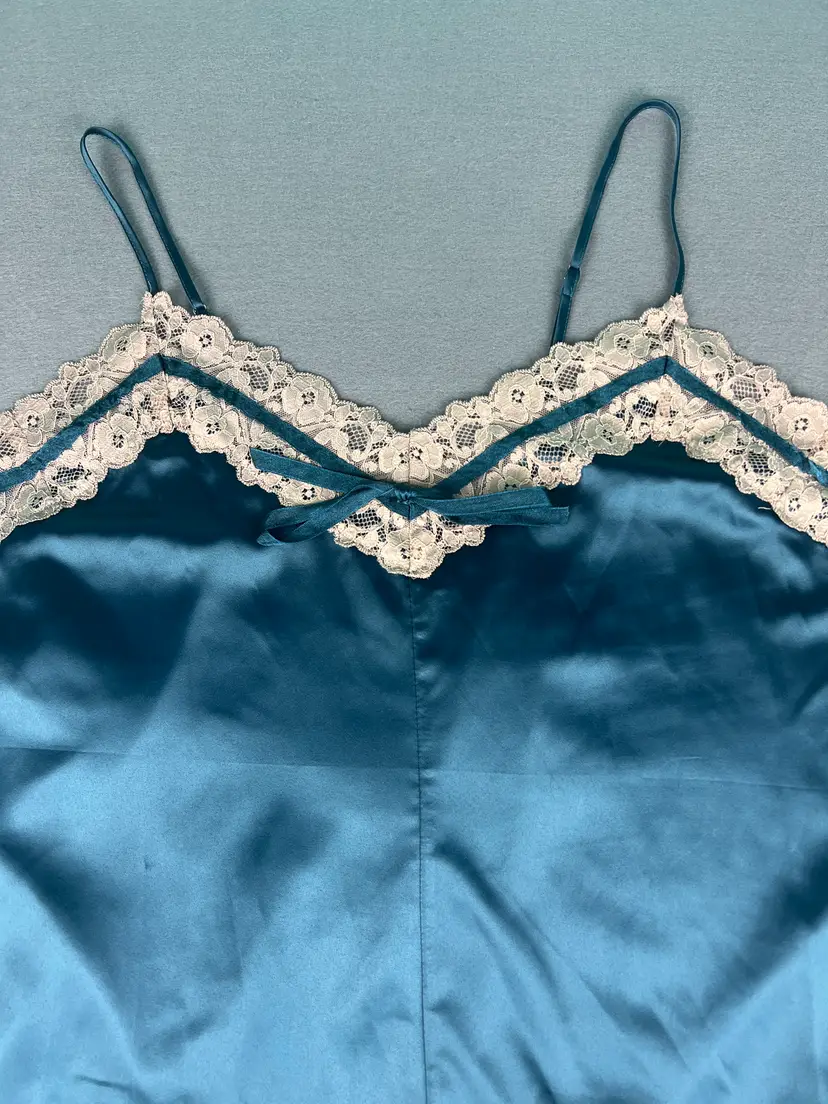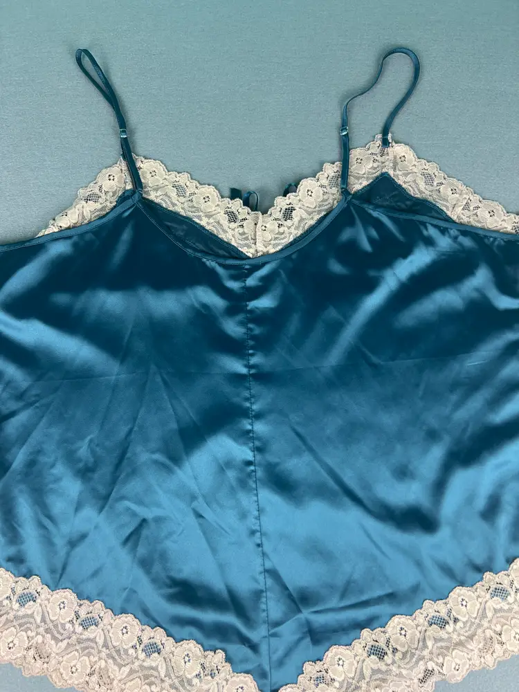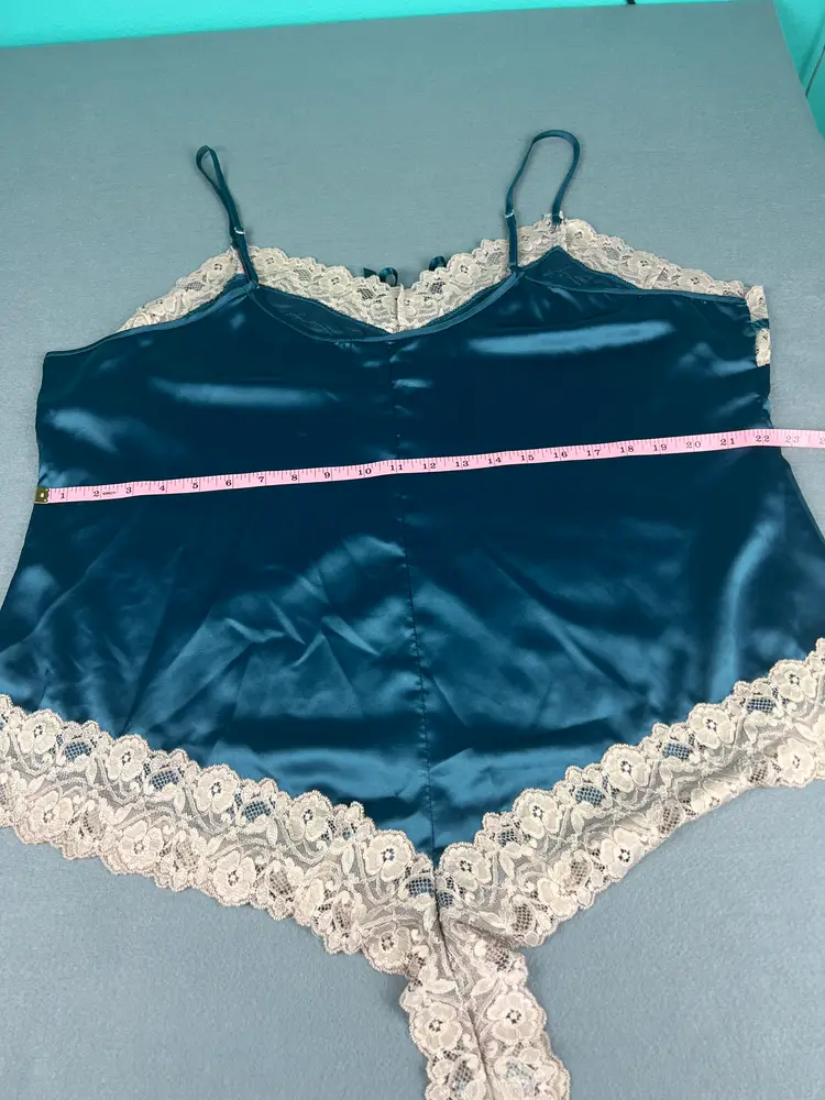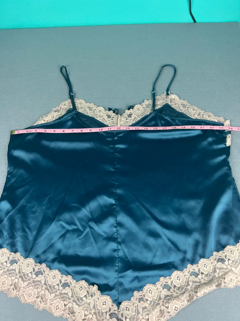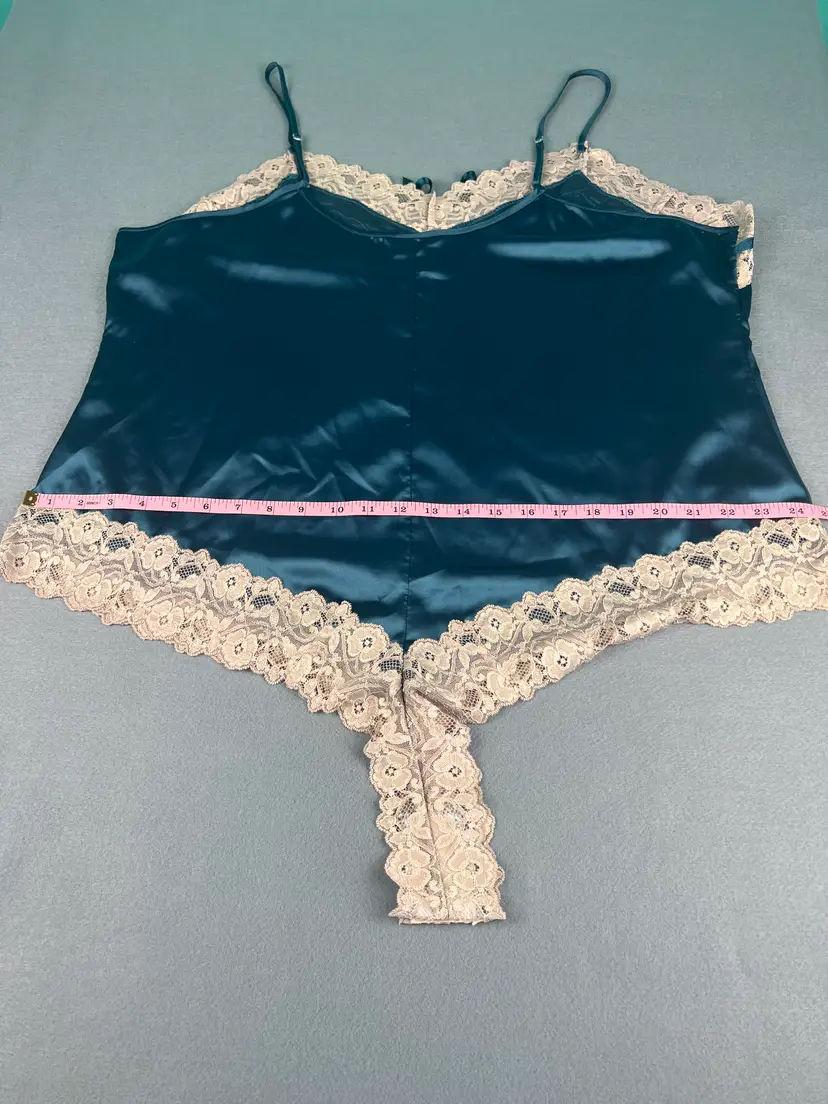 Teal satin teddy lingerie piece with soft sheen fabric and delicate cream lace trim along neckline and hem. Features adjustable straps and a snap closure bottom for ease of wear.