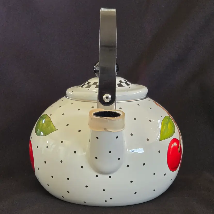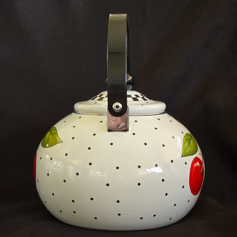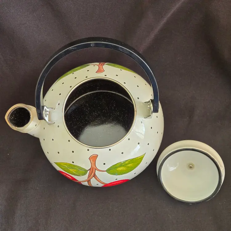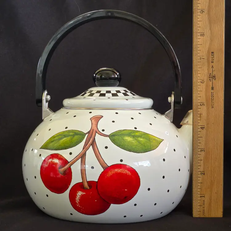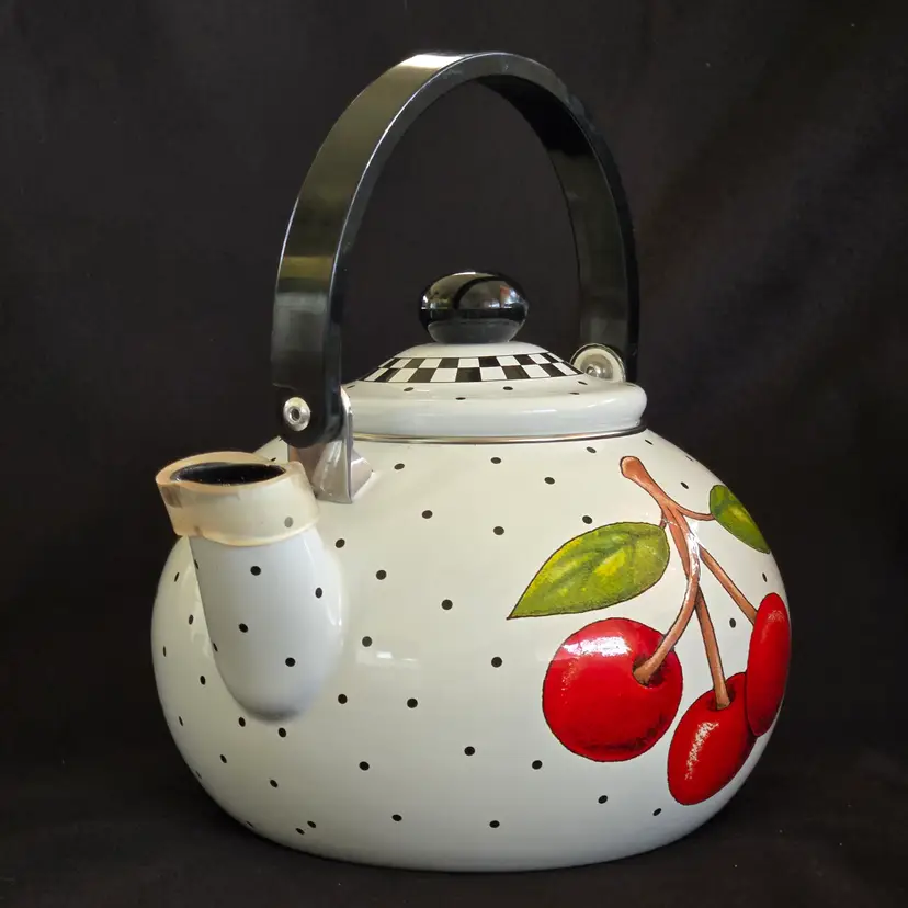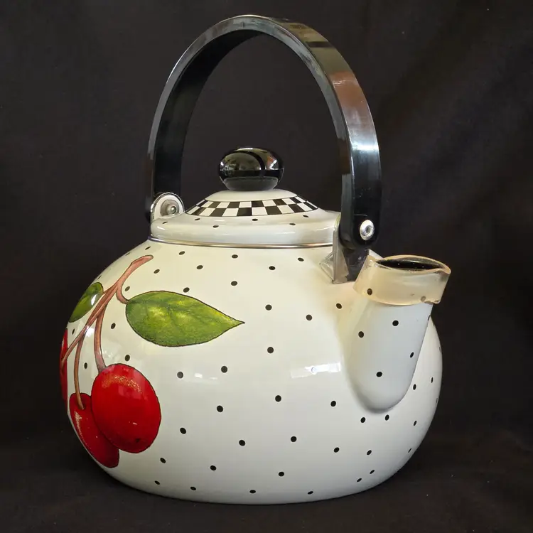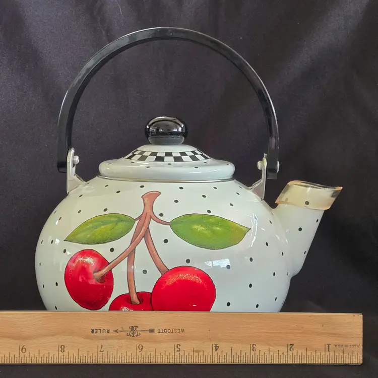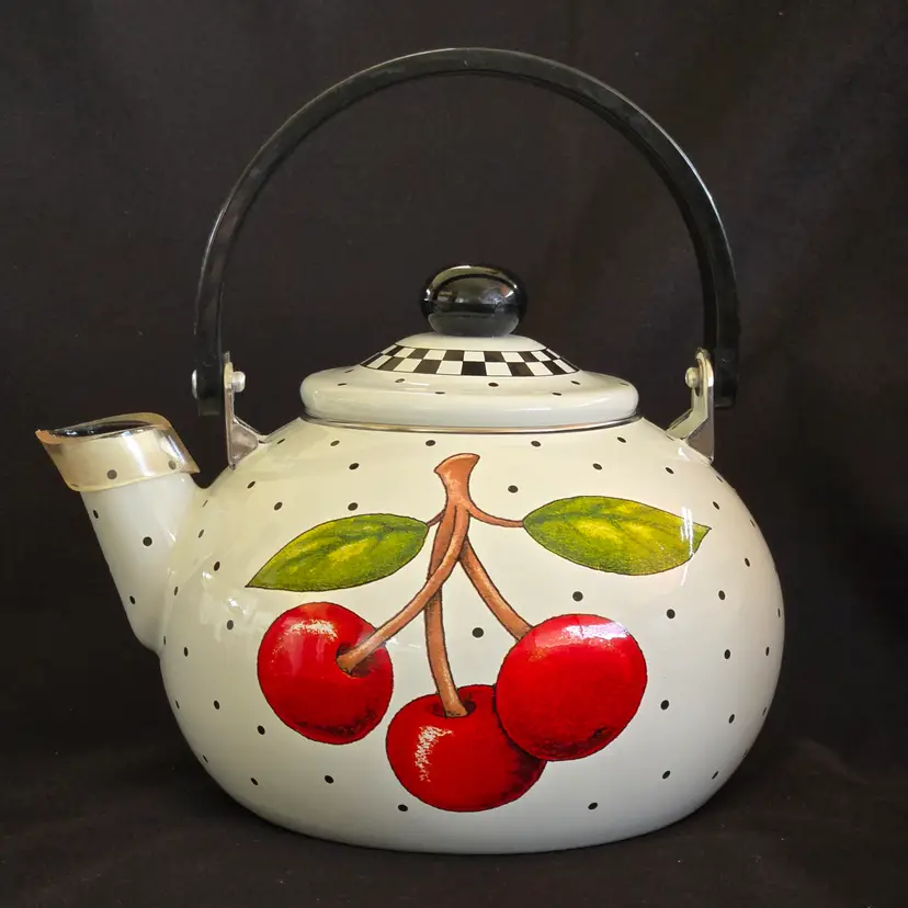 Teapot Cherries Mary Engelbreit Enameled Metal Tea Kettle Kitchen Full Size Vintage. Used condition with some small missing color on cherries, scratches on black plastic knob, plastic protector on spout along with spots on metal spout, otherwise no extensive signs of use. Please view all the photos and please ask any questions prior to purchase when possible.