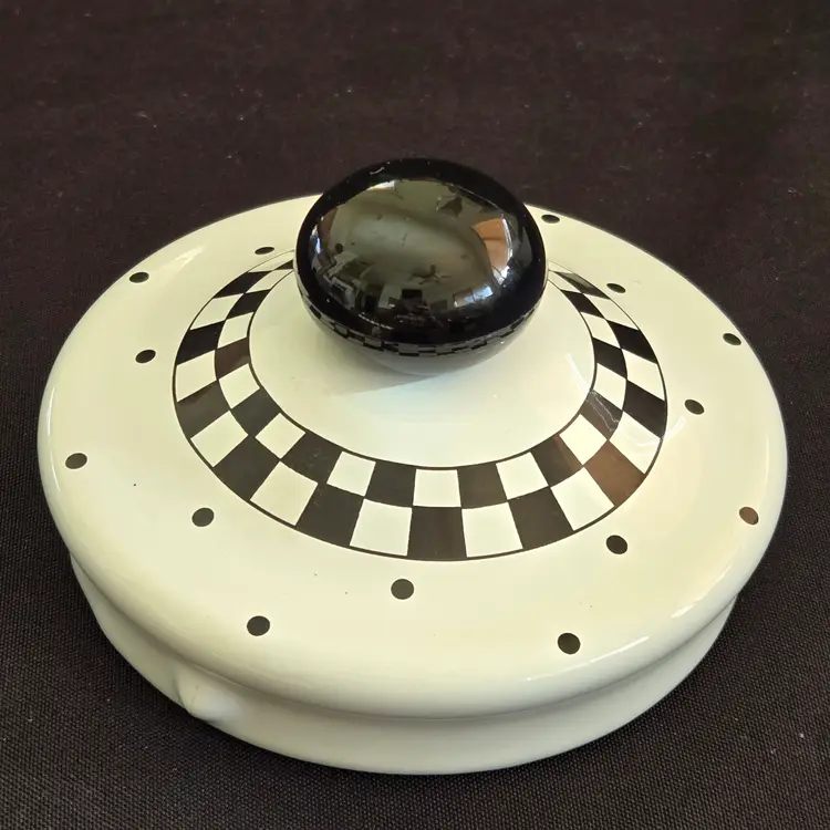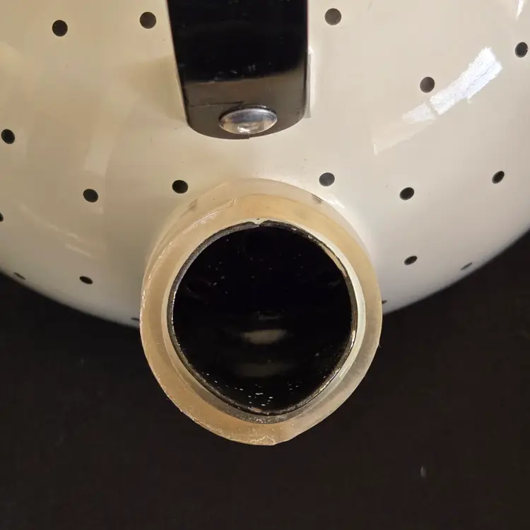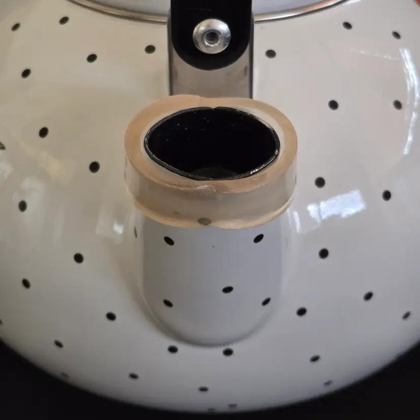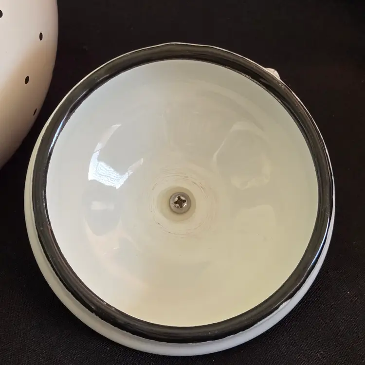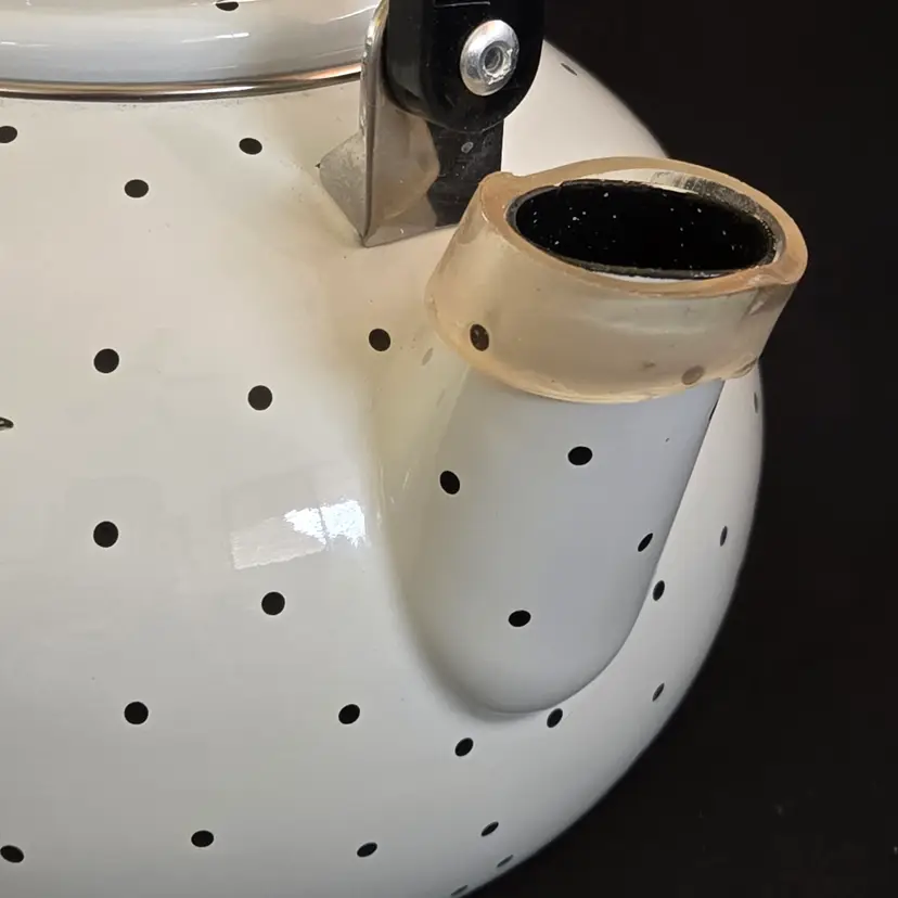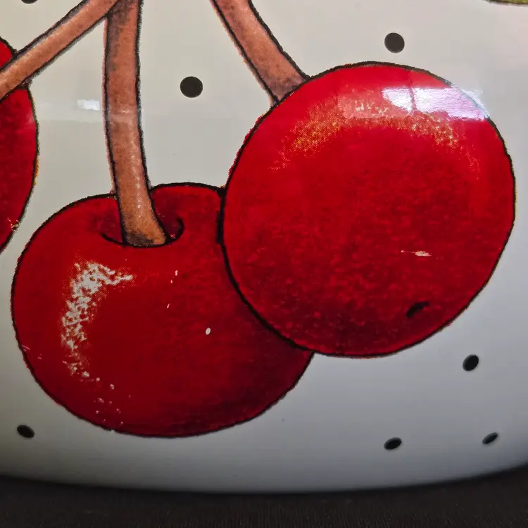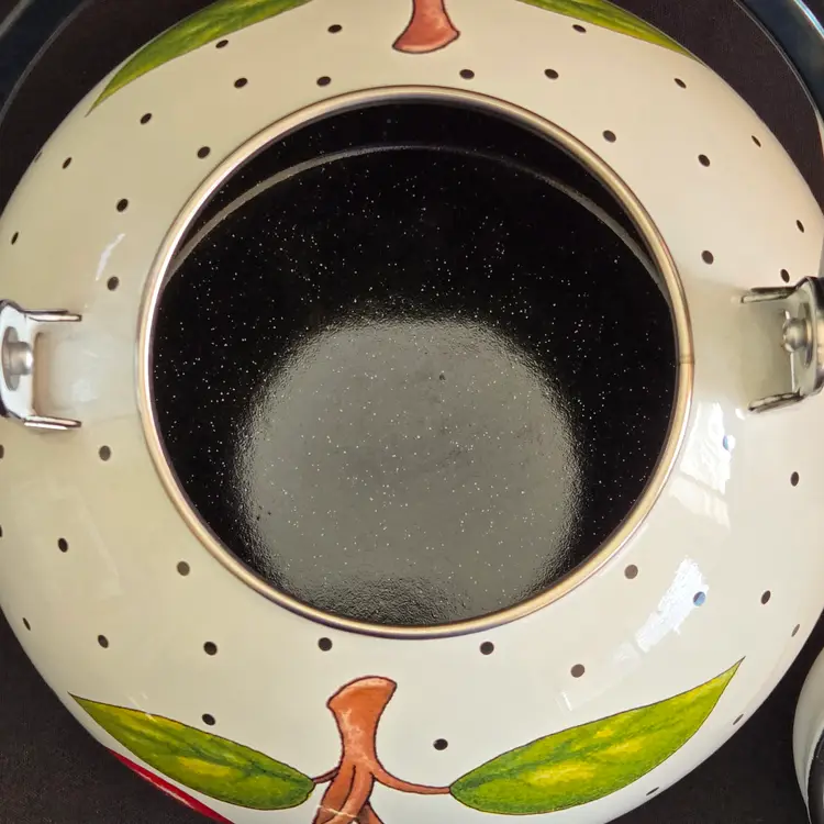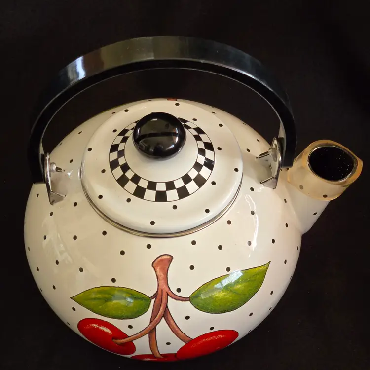 Teapot Cherries Mary Engelbreit Enameled Metal Tea Kettle Kitchen Full Size Vintage. Used condition with some small missing color on cherries, scratches on black plastic knob, plastic protector on spout along with spots on metal spout, otherwise no extensive signs of use. Please view all the photos and please ask any questions prior to purchase when possible.
