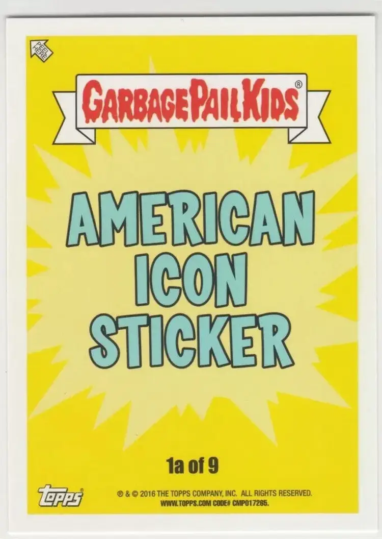 Related ID: overourheadz Card Size: Standard Autographed: No Set: Series 1: As American as Apple Pie (in Your Face!) Subset: American Icon Sticker Store ID: American Pop Cult Year Manufactured: 2016 Material: Card Stock Franchise: Garbage Pail Kids Original/Licensed Reprint: Original Vintage: No Series: 2016 American As Apple Pie In Your Face! Type: Non-Sport Trading Card Language: English Mononym: overourheads Manufacturer: Topps Features: Base Set, Sticker Genre: Comedy, Parody, Satire Card Type: trading card sticker Country/Region of Manufacture: United States