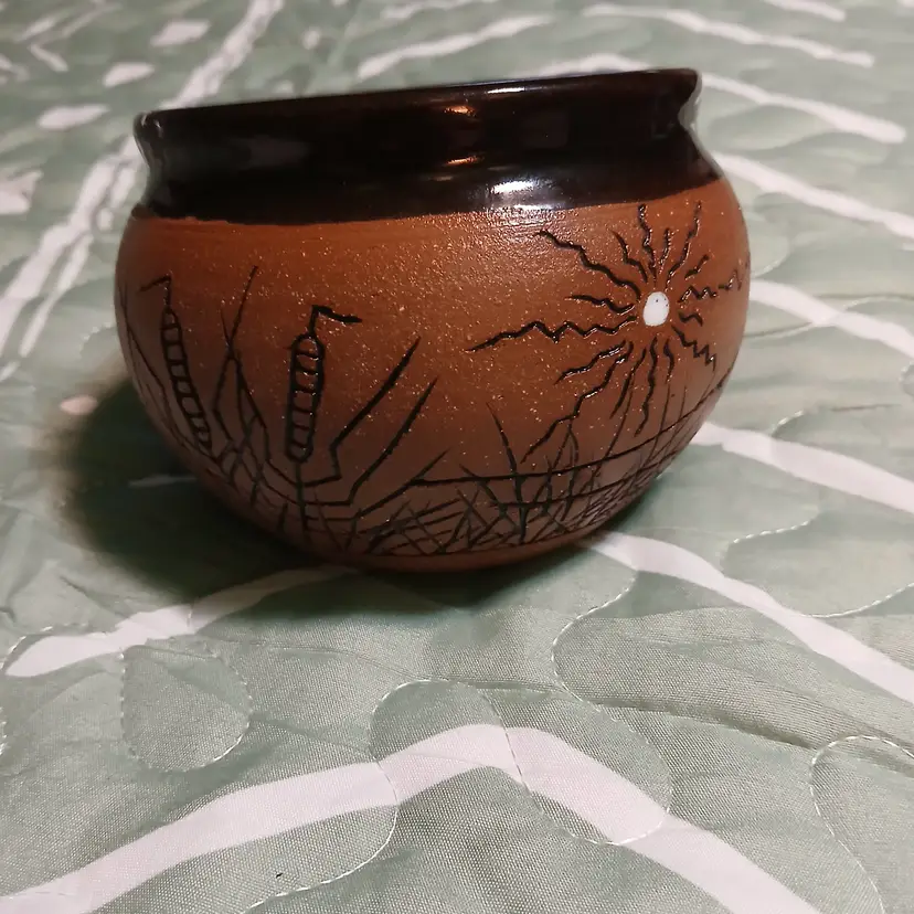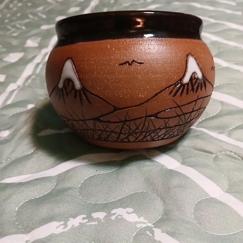 Intricate hand etched patterns of mountains and birds small pot sighed 1989 by Ted Olaf from Enterprise Oregon.