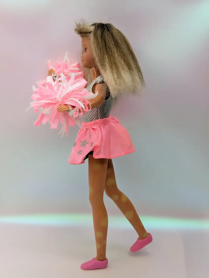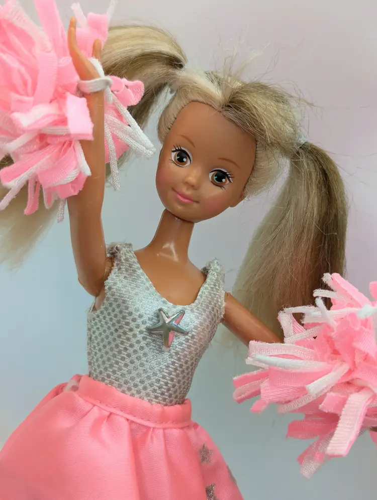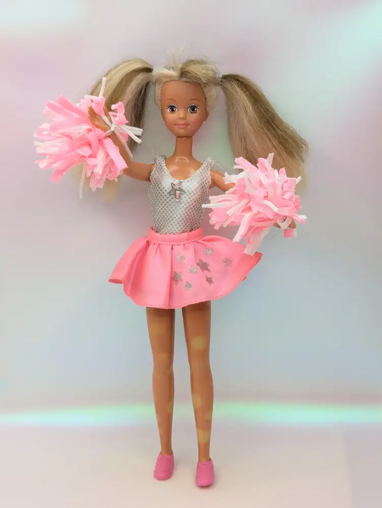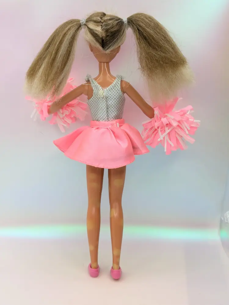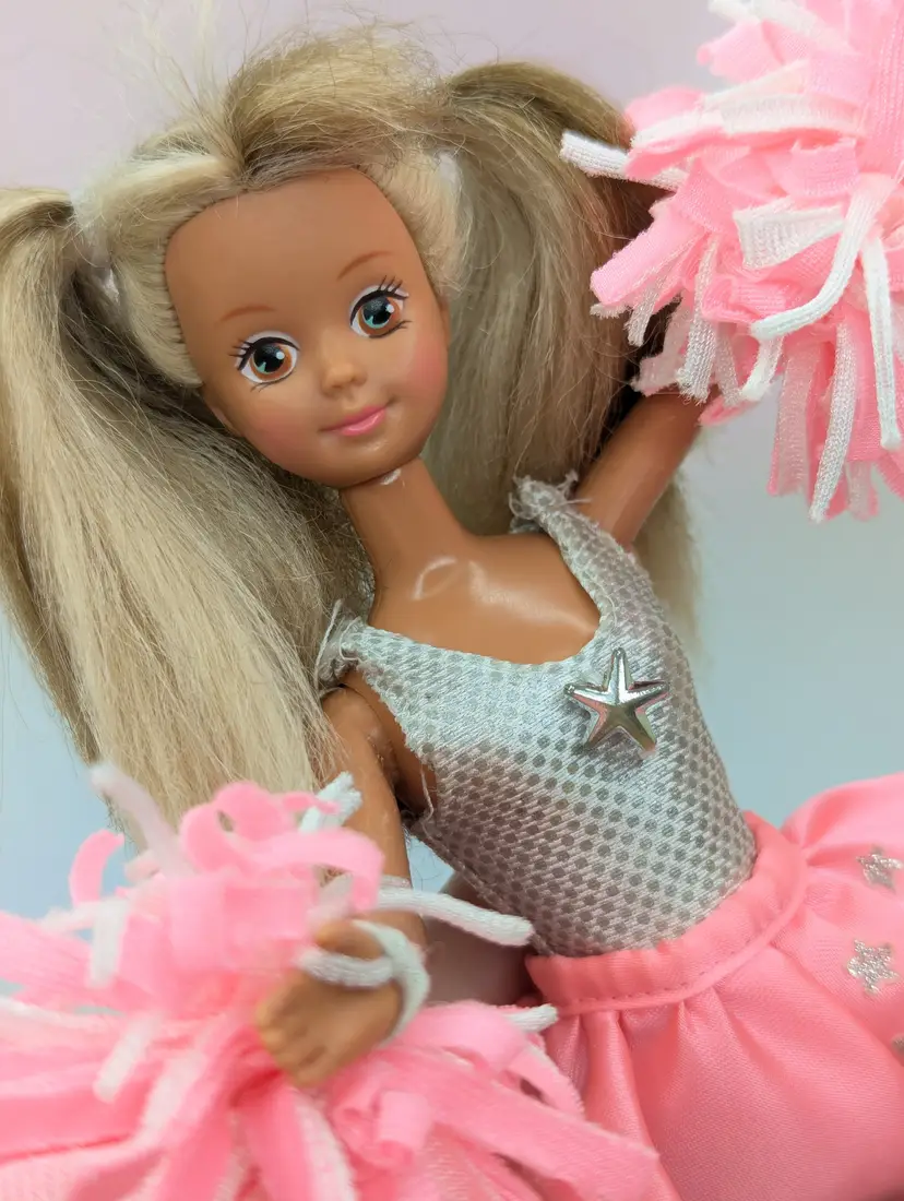 Vintage Teen Fun Cheerleader Skipper Doll Barbie from 1987 by Mattel #5893. Comes in most of her original outfit - No leggins or extra accessories but does have her pom poms. Clothing is in good condition, Some play wear, but no noticeable holes, rips, tears or stains. Comes with her shoes. Hair has been lightly cleaned, but could use a nice re-style. body - no broken or loose parts. holds a pose - She has discoloration spots on her legs, this is a normal occurrence in dolls this age, and sadly nothing to stop or cure it Comes from a smoke free, pet friendly home. Item has been lightly cleaned and stored away