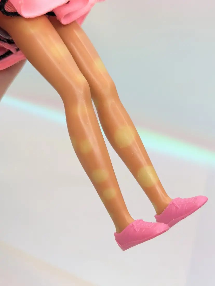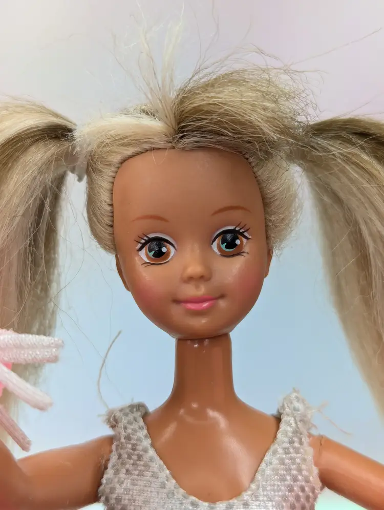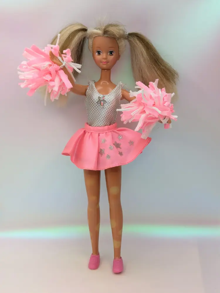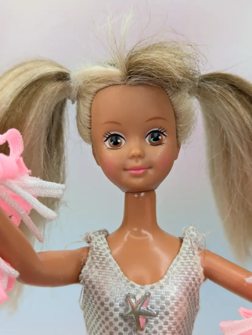 Vintage Teen Fun Cheerleader Skipper Doll Barbie from 1987 by Mattel #5893. Comes in most of her original outfit - No leggins or extra accessories but does have her pom poms. Clothing is in good condition, Some play wear, but no noticeable holes, rips, tears or stains. Comes with her shoes. Hair has been lightly cleaned, but could use a nice re-style. body - no broken or loose parts. holds a pose - She has discoloration spots on her legs, this is a normal occurrence in dolls this age, and sadly nothing to stop or cure it Comes from a smoke free, pet friendly home. Item has been lightly cleaned and stored away