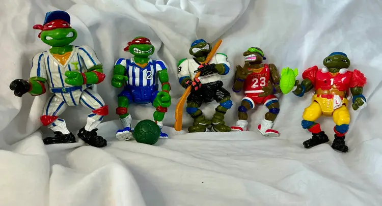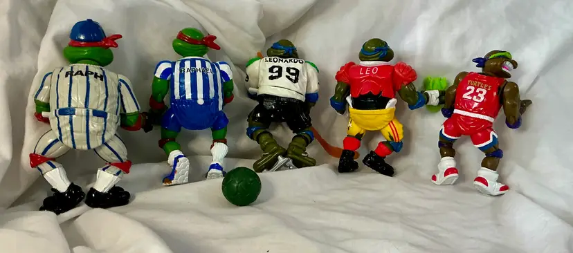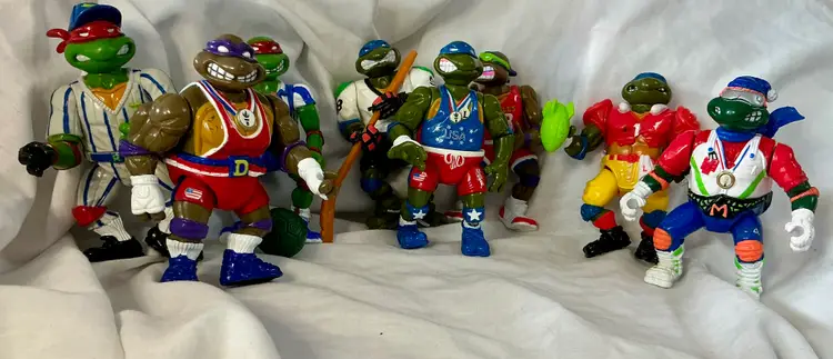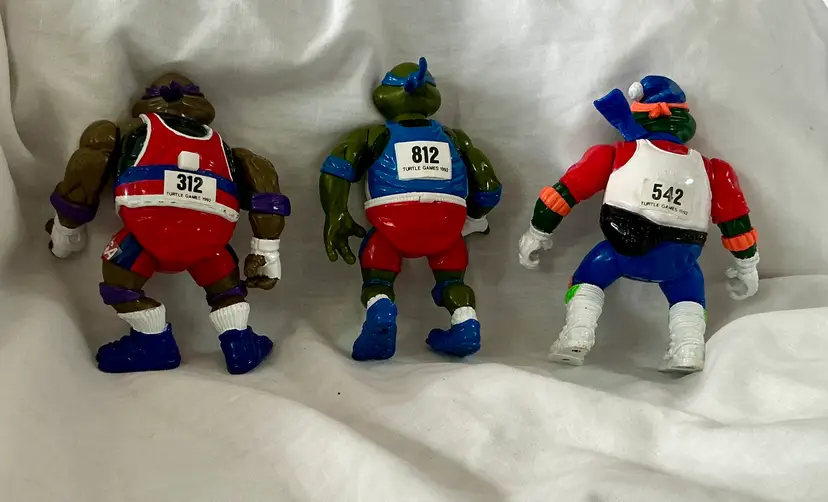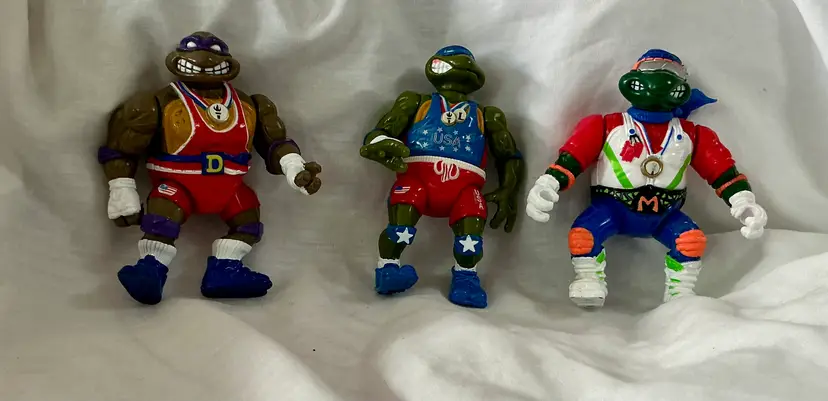 This product is a lot of 1990's action figures from the Teenage Mutant Ninja Turtles franchise, specifically inspired by the Olympic Games. Made by Playmates Toys, these vintage figures feature characters from the popular TV show and movie series, with a sports theme incorporated into their design. These collectible toys would be a great addition to any fan's collection, showcasing characters based on animal species like turtles in a unique and nostalgic setting.