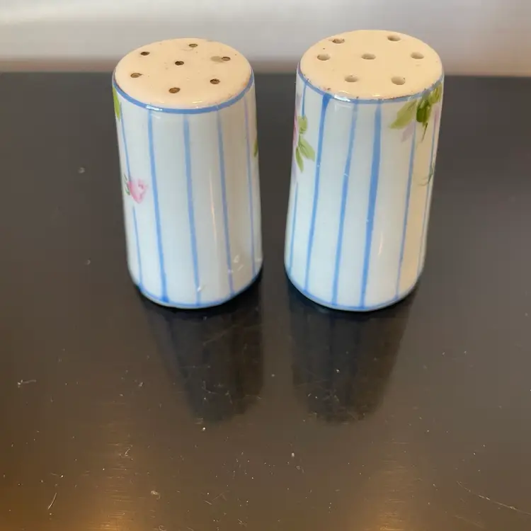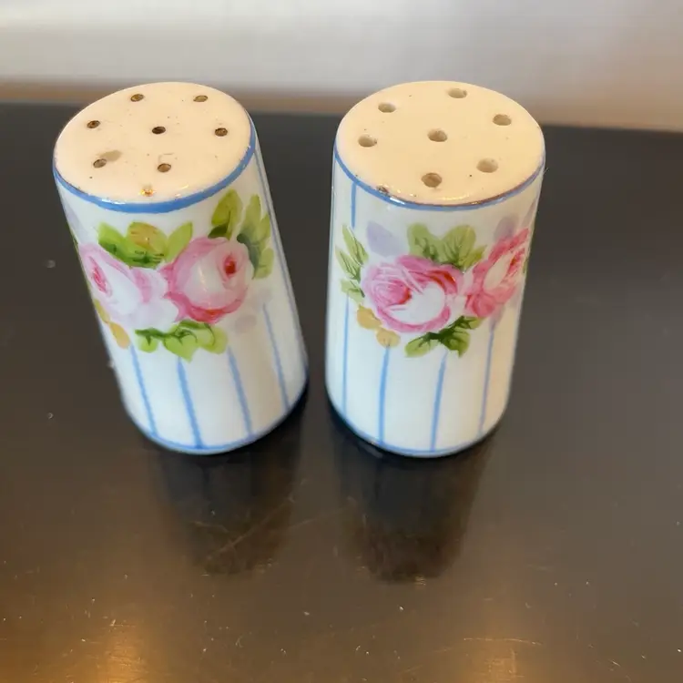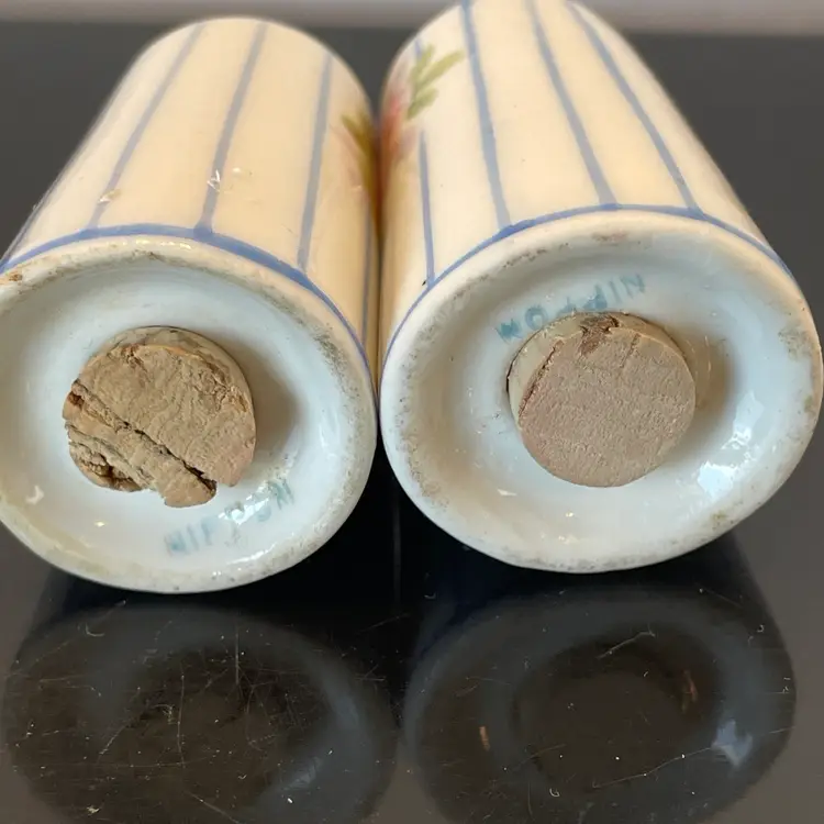 These shakers are marked Nippon fun pink flowers with blue stripes 2 inches tall each cork on bottom and great shape no chips or cracks. Save on shipping by buying more than one item .