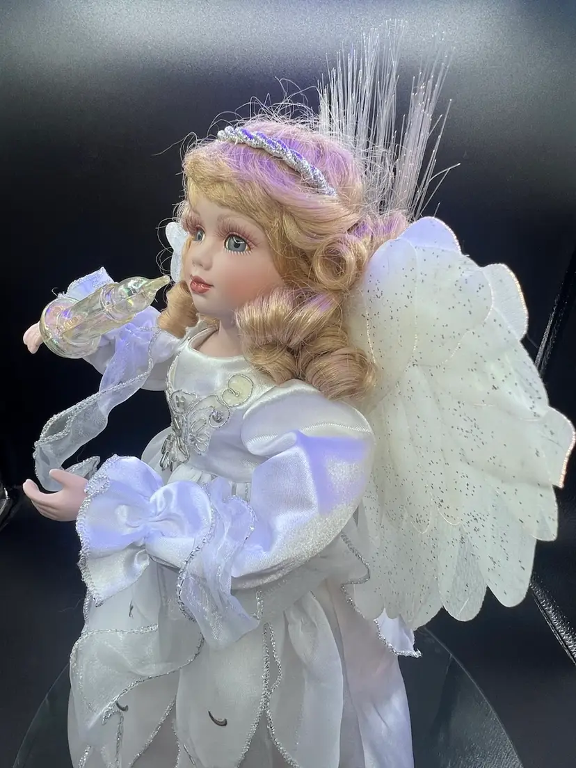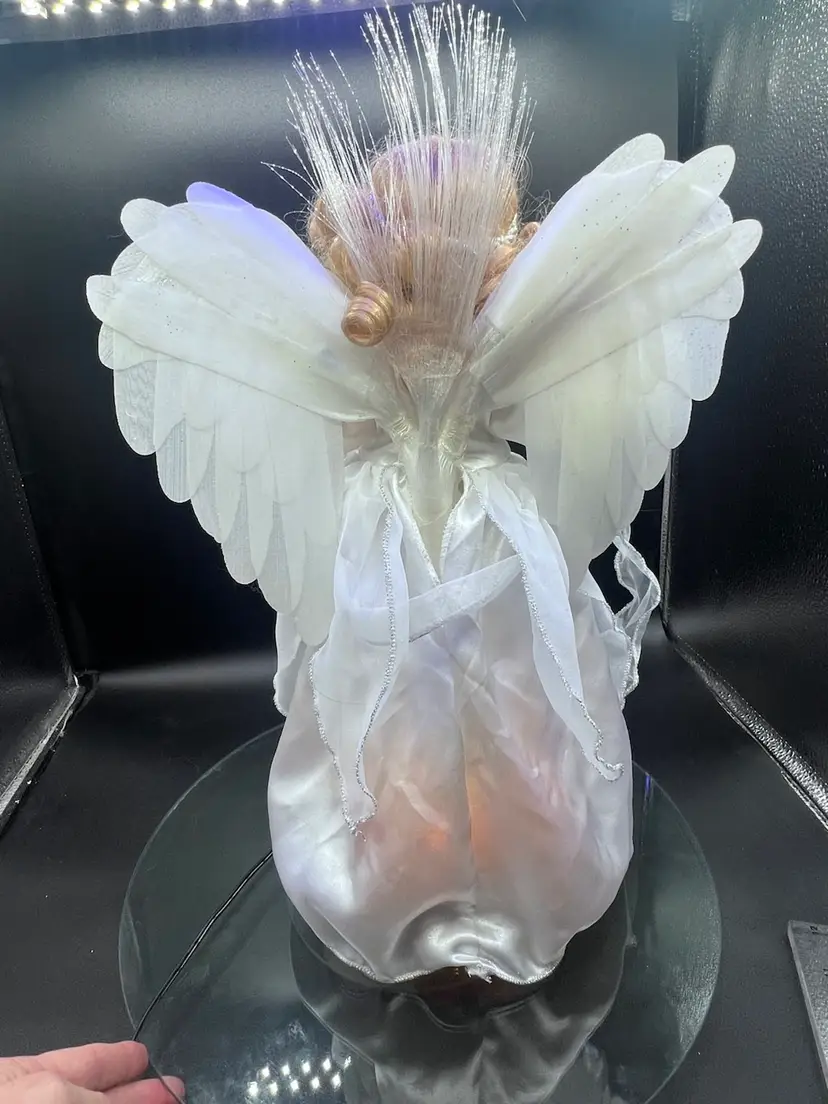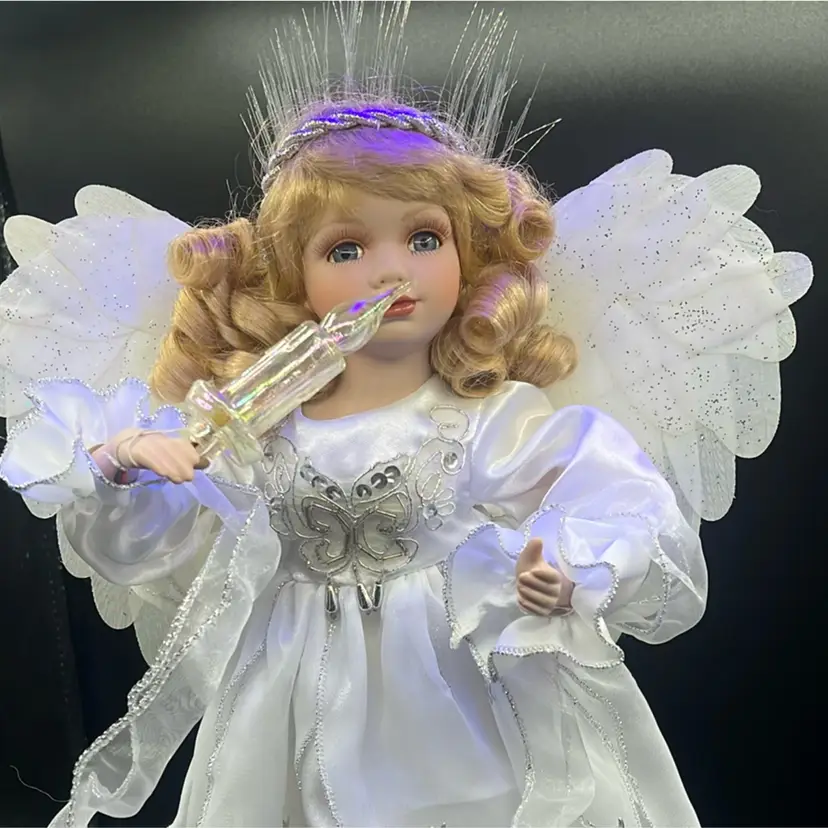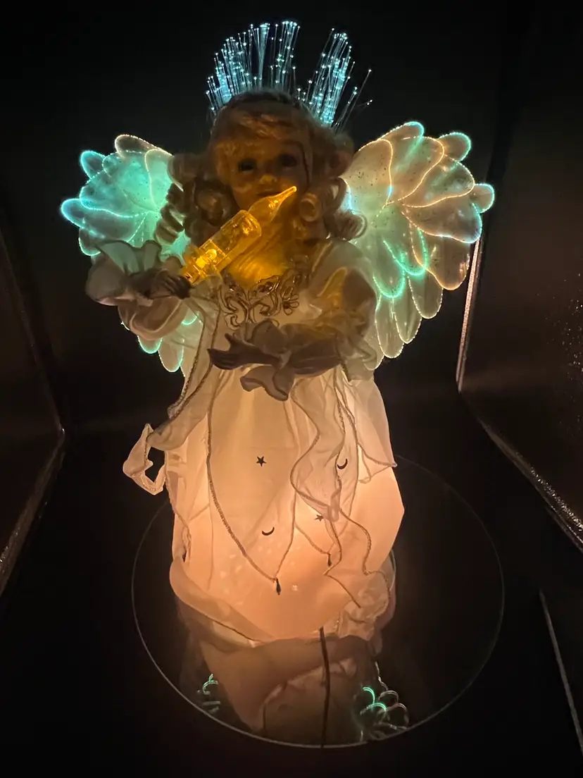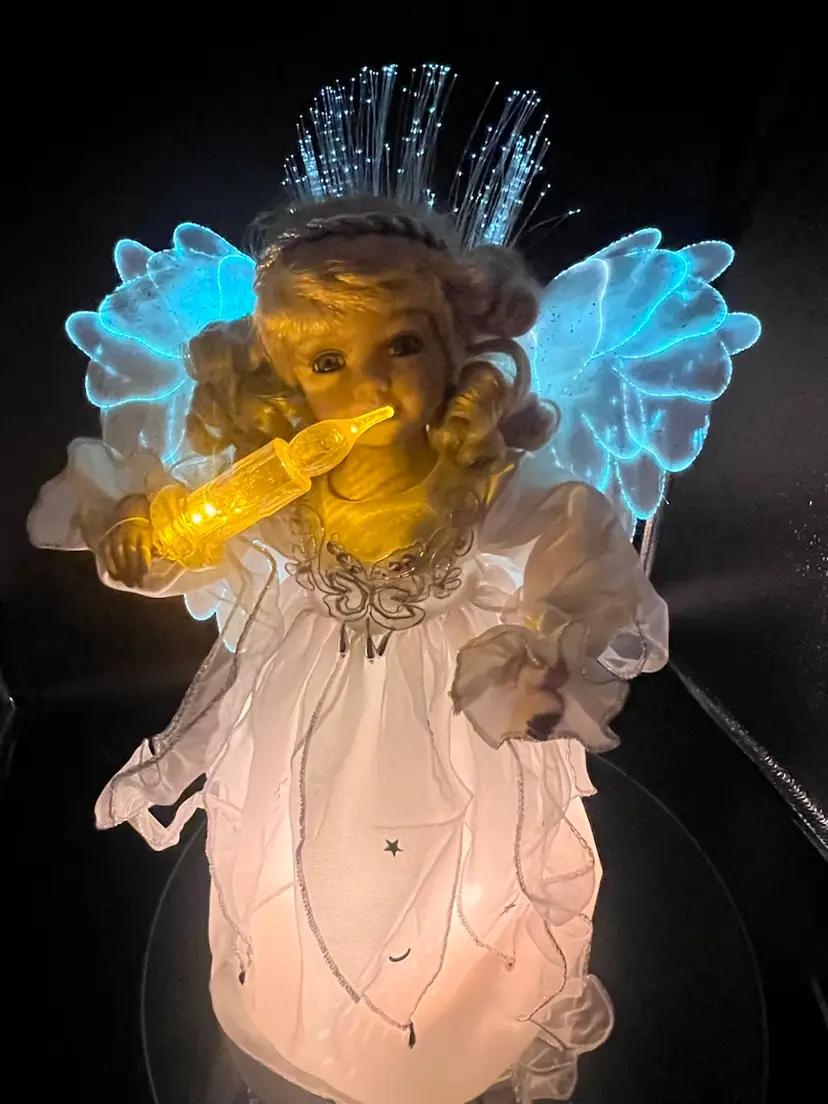 Key features include: It is a vintage item, with some models dating back to 1996. The figure is animated, with arms moving back and forth. It holds a huge lighted candelabra. The arms, legs, breastplate, and hare made of porcelain. Fiber optic Glittered wings Plug (WORKS) Embellished with stars and moon Please feel free to ask any questions Thank you for your time and interest Blessings, Bonnie & Darren :-)