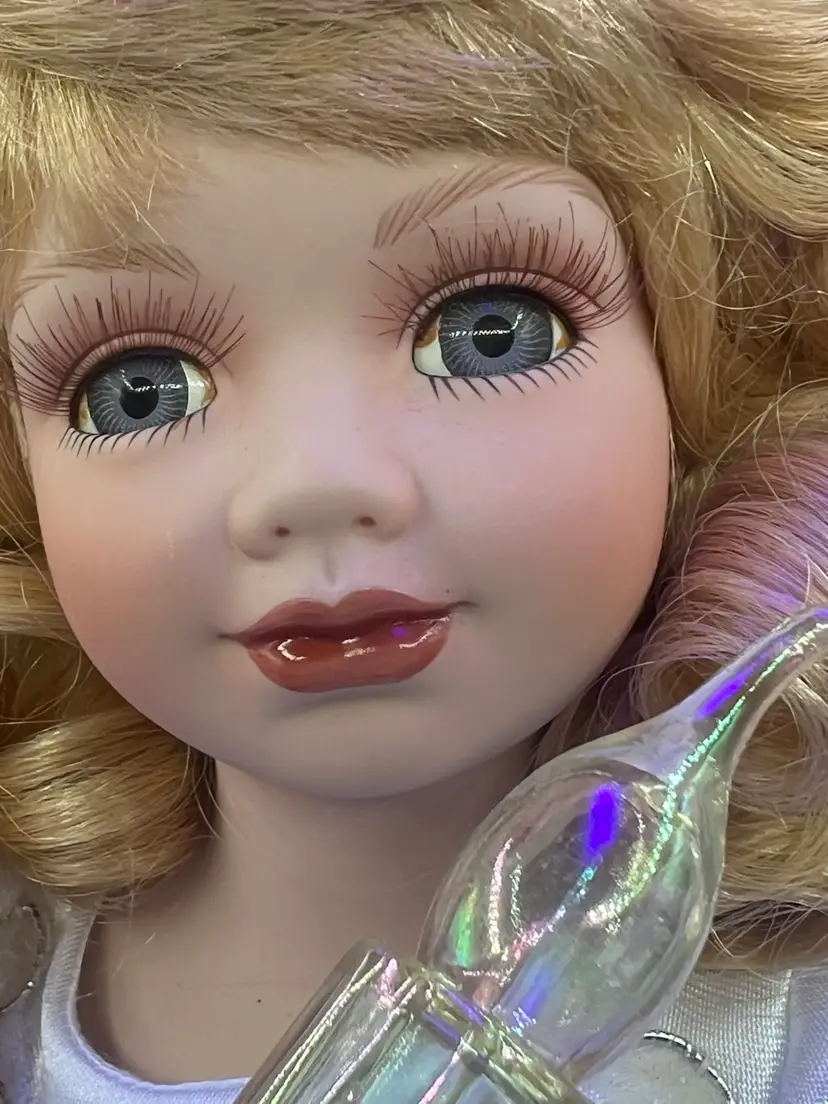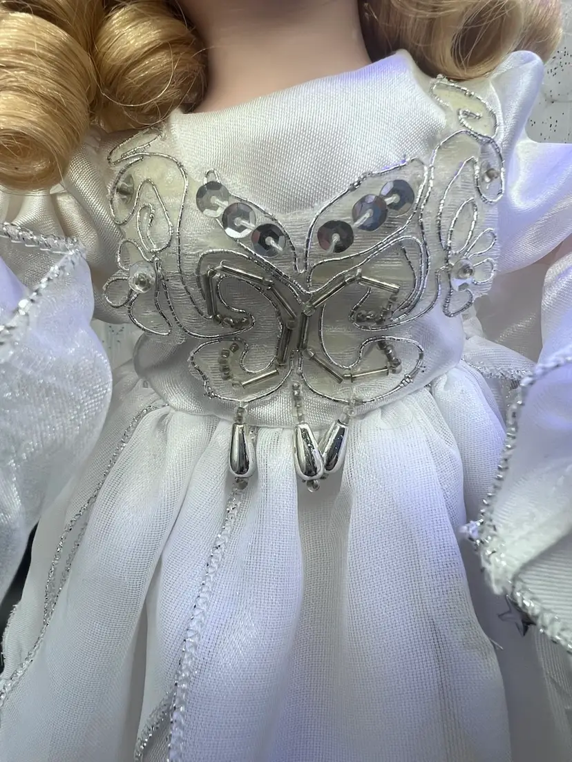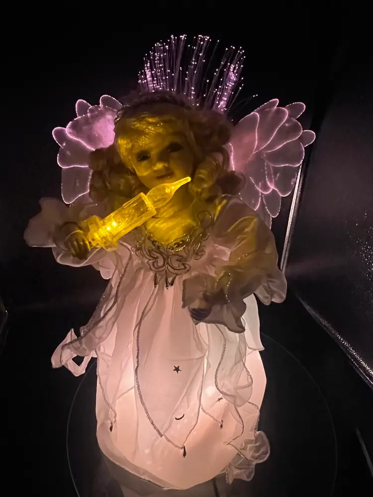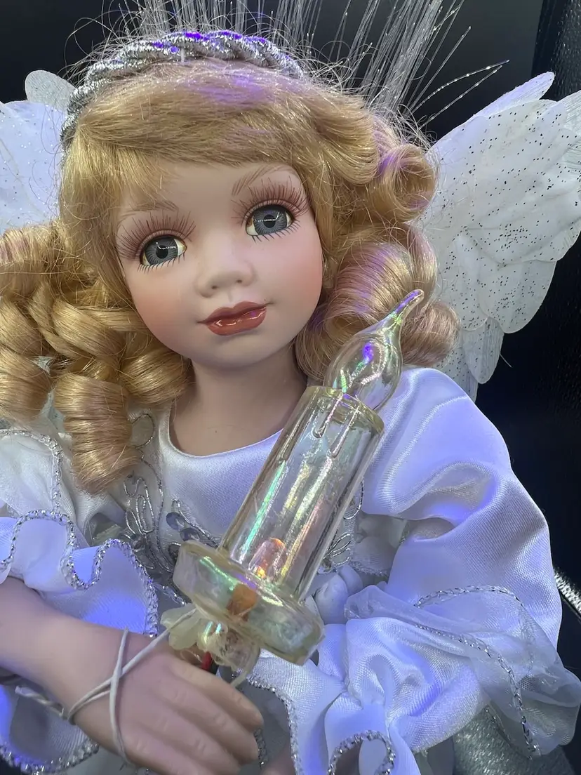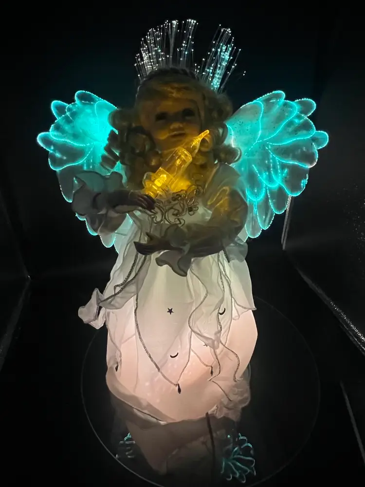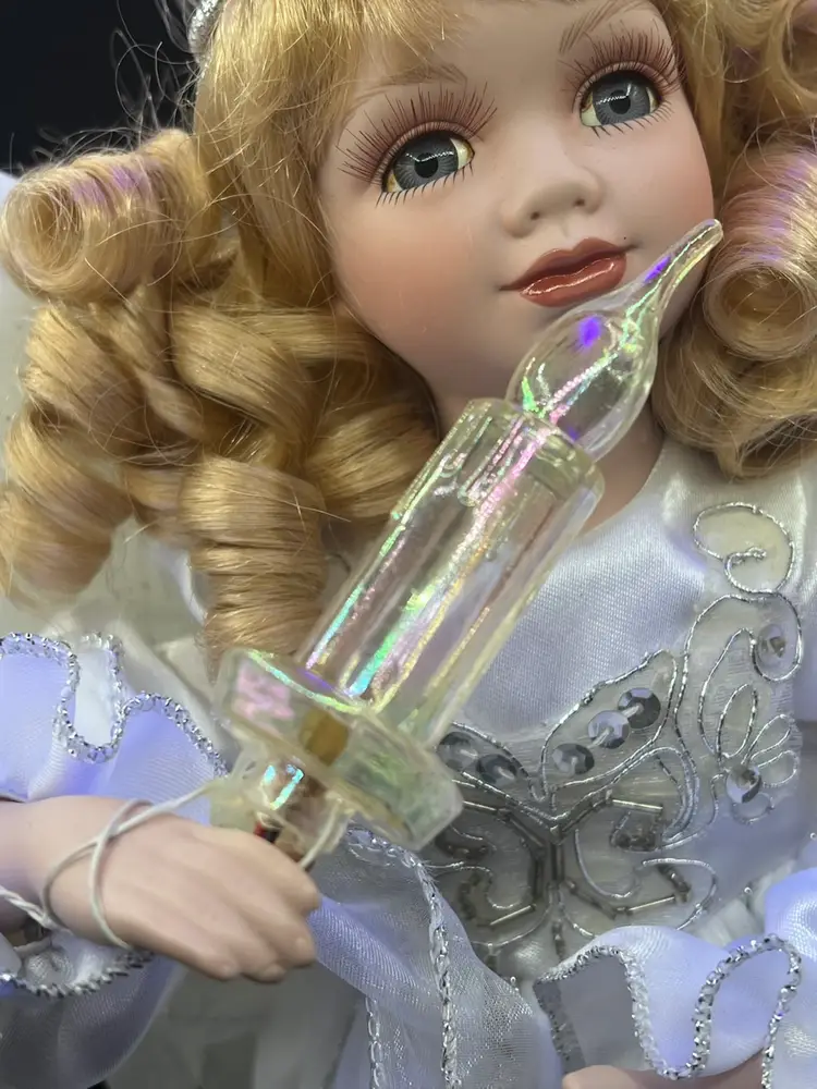 Key features include: It is a vintage item, with some models dating back to 1996. The figure is animated, with arms moving back and forth. It holds a huge lighted candelabra. The arms, legs, breastplate, and hare made of porcelain. Fiber optic Glittered wings Plug (WORKS) Embellished with stars and moon Please feel free to ask any questions Thank you for your time and interest Blessings, Bonnie & Darren :-)