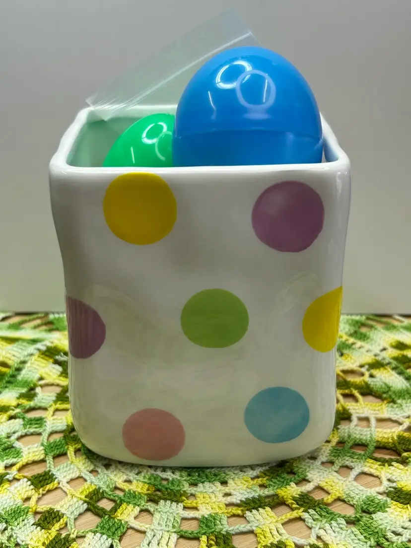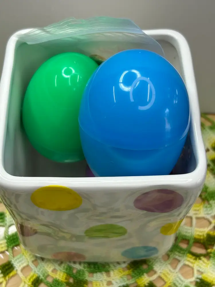 Square shape about 4” tall. Great Easter colors. Very clean, could be used for candy, eggs, or make a cute vignette with Easter decorations. BONUS: Plastic eggs are filled with assorted stickers, Easter erasers, and candy.