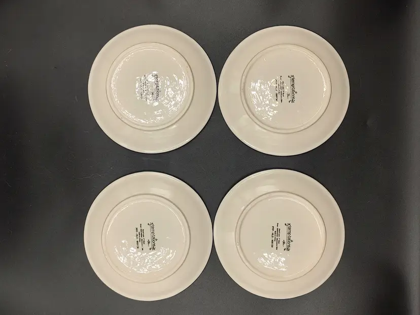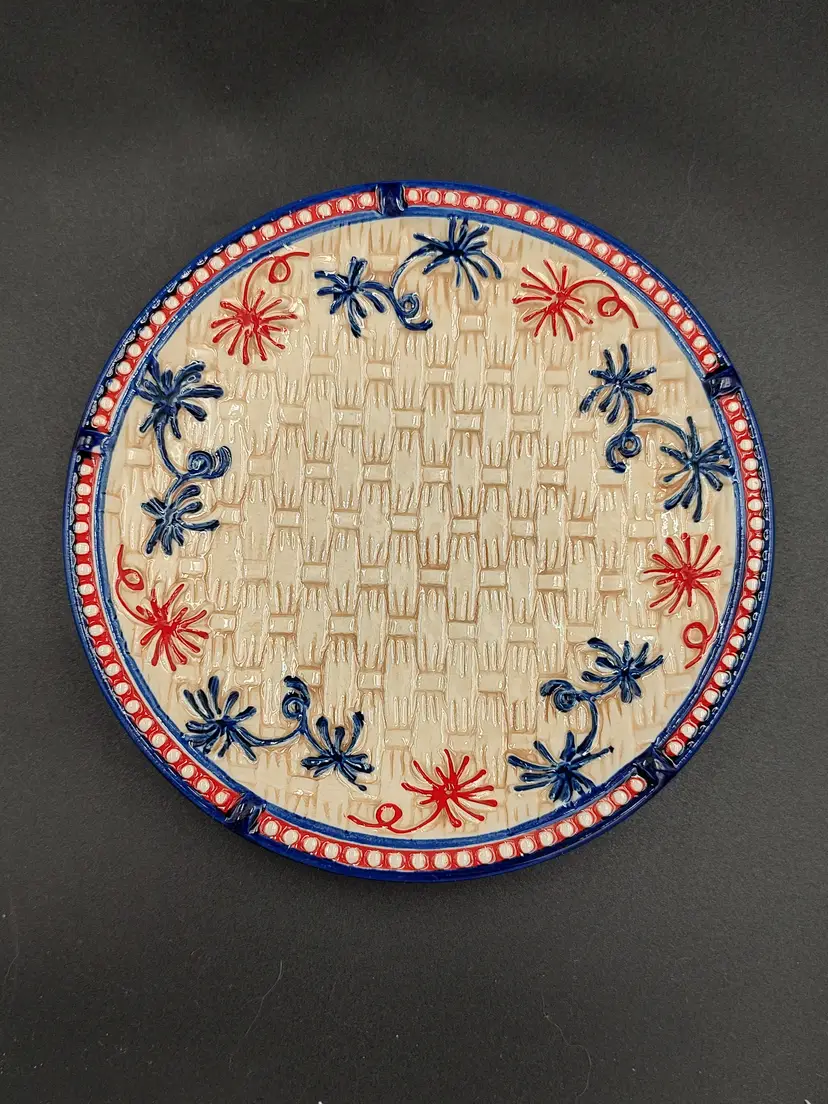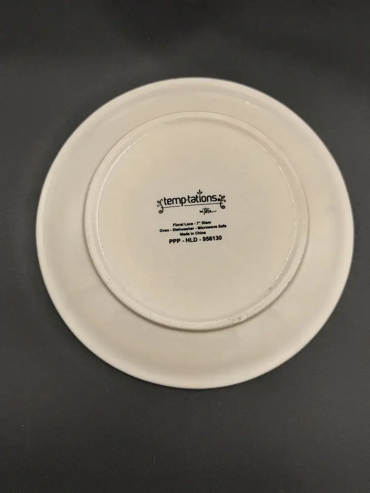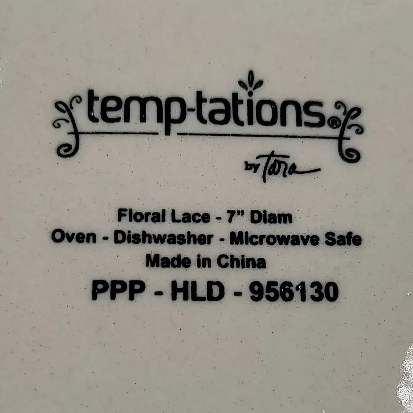 2011-2019Temptations By Tara Floral Lace Fire Works Design 7" Salad Plates basket weave beaded trim hand painted oven, microwave and dishwasher safe stoneware. Made in China