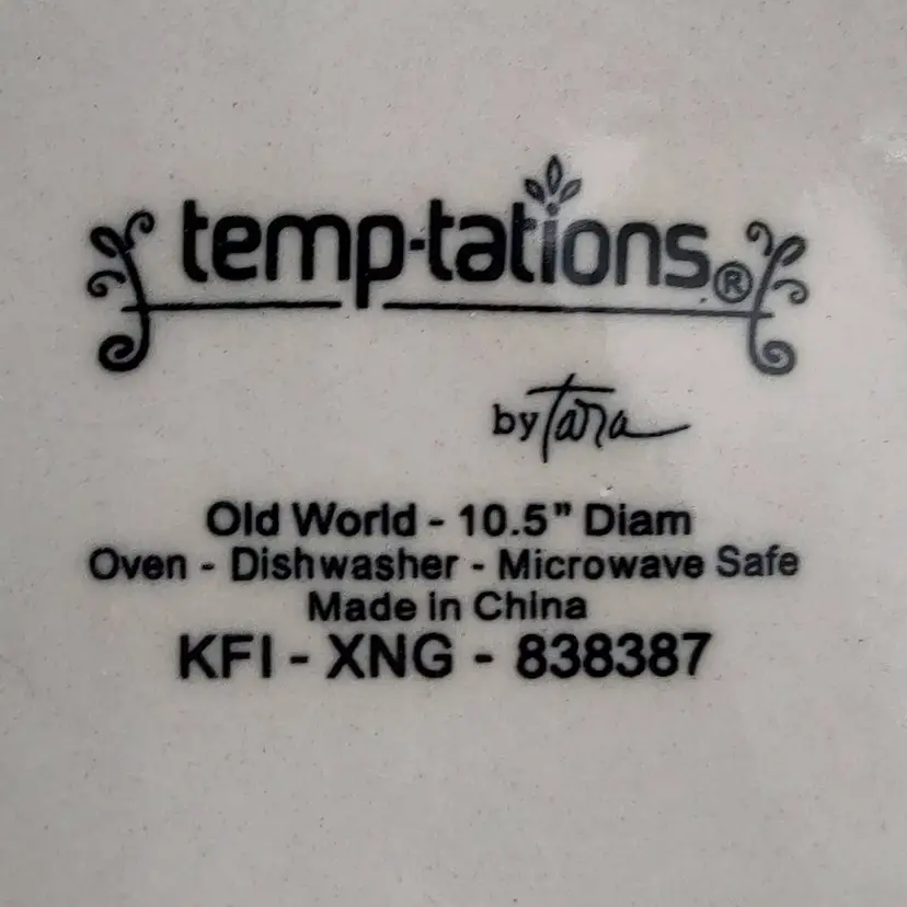 Temptations Old World 10.5" Plate. Oven, dishwasher and microwave safe. Made in China