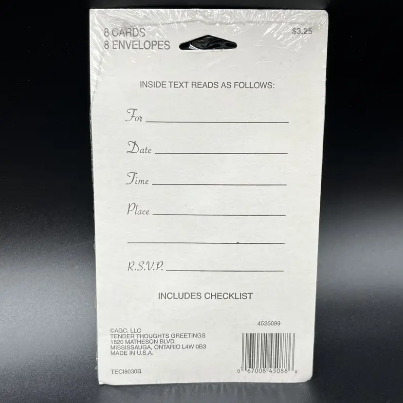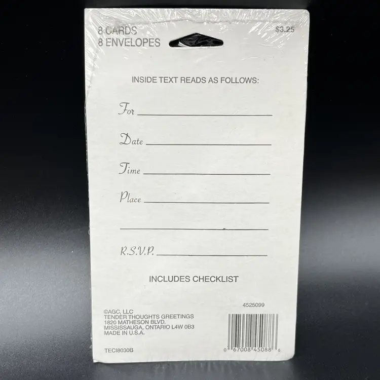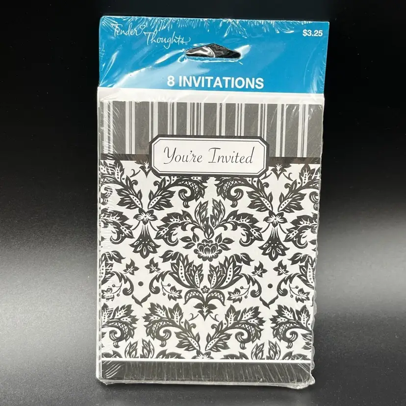 • Set of 8 invitations • Matching envelopes included • Elegant damask design • Space for date, time, and place • Includes checklist