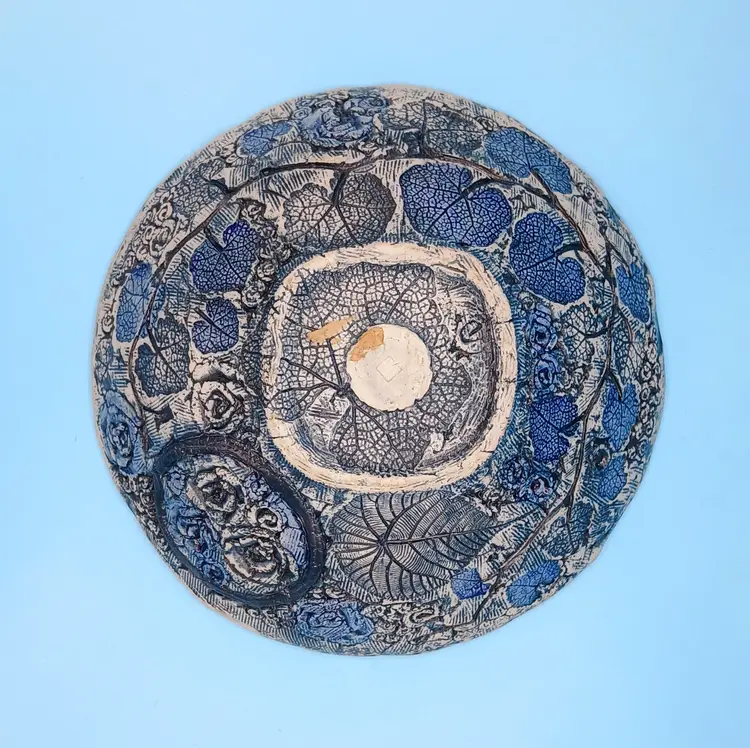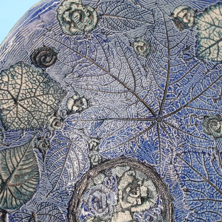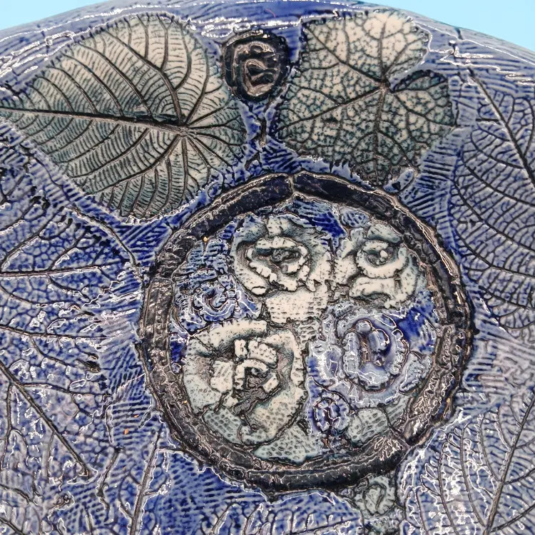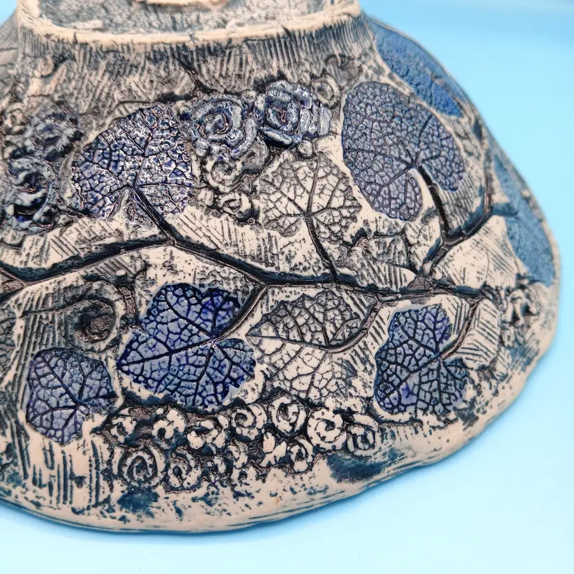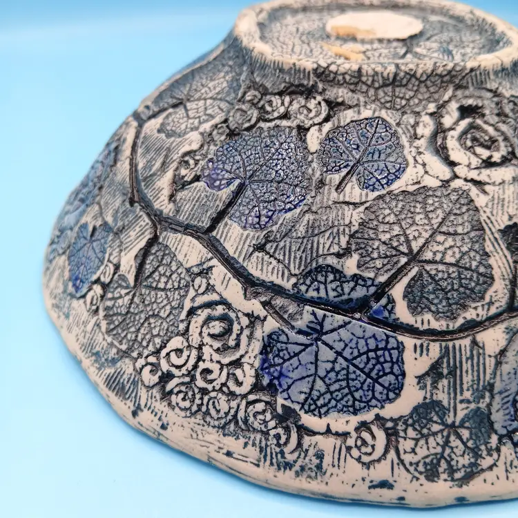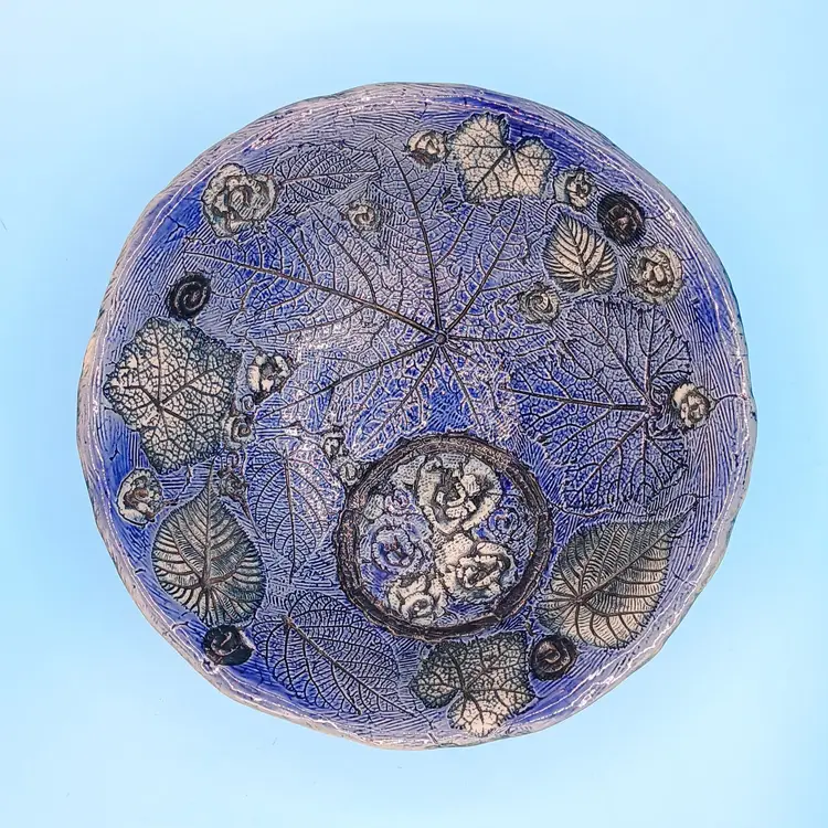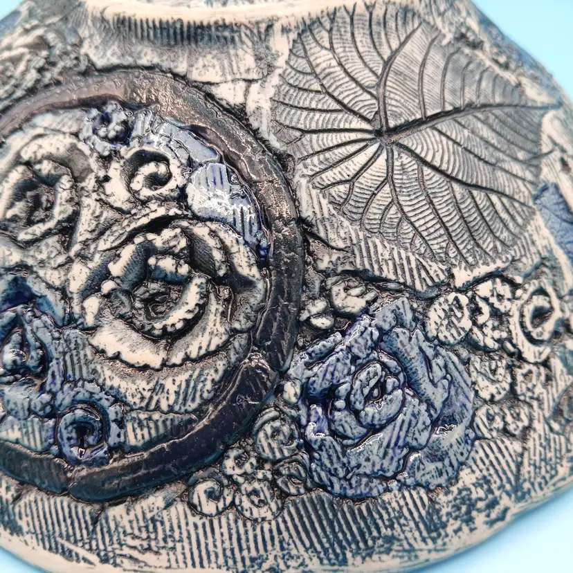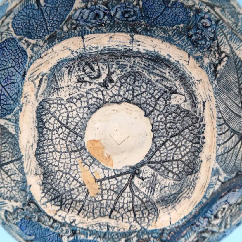 Stunning pottery bowl created by Tenmoku Pottery in Kuala Lumpur. When I found it, I was drawn in by all the rich detail and various botanical impressions. It's easy to get lost in the design. The color comes across like a denim blue with some black and gray. It measures over 8" in diameter and just under 3" high. The studio has suggested this unique bowl as a house warming gift. Thanks for looking!