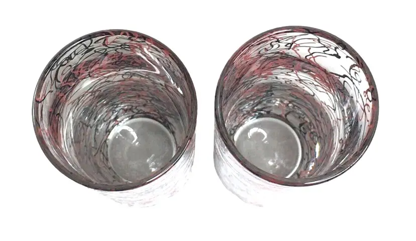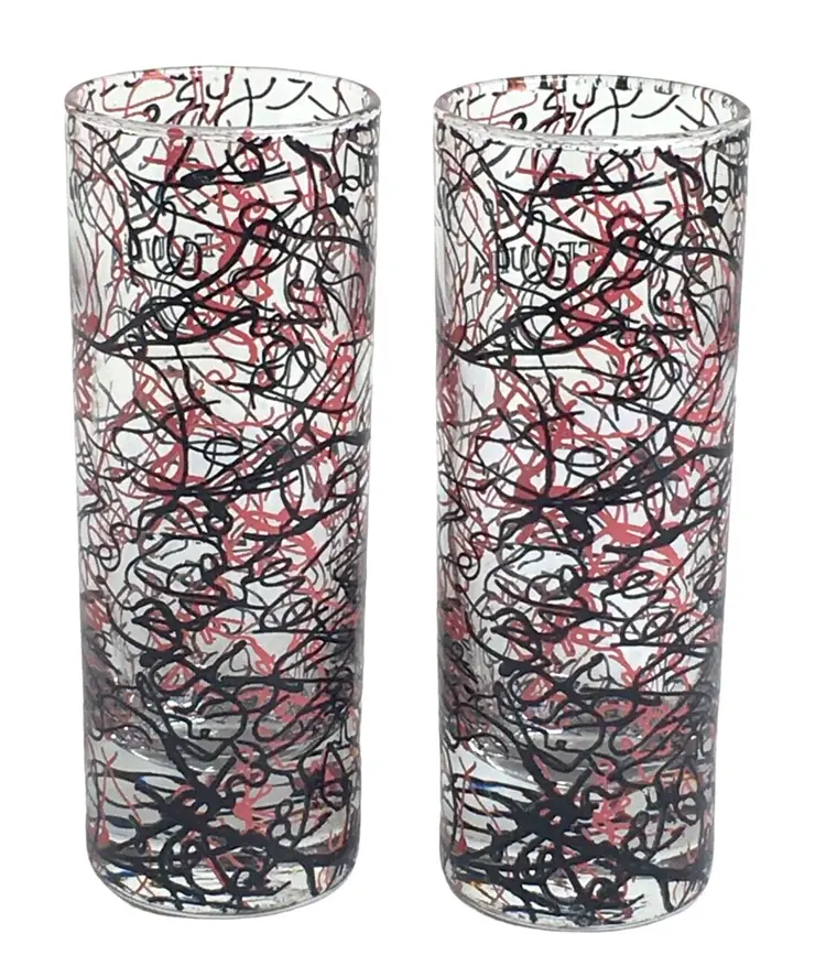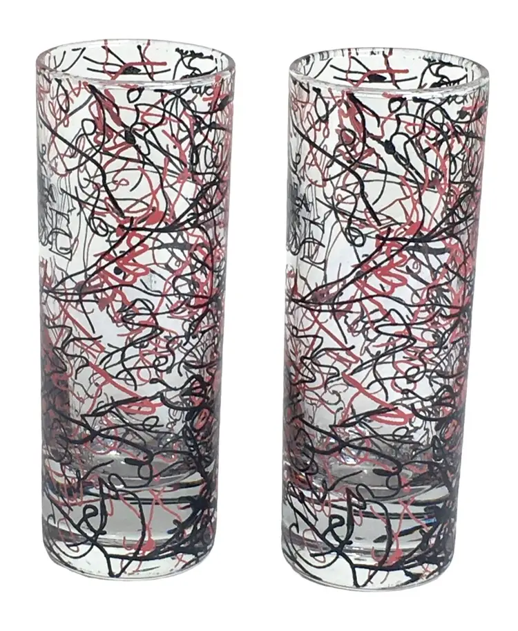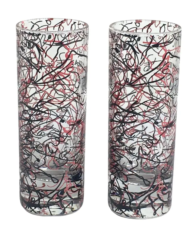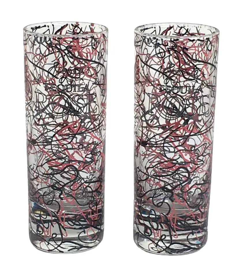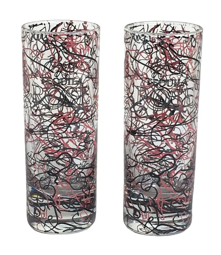 Number of Items in Set: 2 Design: Spaghetti String Glass Brand: Tequila Rose Type: Tall Shot Glasses Item Height: 4 1/8" Item Diameter: 1 1/2" Color: Pink, Black Beverage Type: Cold Material: Glass Set Includes: Two Shot Glasses Service For: 2 Glassware Type: Cocktail Glass
